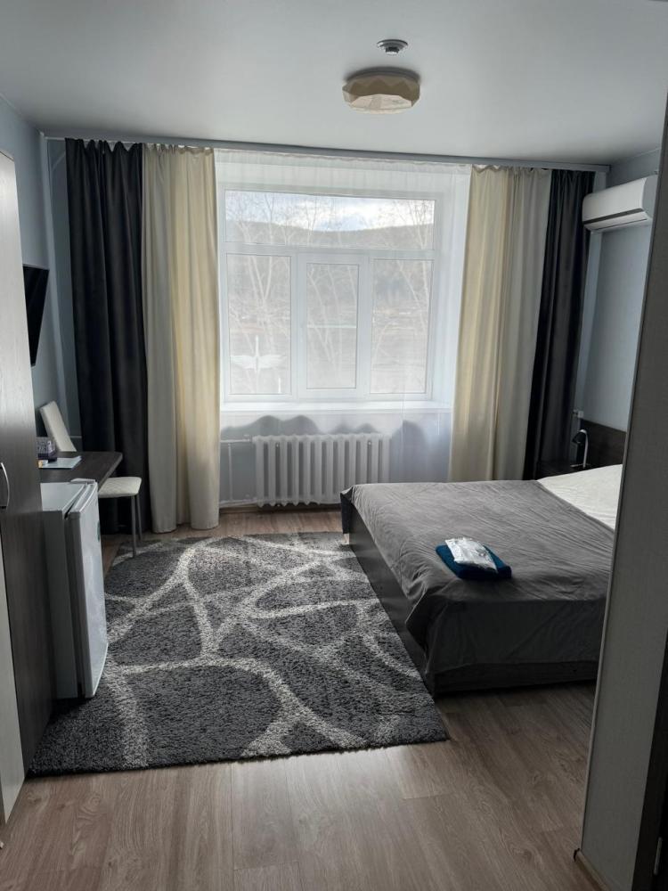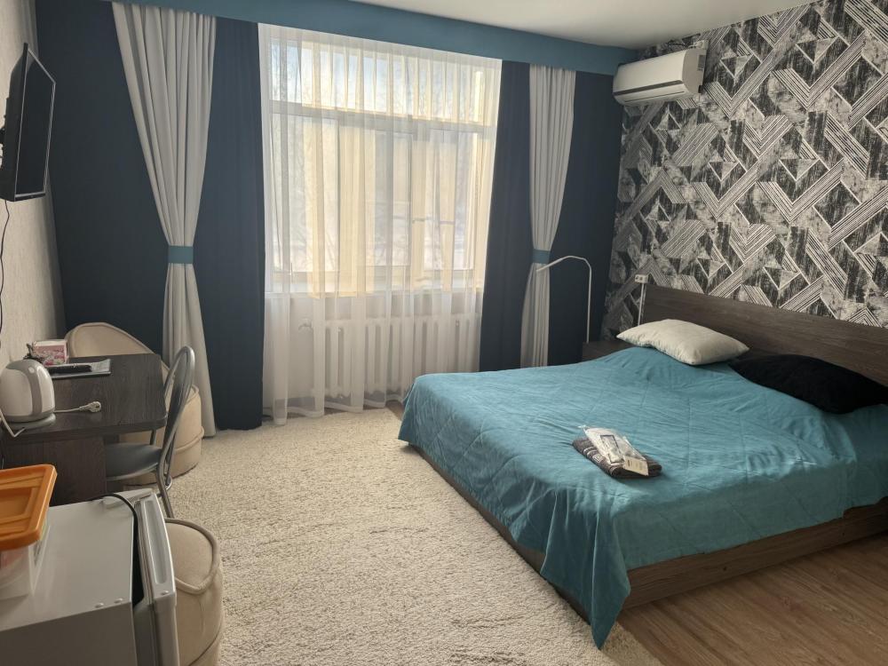 В номере: двуспальная кровать, телевизор, чайник, холодильник, рабочий стол.