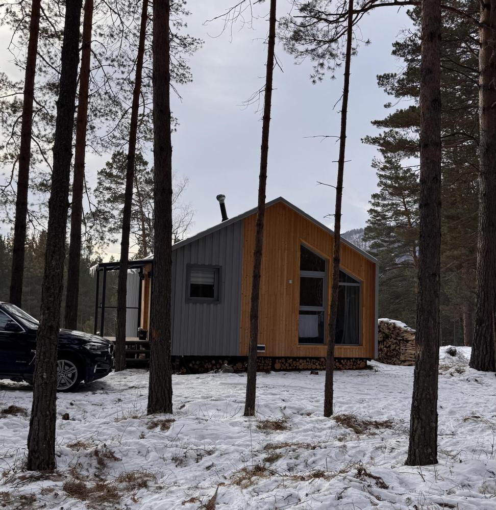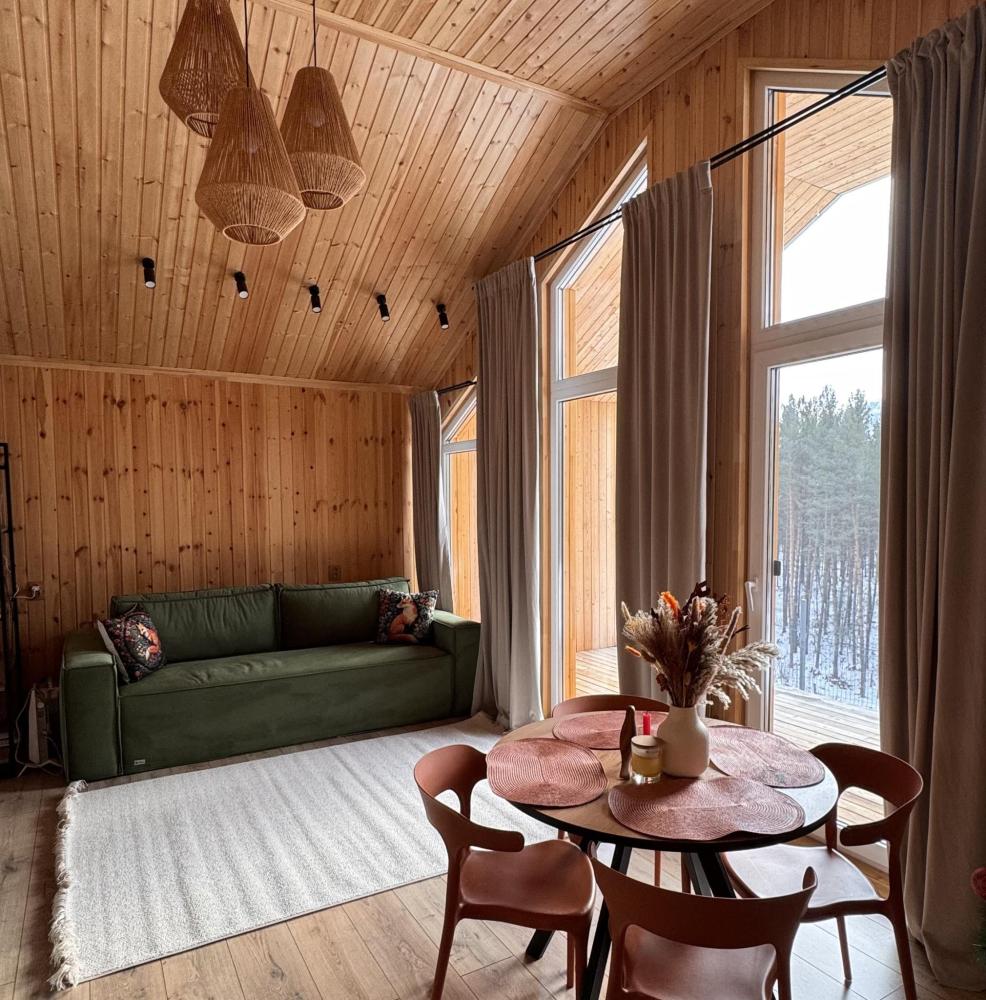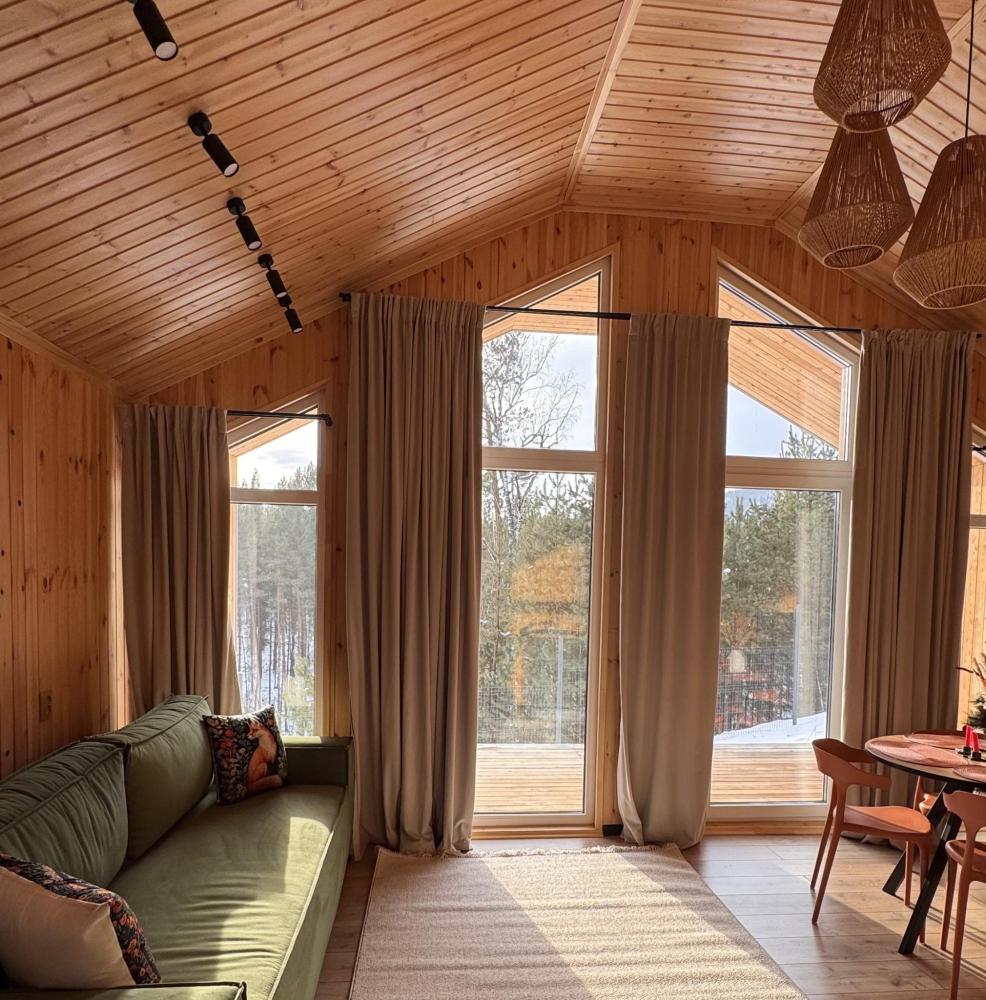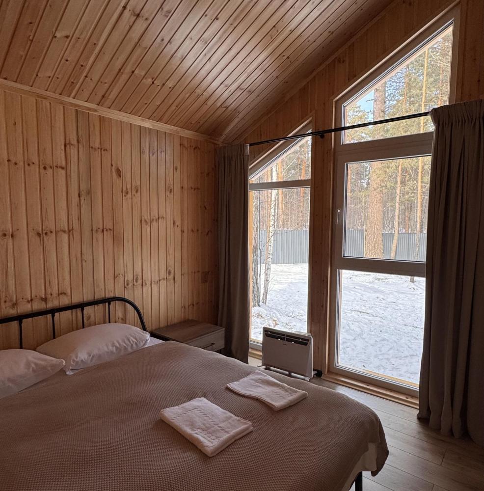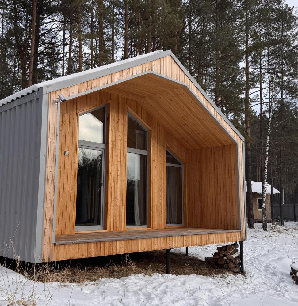 Дом состоит из 2 комнат и ванной комнаты. В спальне 2х спальная кровать. Прикроватные тумбочки. Шкаф. Панорамные окна с видом на внутренний двор с соснами. В гостиной раскладной диван.