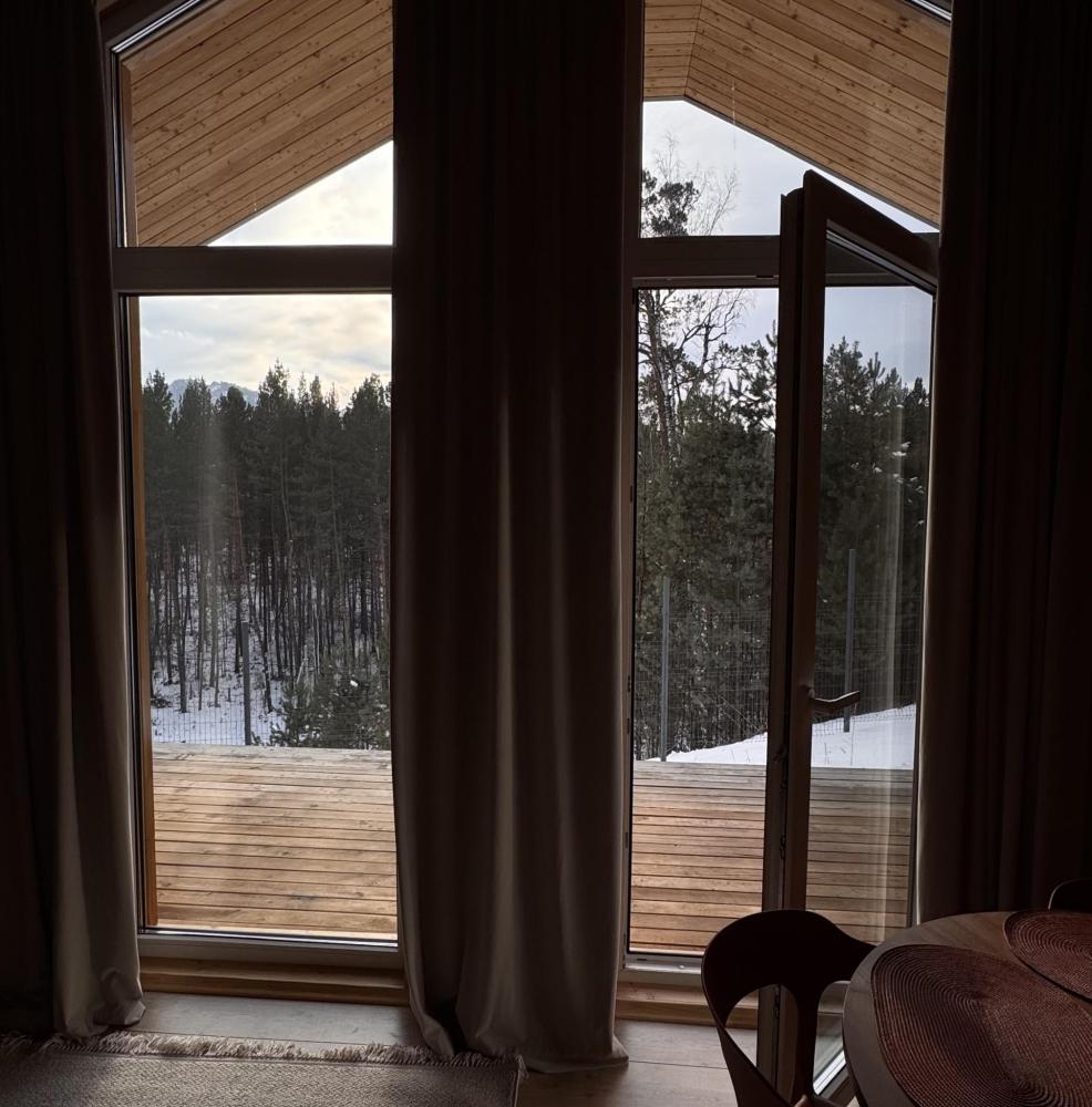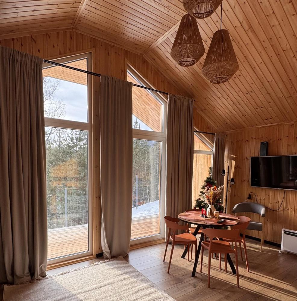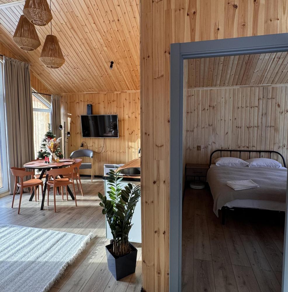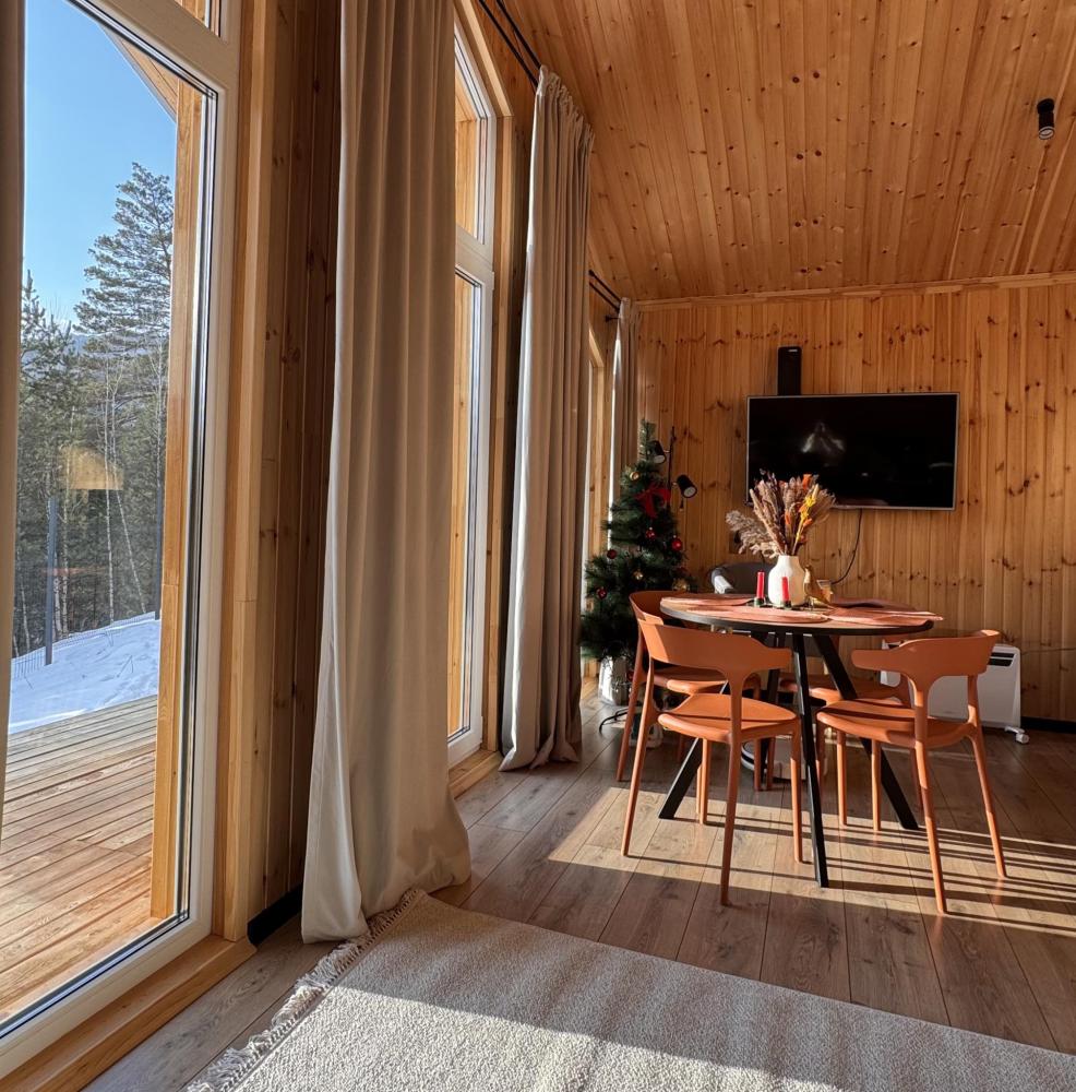 Дом состоит из 2 комнат и ванной комнаты. В спальне 2х спальная кровать. Прикроватные тумбочки. Шкаф. Панорамные окна с видом на внутренний двор с соснами. В гостиной раскладной диван.