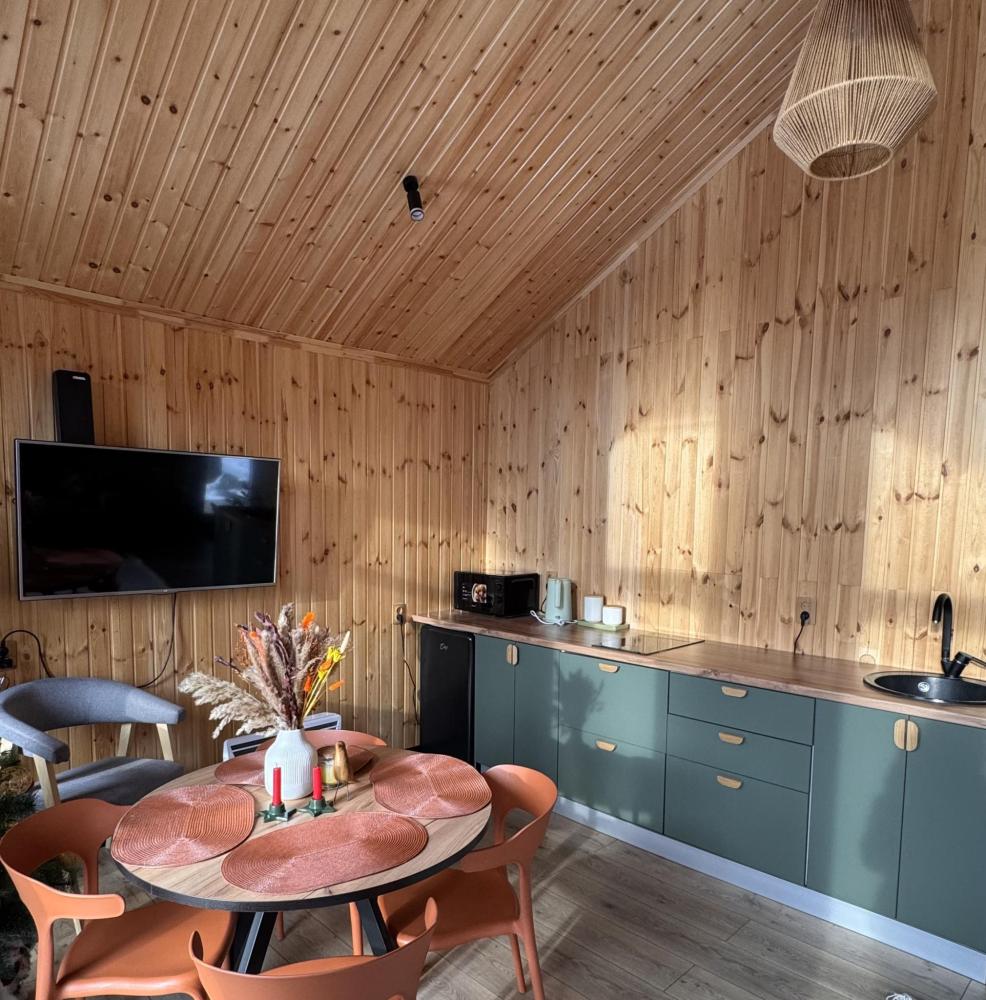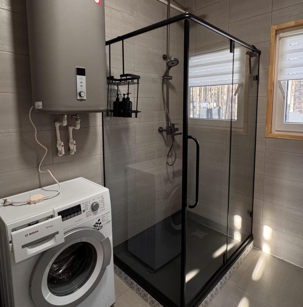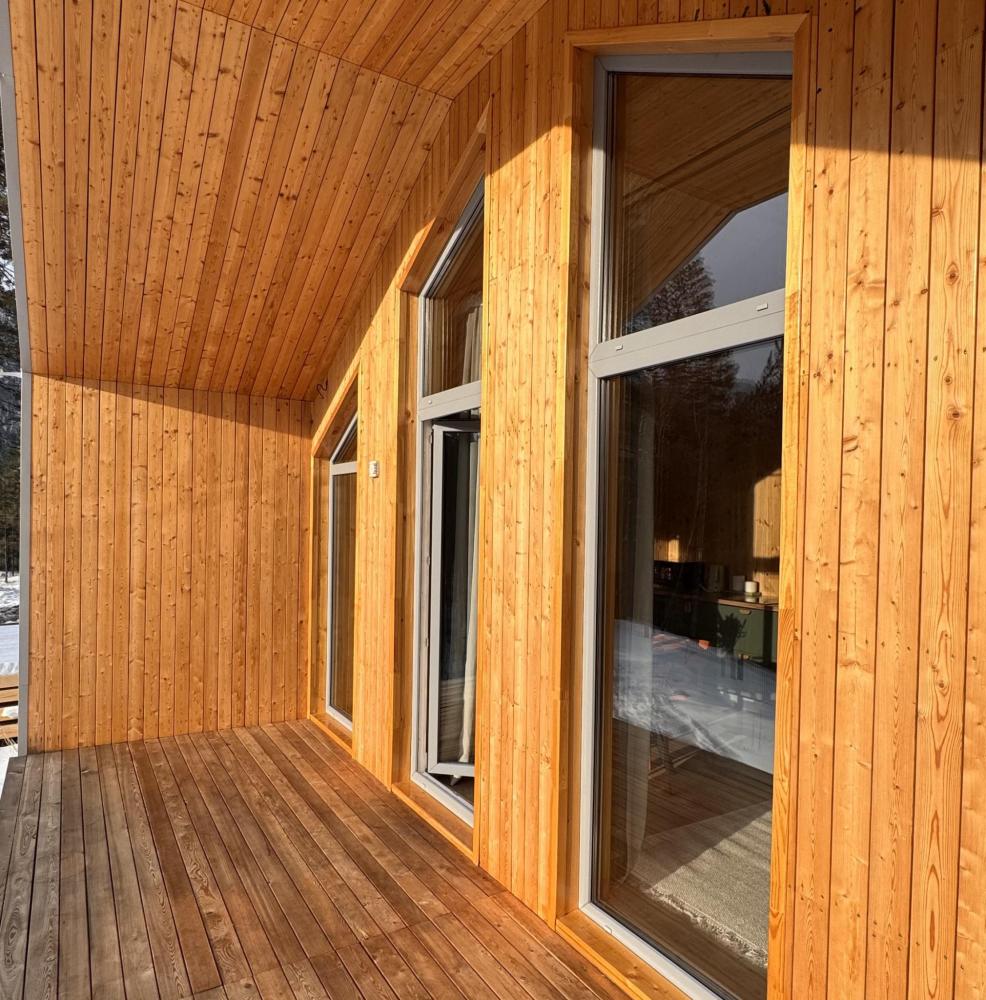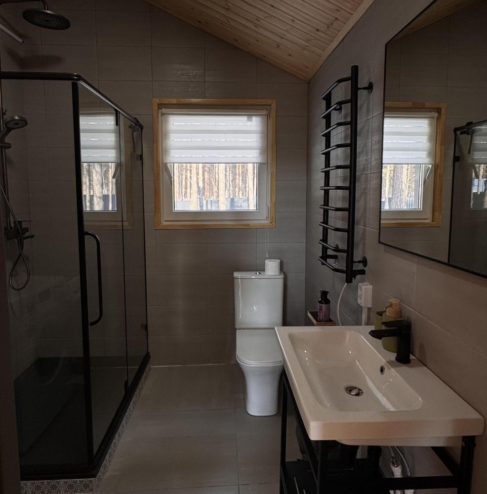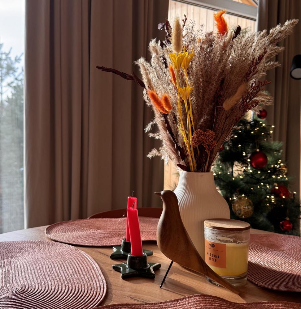 Дом состоит из 2 комнат и ванной комнаты. В спальне 2х спальная кровать. Прикроватные тумбочки. Шкаф. Панорамные окна с видом на внутренний двор с соснами. В гостиной раскладной диван.