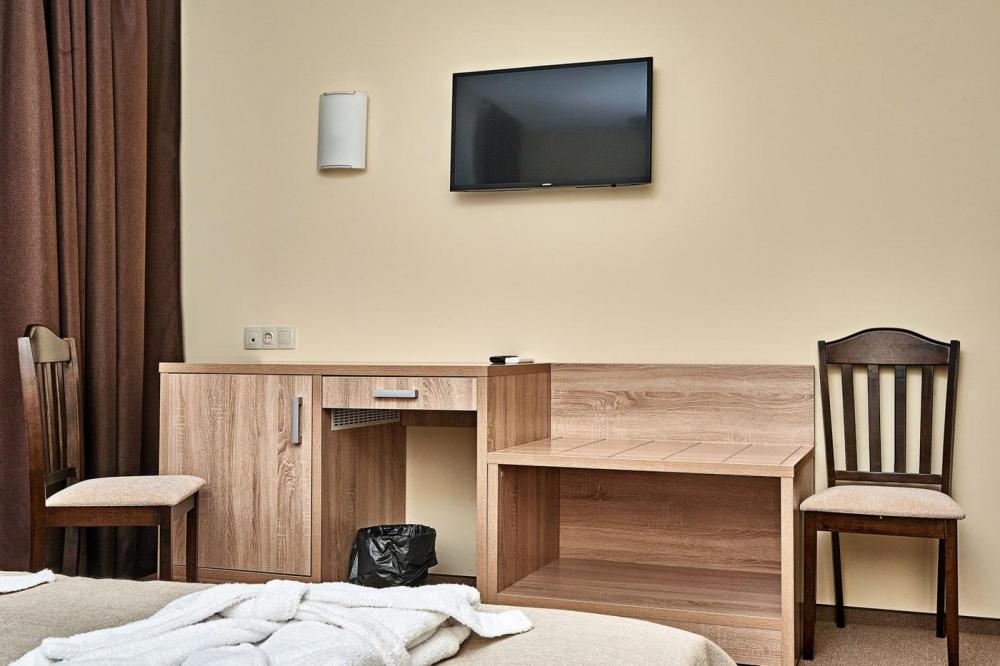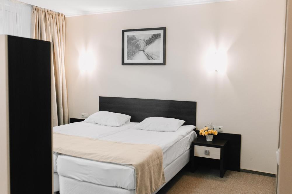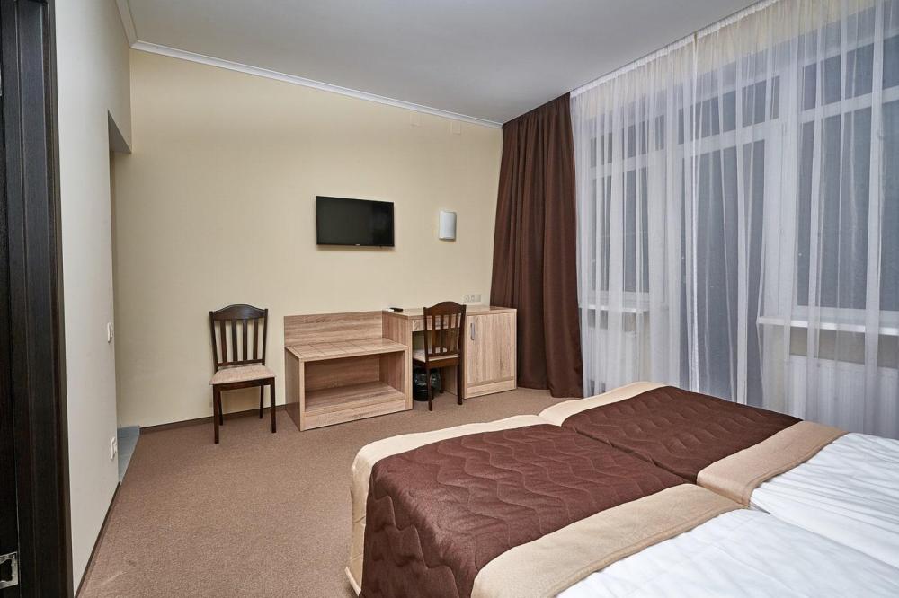 Однокомнатный номер с двумя односпальными кроватями, санузлом с душевой кабиной, балконом. Номер оборудован кондиционером, мини-холодильник, цифровым ТВ. 2 основных места. Wi-Fi в номерах.