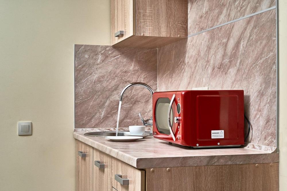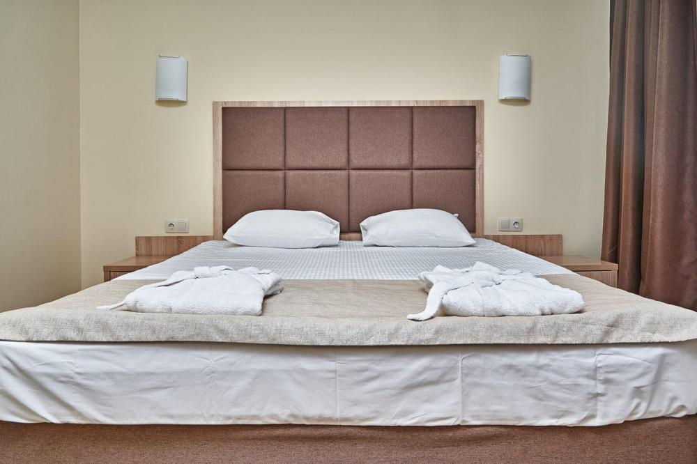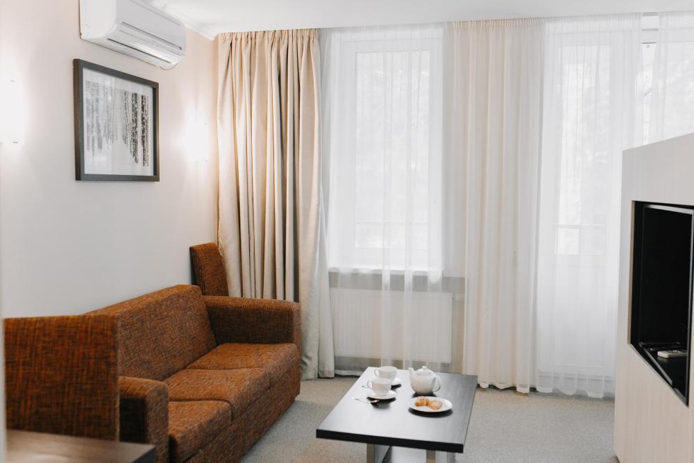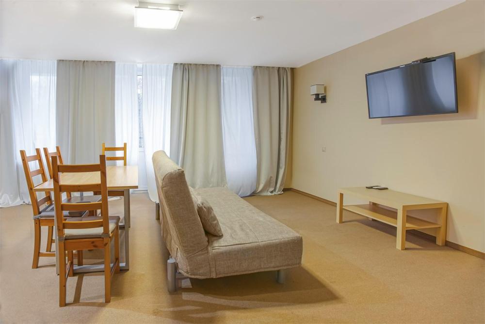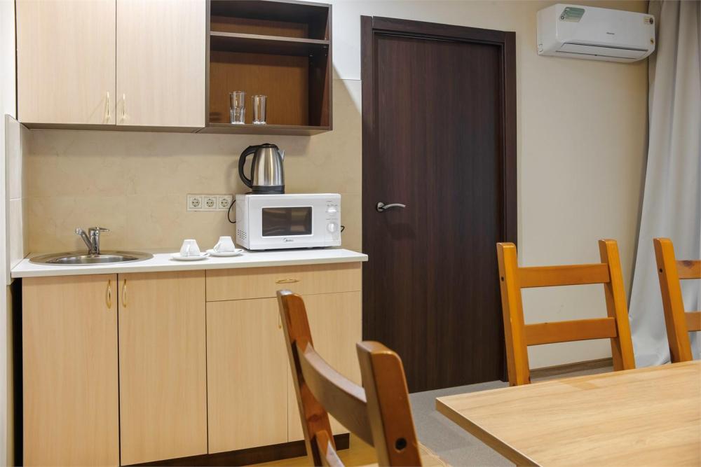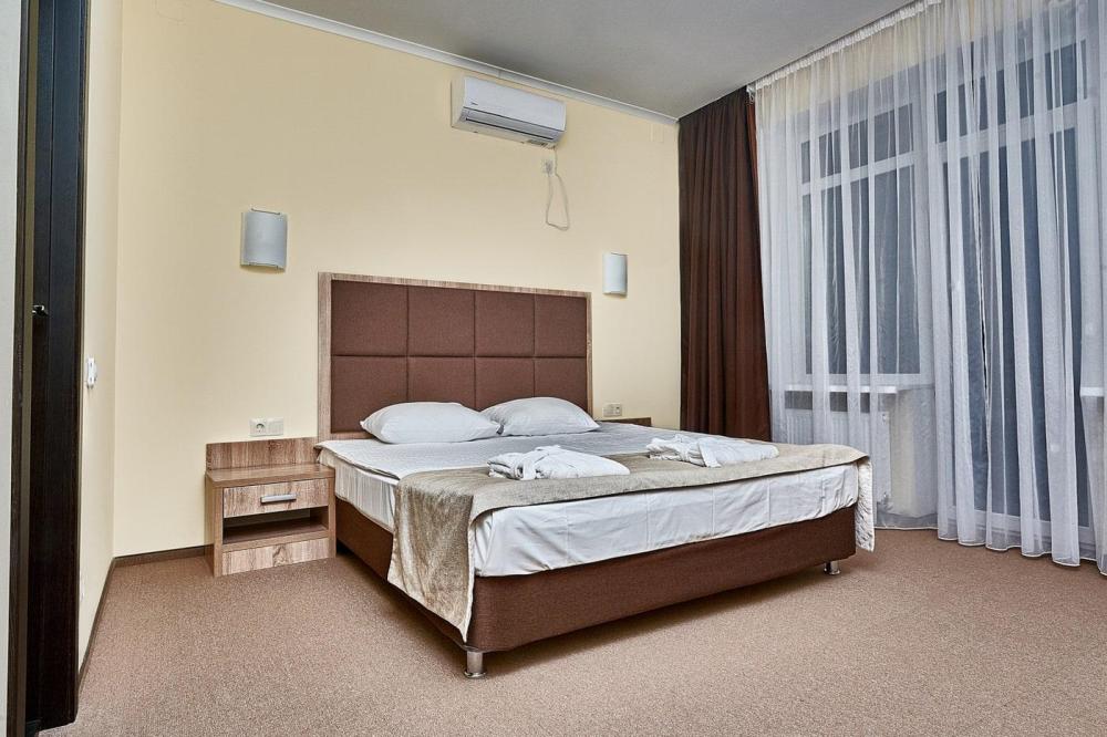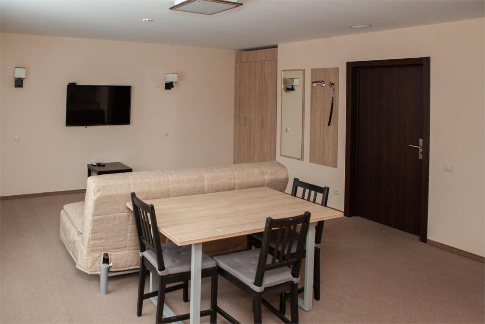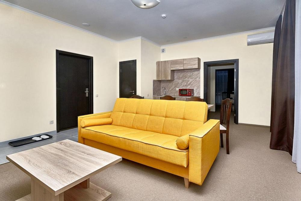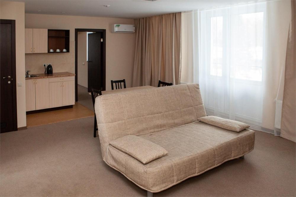 Двухкомнатный номер – спальня и гостиная с двумя санузлами, один из которых оборудован ванной. В гостиной мини-кухня, обеденная зона, мягкая зона отдыха с раскладывающимся двуспальным диваном. Номер оборудован кондиционером, цифровым ТВ. 2 основных места, 2 дополнительных на раскладном диване. Wi-Fi в номерах .