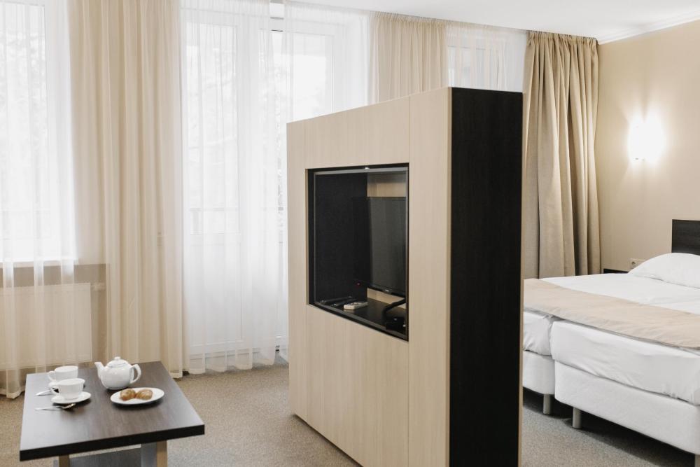 Полуторакомнатный номер с двуспальной кроватью, санузлом с душевой кабиной, балконом. Номер разделен на спальную и гостиную зоны. В гостиной двуспальный диван. Номер оборудован сплит-системой, мини-холодильником, кабельным ТВ. Два основных места и два дополнительных на раскладном диване. Wi-Fi .