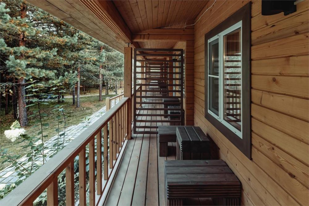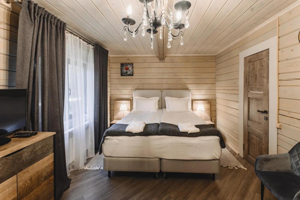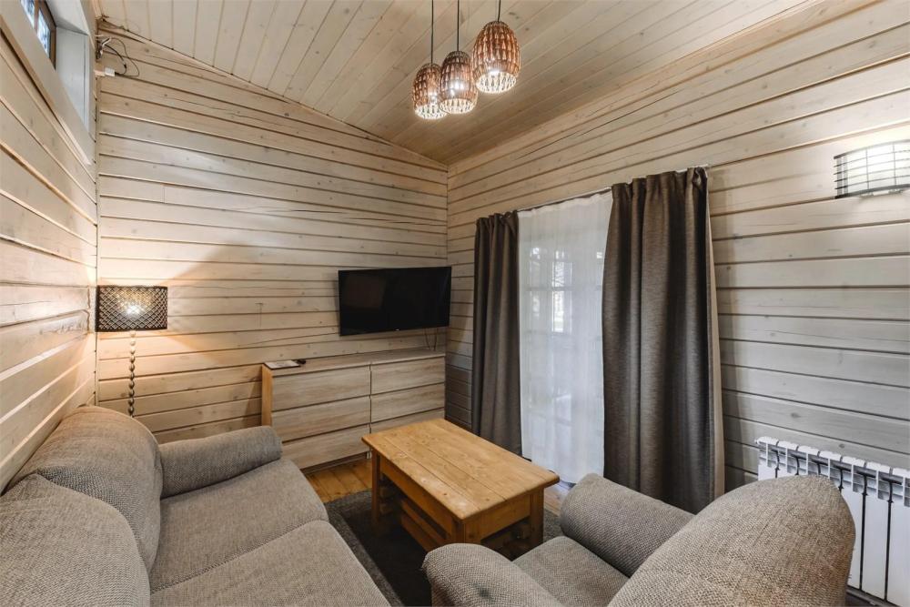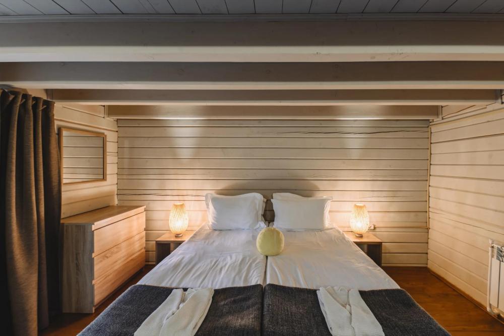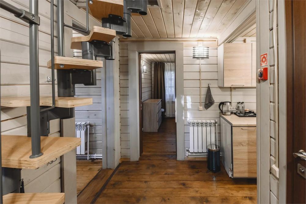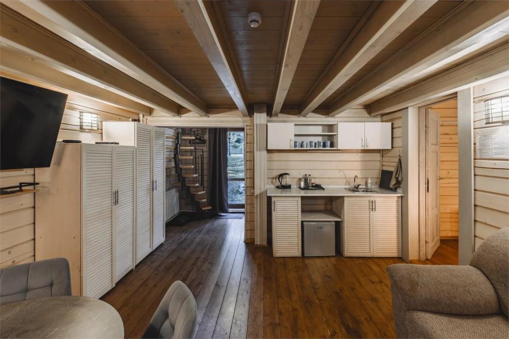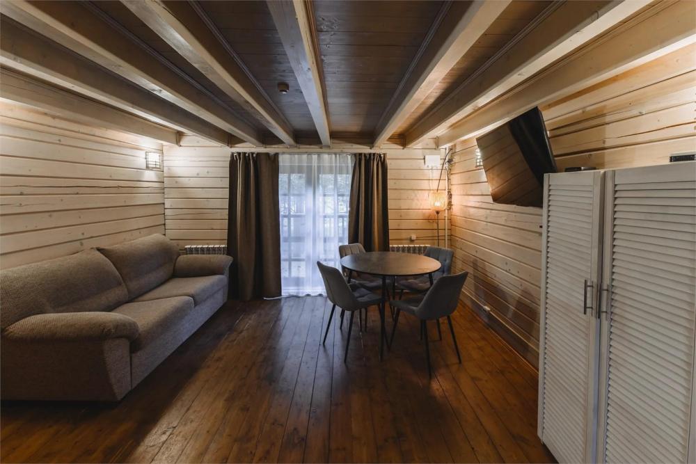 Просторный номер площадью 67 кв.м. В этом двухэтажном номере с летней террасой созданы все условия для полноценного комфортного отдыха. В номере: телевизор, мини-кухня, мини-холодильник, чайник, чайный набор, ортопедические матрасы, одноразовые косметические принадлежности, Wi-Fi.