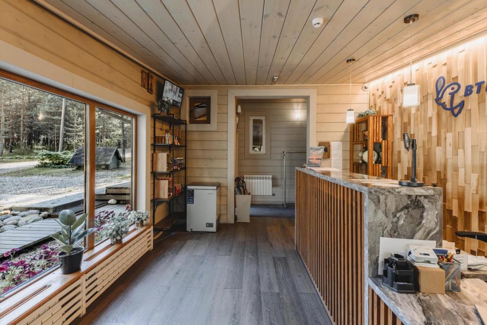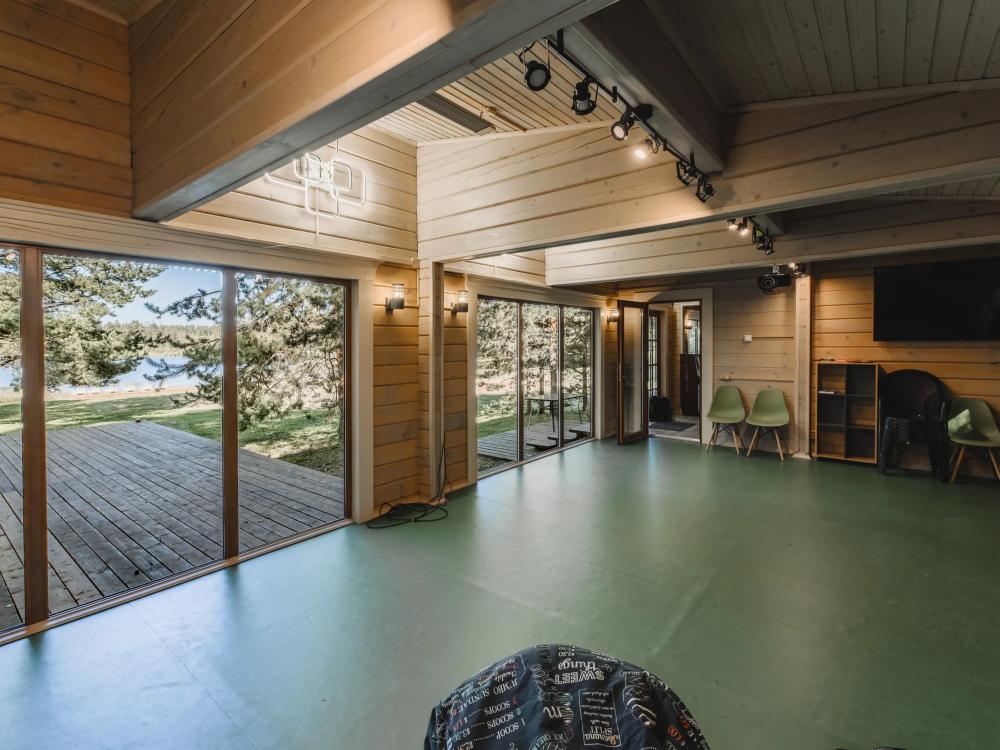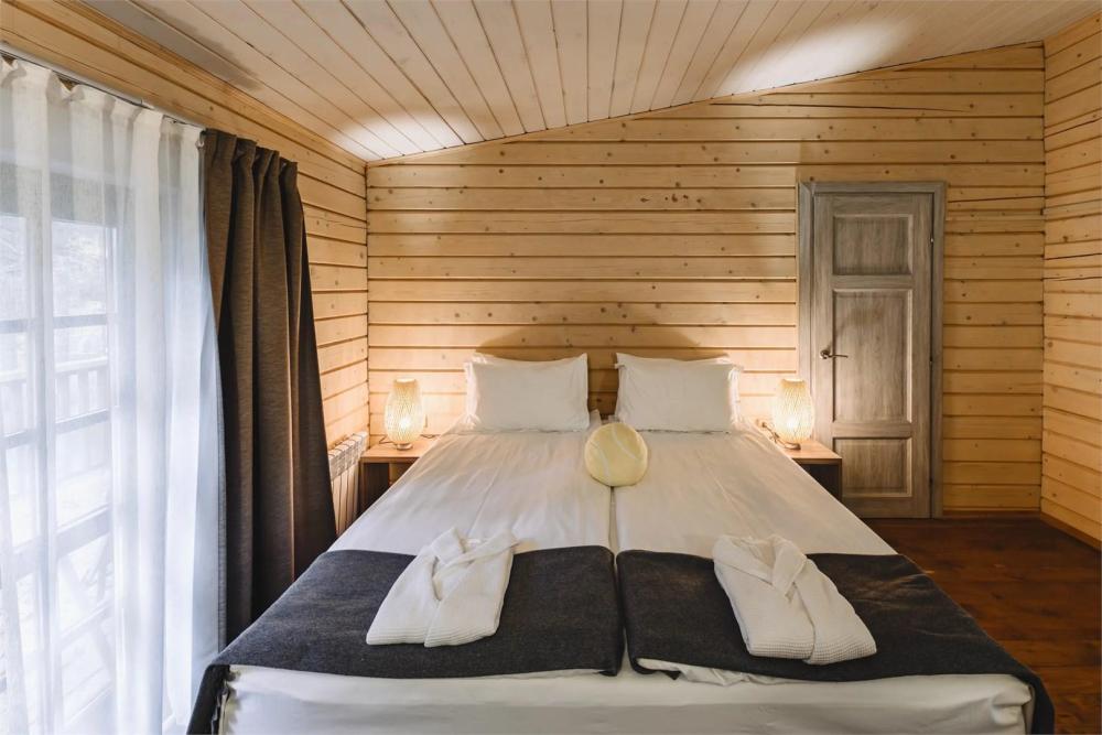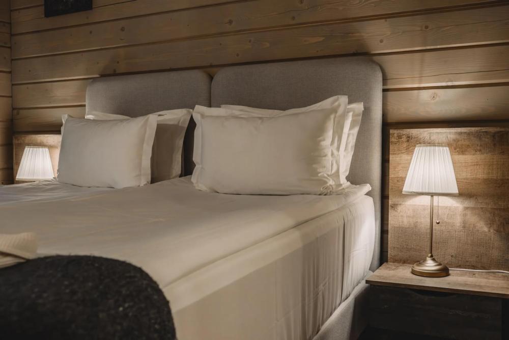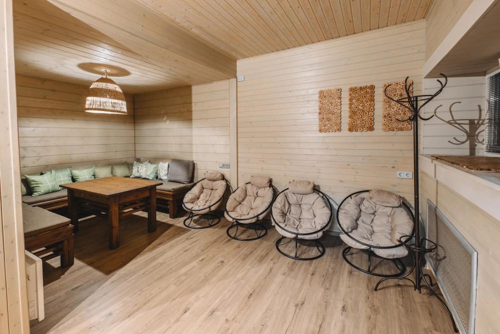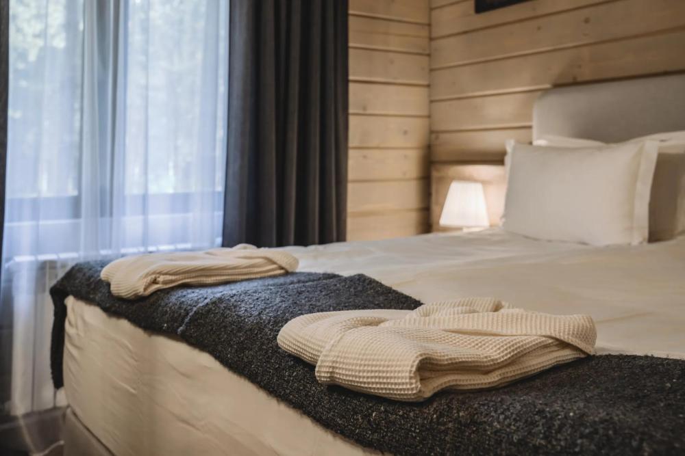 Просторный номер площадью 67 кв.м. В этом двухэтажном номере с летней террасой созданы все условия для полноценного комфортного отдыха. В номере: телевизор, мини-кухня, мини-холодильник, чайник, чайный набор, ортопедические матрасы, одноразовые косметические принадлежности, Wi-Fi.