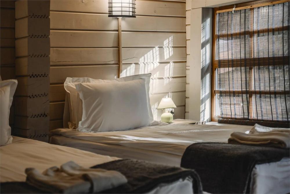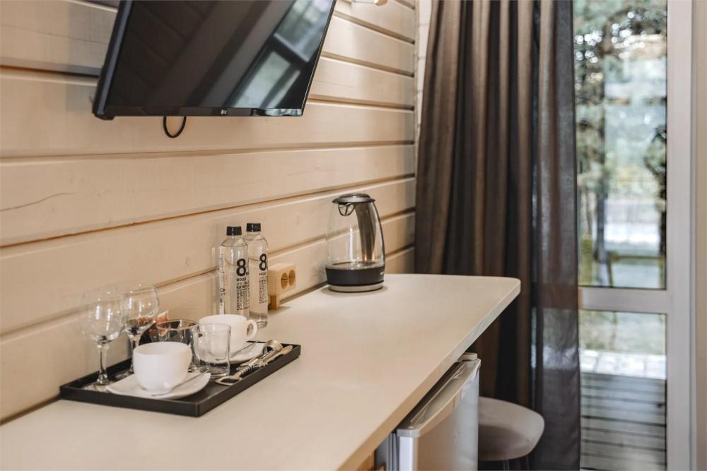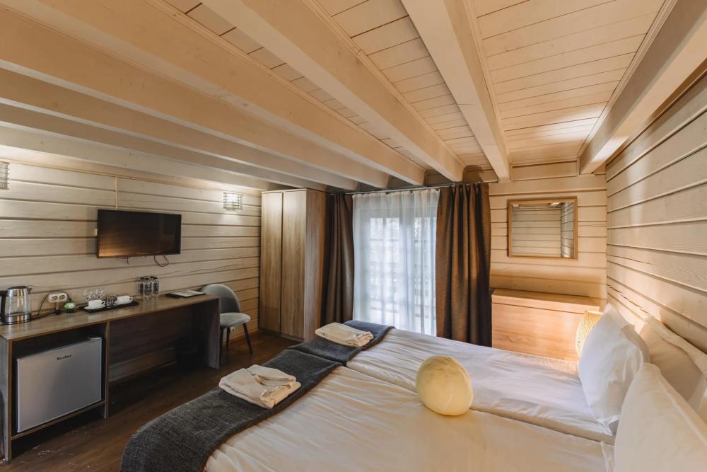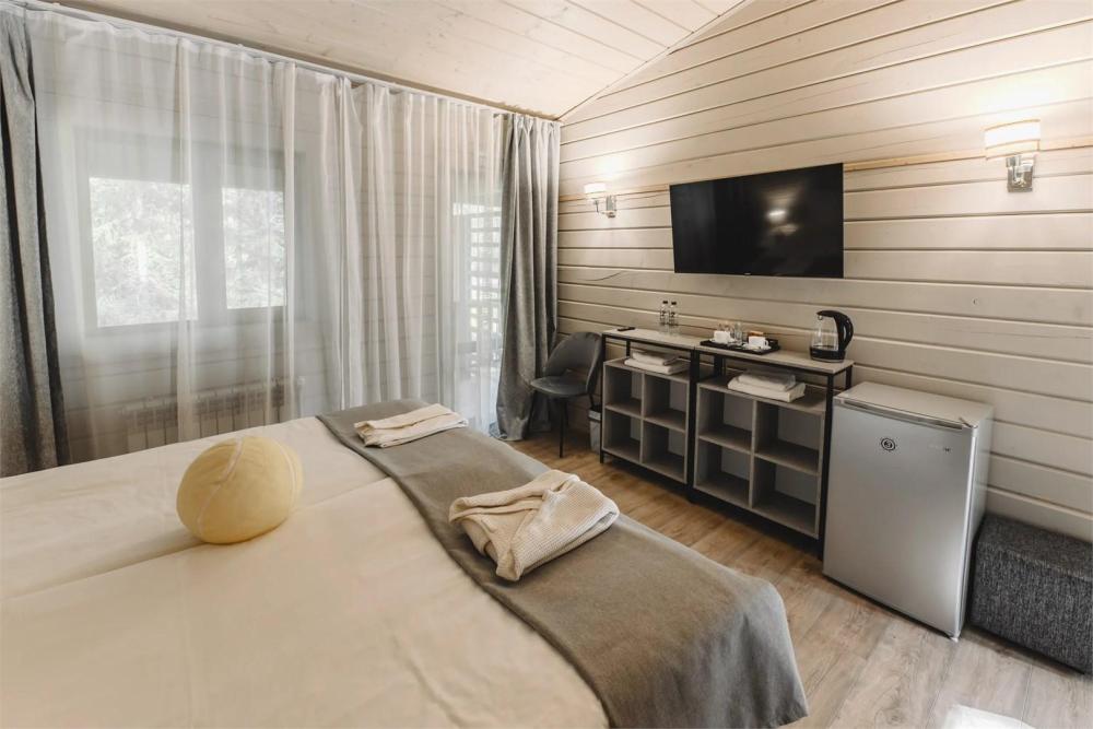 Одноэтажный двухместный номер площадью 23 кв.м. с уютной террасой. В номере: телевизор, мини-холодильник, чайный набор, ортопедические матрасы, одноразовые косметические принадлежности, собственная ванная комната.