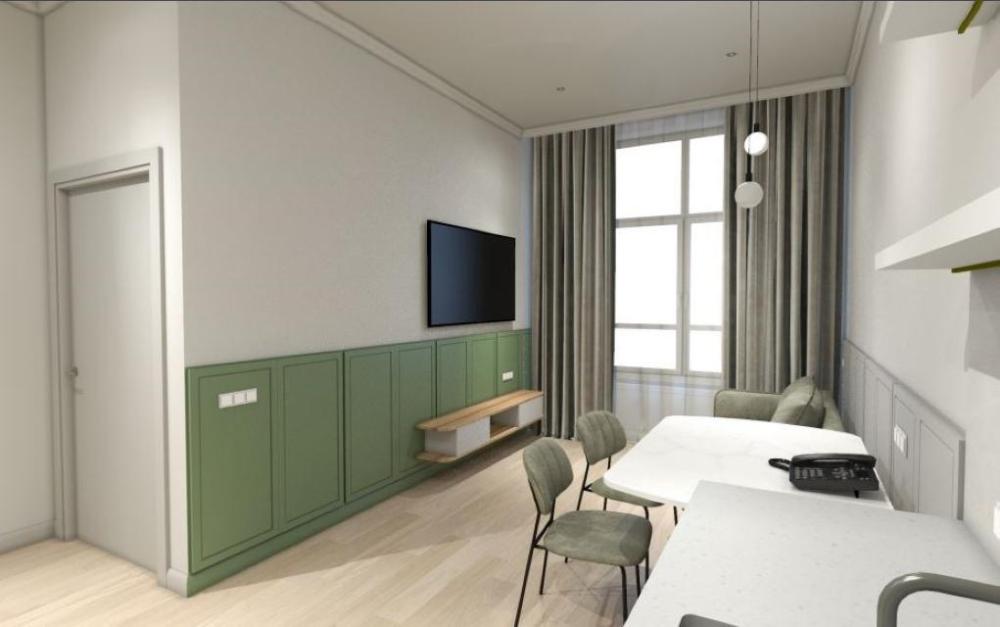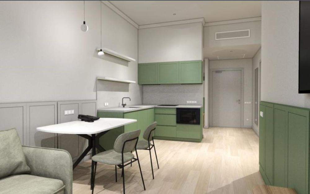 Современная студия с двуcпальной кроватью. К услугам гостей уютная спальня, объединённая с гостиной, и кухня. Для комфортного отдыха предусмотрена посудомоечная машина, мини-холодильник, халаты и тапочки.
