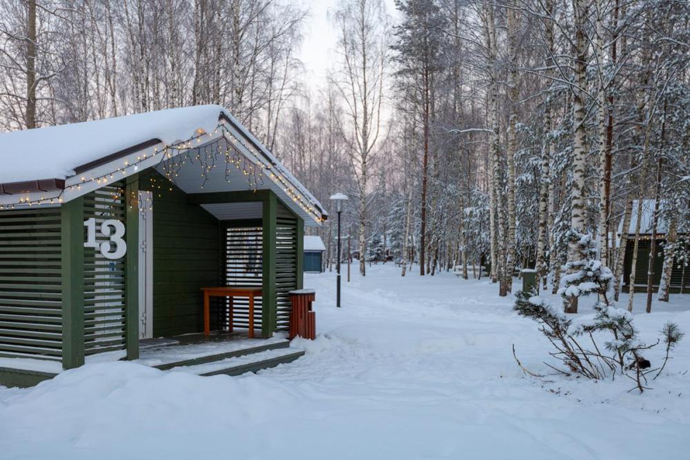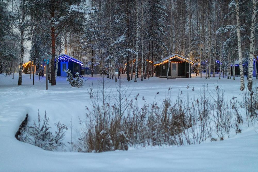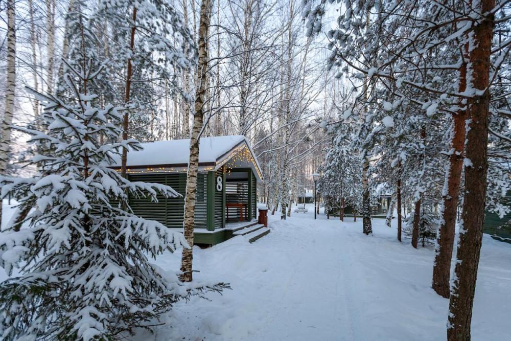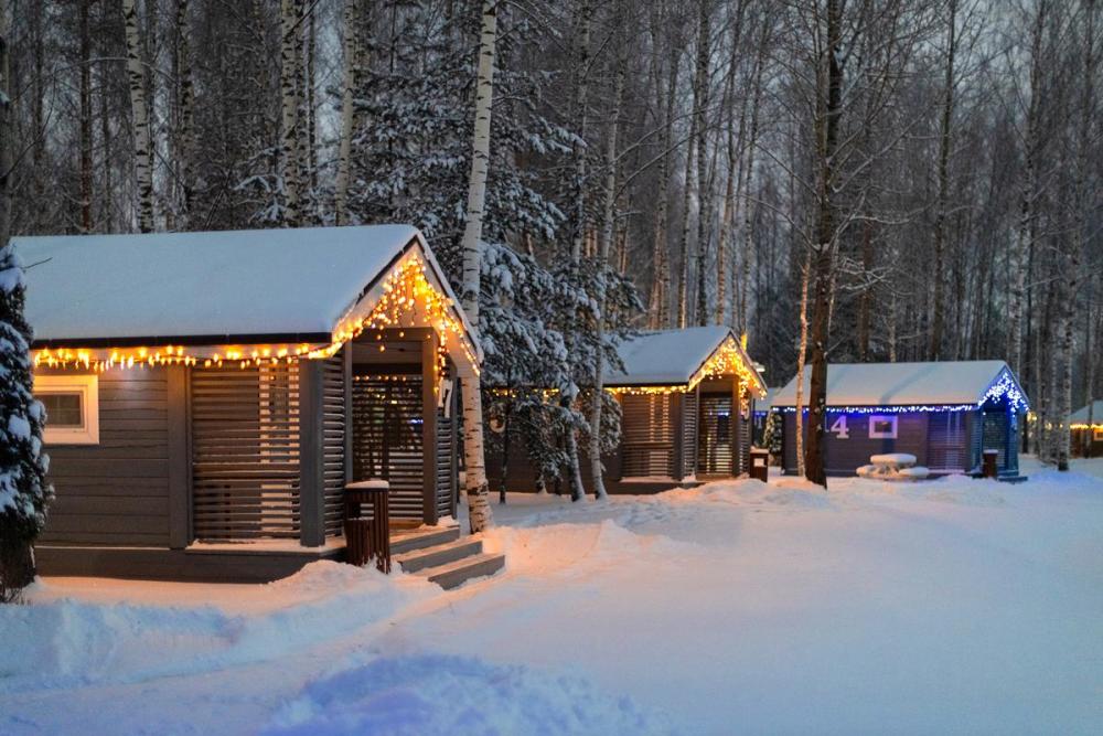 каждого из них открывается живописный и умиротворяющий вид на лесное озеро. Каждый домик рассчитан на проживание четырёх человек. Уют создаётся за счёт интерьера, оформленного в скандинавском стиле: двухъярусная кровать, состоящая из двух полуторных кроватей на первом ярусе, и одной большой двуспальной кровати - на втором; шкаф; терраса. Рядом с каждым домиком есть деревянная обеденная группа. За дополнительную плату предоставляется холодильник . Для отдыхающих на территории есть комфортные тёплые санузлы с душевыми, общая кухня и барбекю-площадка, оборудованная всем необходимым.