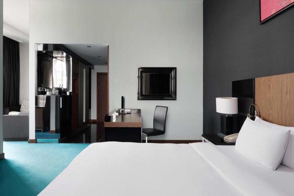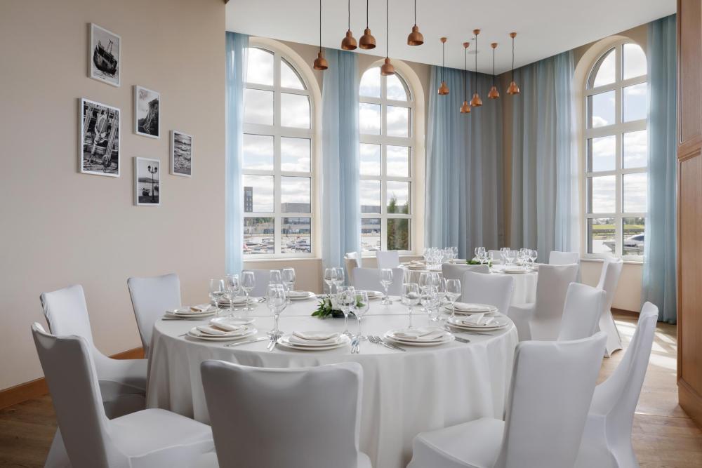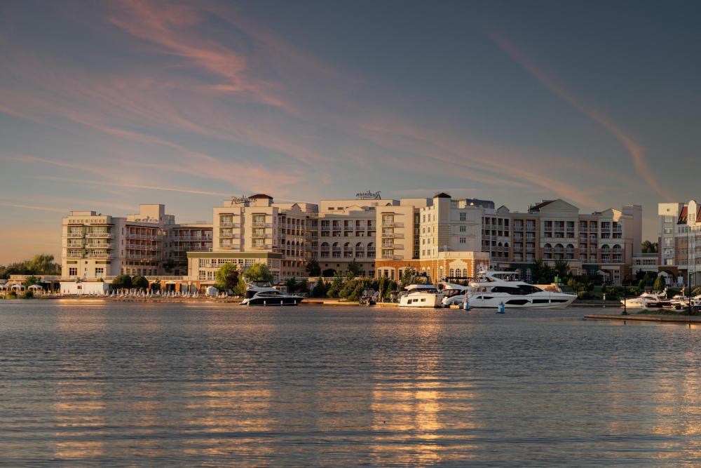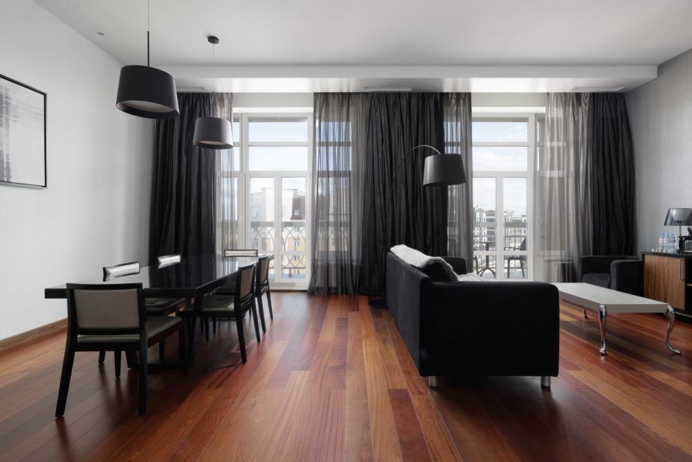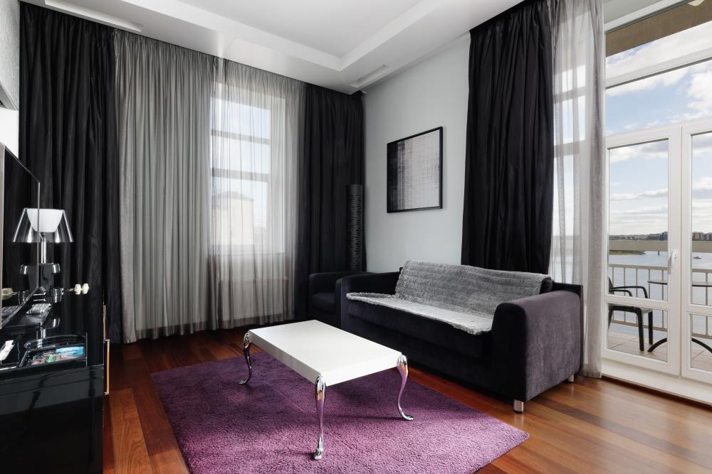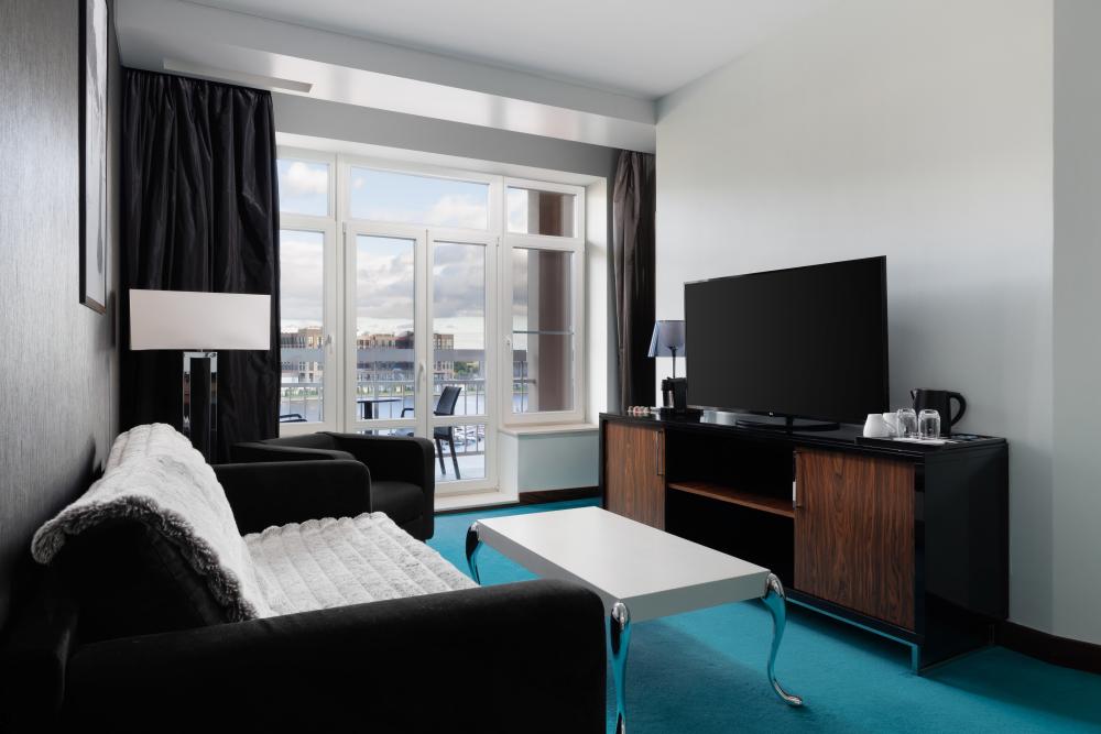 Если вы планируете длительное пребывание или вам необходимо дополнительное пространство, рекомендуем один из наших люксов Executive с балконом. В этих номерах есть отдельная спальная зона с ковровым покрытием и гостиная с паркетом, где расположен диван и обеденный стол для 8 персон. Номер имеет отдельных вход для персонала, что предоставит больше комфорта и ощущения уединенности. Оформление номера в стиле New York позволяет насладиться интересным дизайнерским решением и цветовым оформлением. Номер оснащен шкафов, диваном, письменным столом, журнальным столиком, бесплатным Wi-Fi. В номере вы найдете все самое необходимое для вашего отдыха: капсульная кофе машина, чайная станция, тапочки, халат, фен, косметические средства в ванной. В номере ванная комната оснащена душем, ванной, 2 раковины для удобства и комфорта гостей, также в номере имеется дополнительная гостевая туалетная зона. Из номера открывается прекрасный вид с террасы на реку, где расположены яхты. Если вы прибудете в отель на собственном водном транспорте, то можно будет наблюдать за ним из номера.