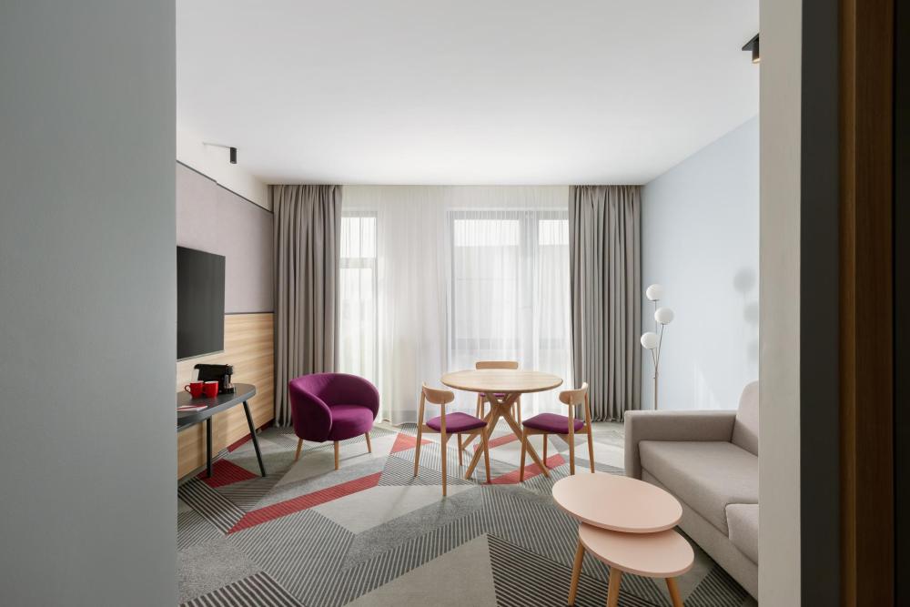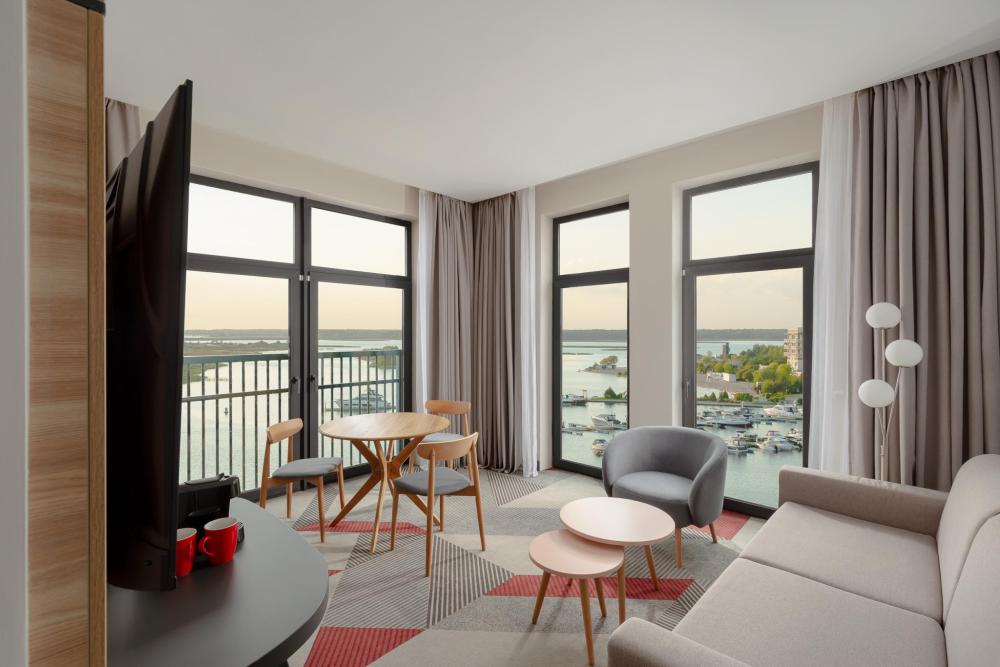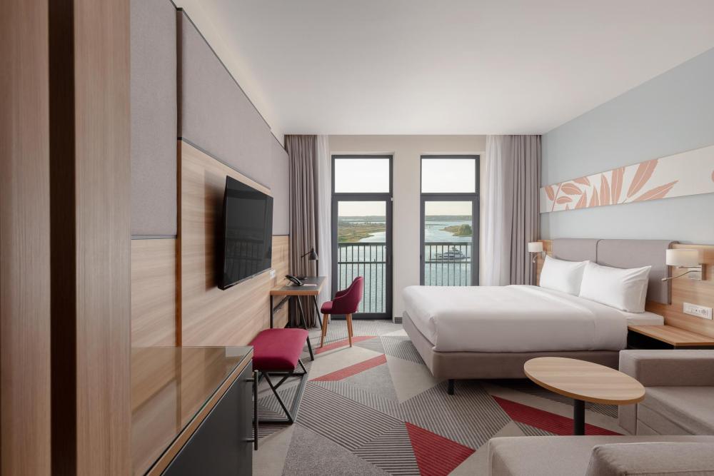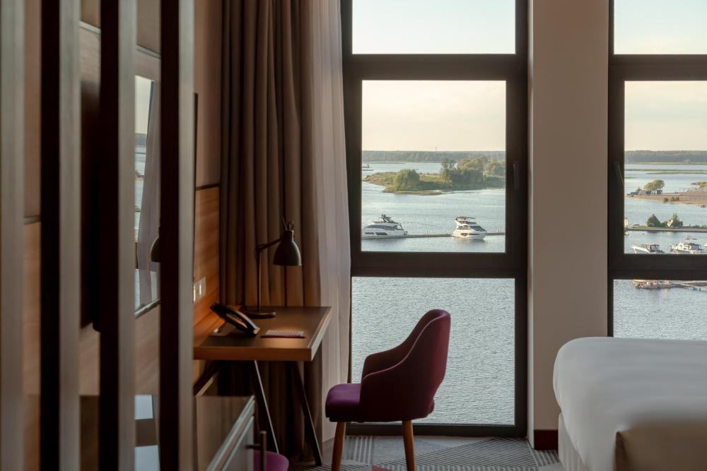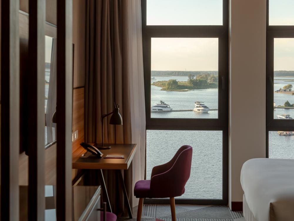 Просторный номер выполненный в современном дизайне с панорамным видом, двуспальной кроватью King Size, раскладным диваном и удобным рабочим местом. Для комфортного отдыха предусмотрена капсульная кофемашина и банные принадлежности.