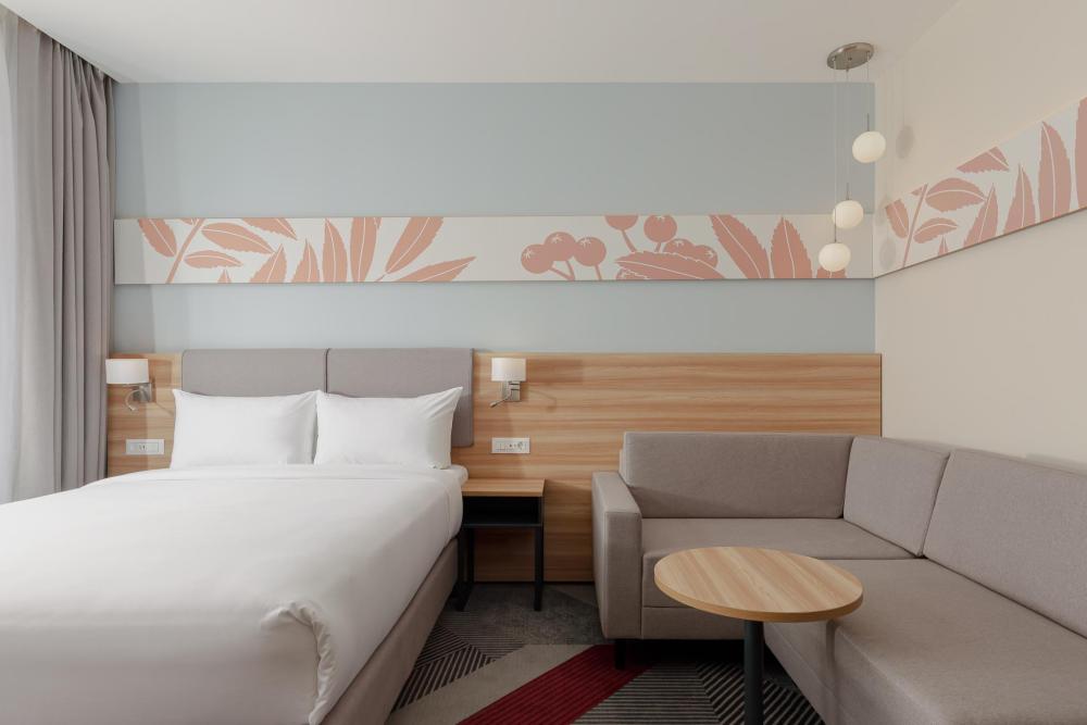 Уютный номер выполненный в современном стиле с панорамным видом, двуспальной кроватью и удобным диваном. Для комфортного отдыха предусмотрена чайно-кофейная станция и банные принадлежности.