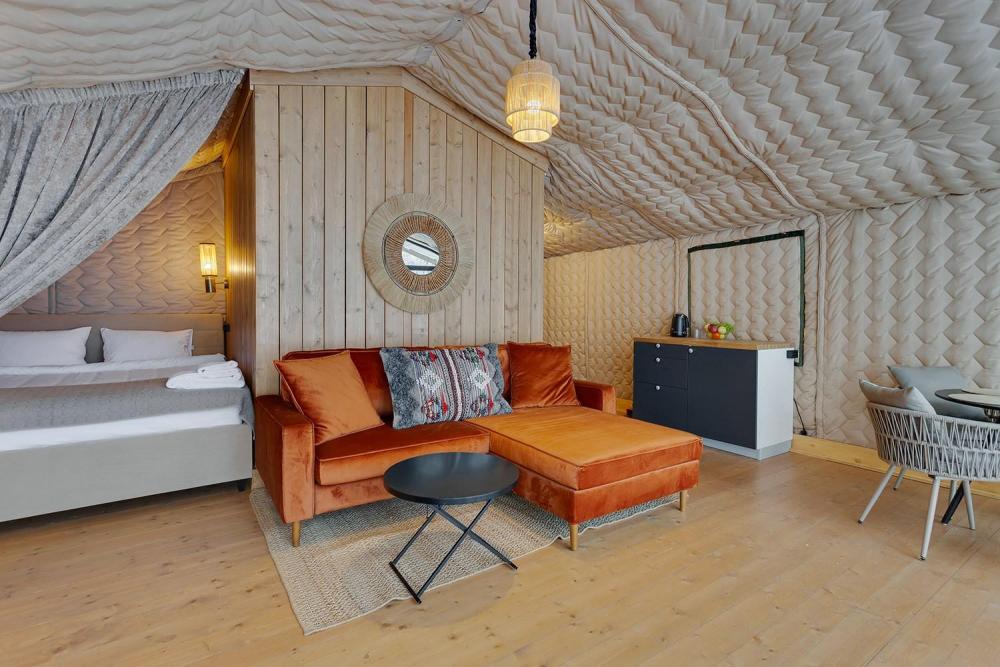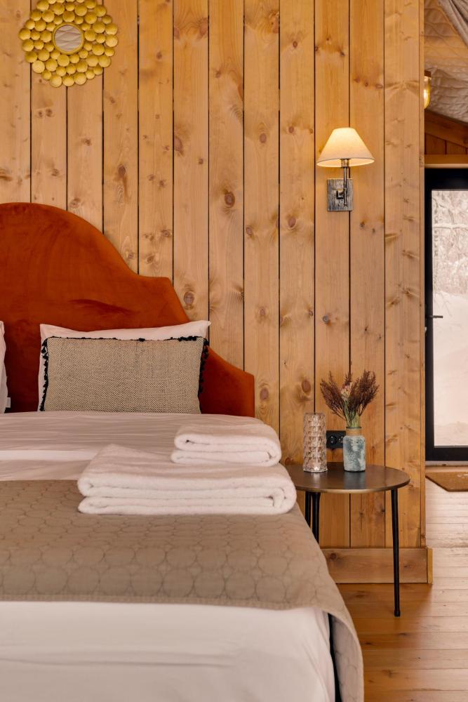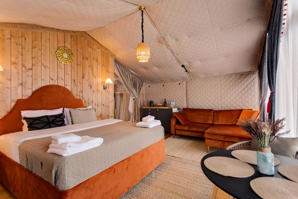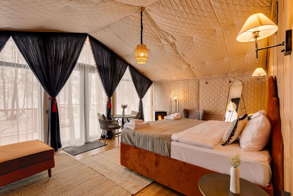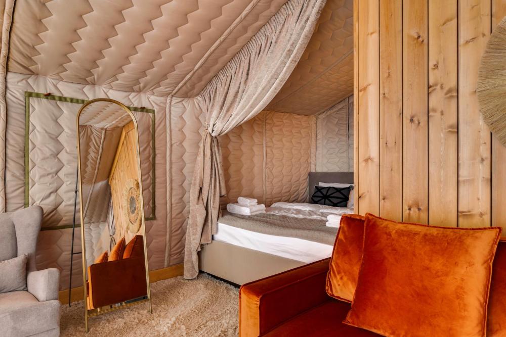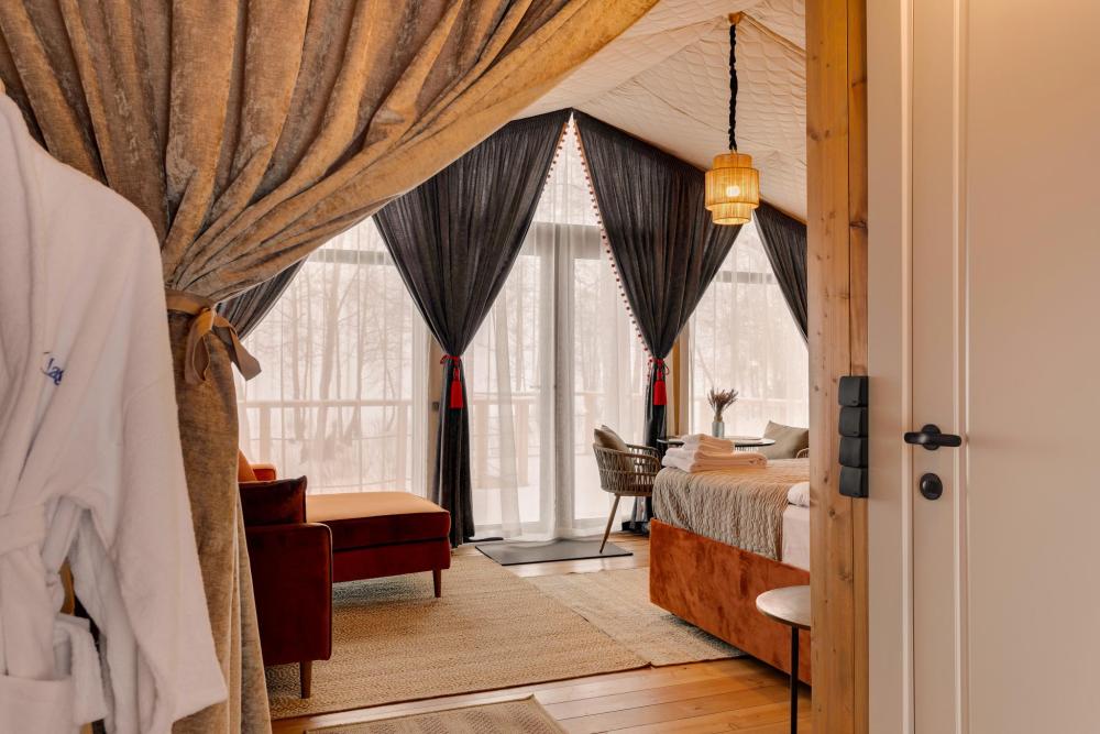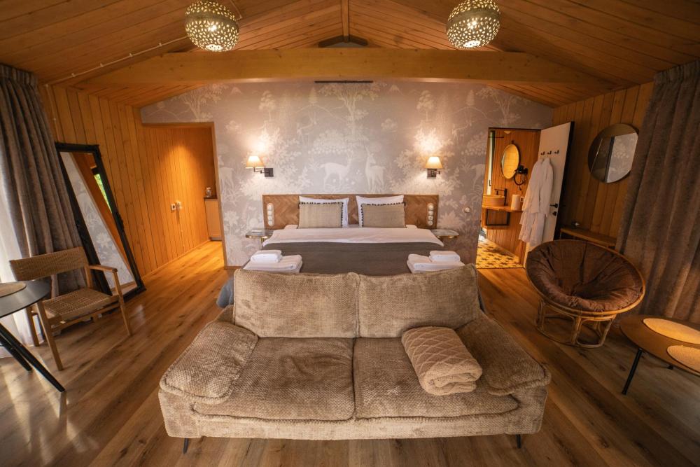 Лодж Лембо для 2-4 гостей. Интерьер, выполненный в стиле сафари с сочетанием экологичных материалов, природных фактур в тёплой цветовой гамме. В просторной комнате большая двуспальная кровать с ортопедическим матрасом и большим раскладным диваном. Ванная комната может быть украшена в романтическом стиле за дополнительную оплату, чтобы сделать ваше пребывание ещё более волшебным и уютным. В стоимость проживания включено премиальное постельное белье, экологичная косметика, вода, чай и дрова.