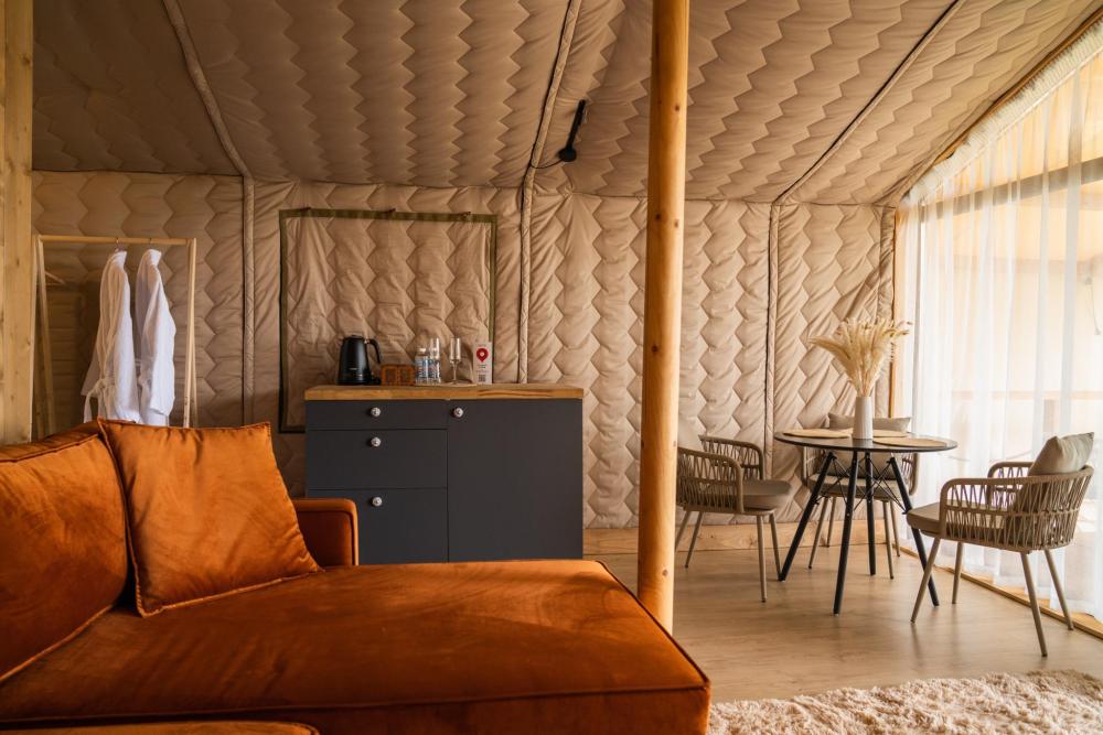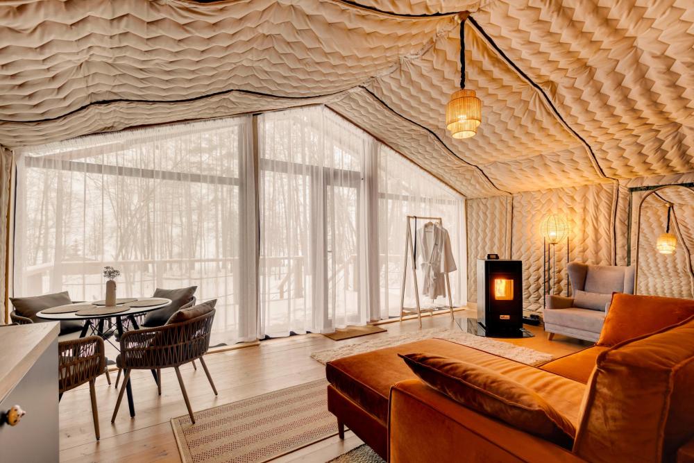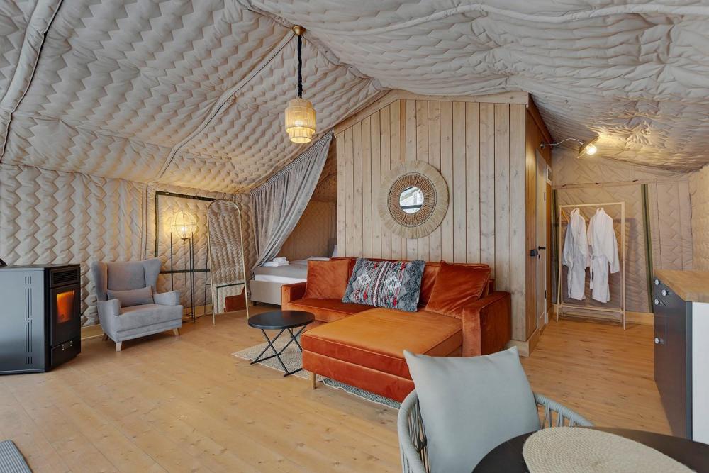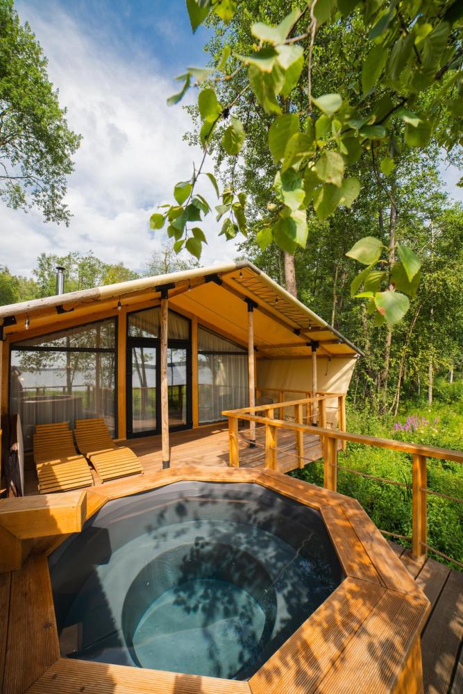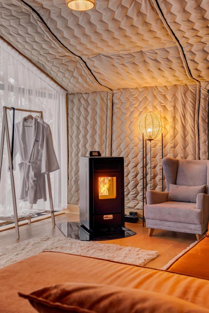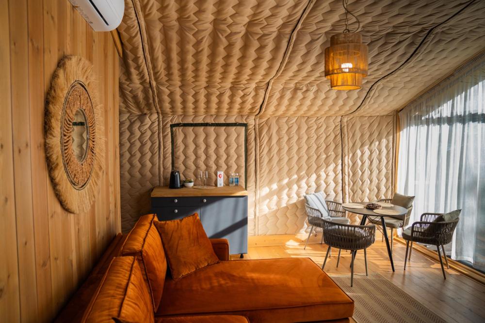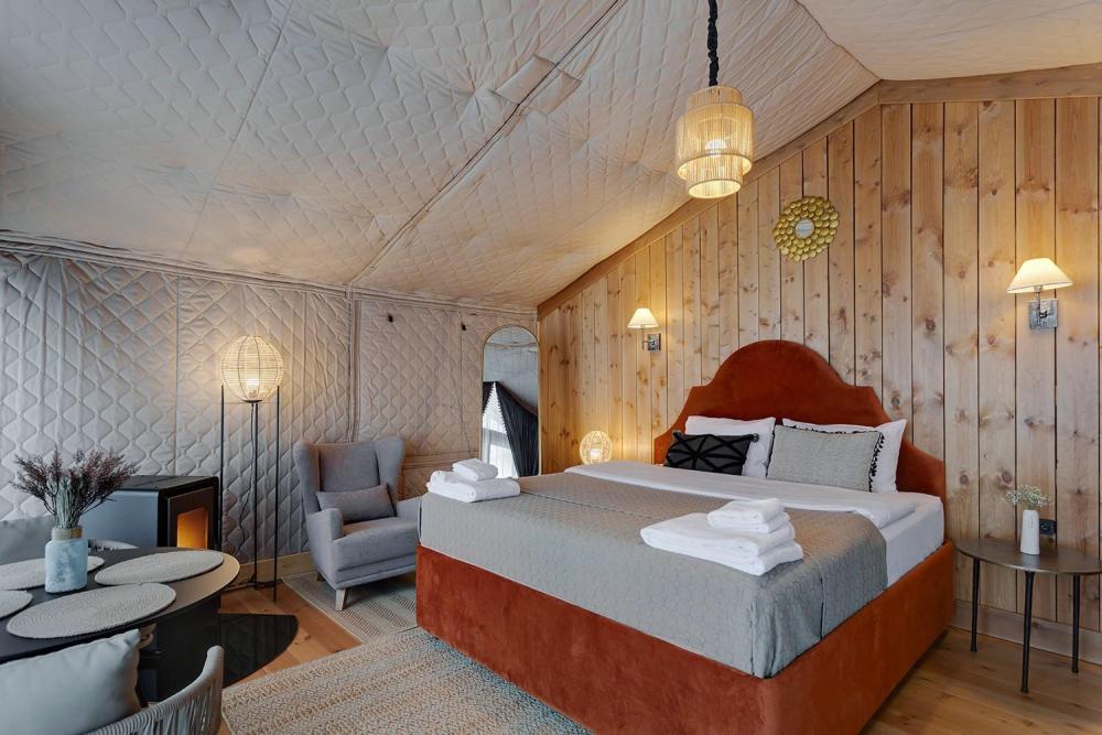 Лодж Лембо для 2-4 гостей. Интерьер, выполненный в стиле сафари с сочетанием экологичных материалов, природных фактур в тёплой цветовой гамме. В просторной комнате большая двуспальная кровать с ортопедическим матрасом и большим раскладным диваном. Ванная комната может быть украшена в романтическом стиле за дополнительную оплату, чтобы сделать ваше пребывание ещё более волшебным и уютным. В стоимость проживания включено премиальное постельное белье, экологичная косметика, вода, чай и дрова.