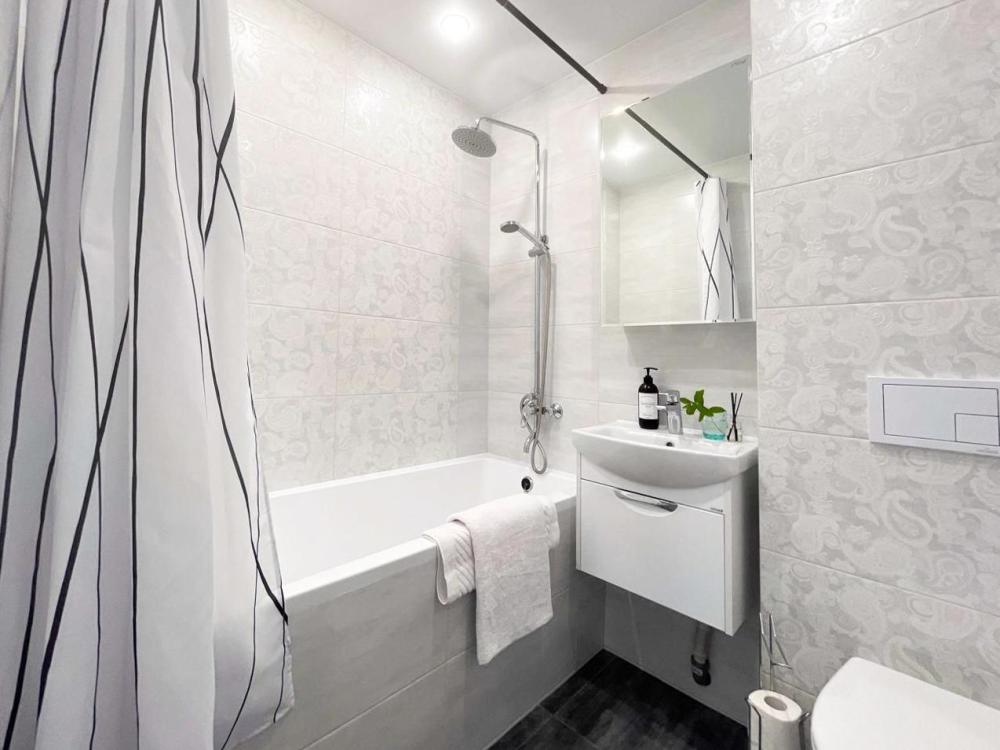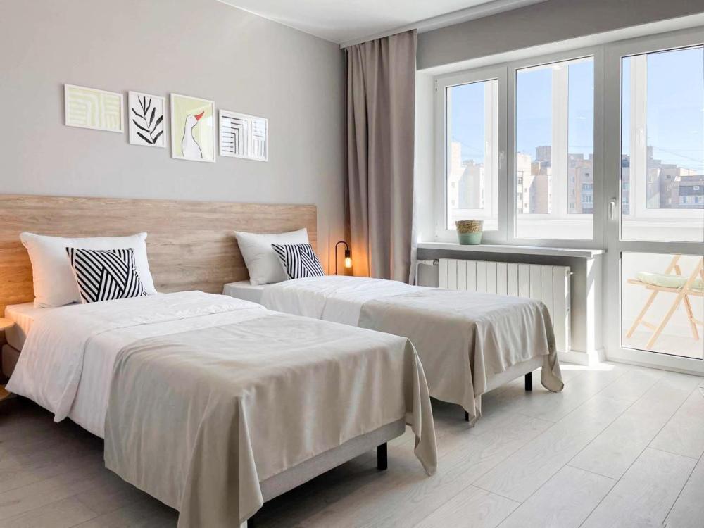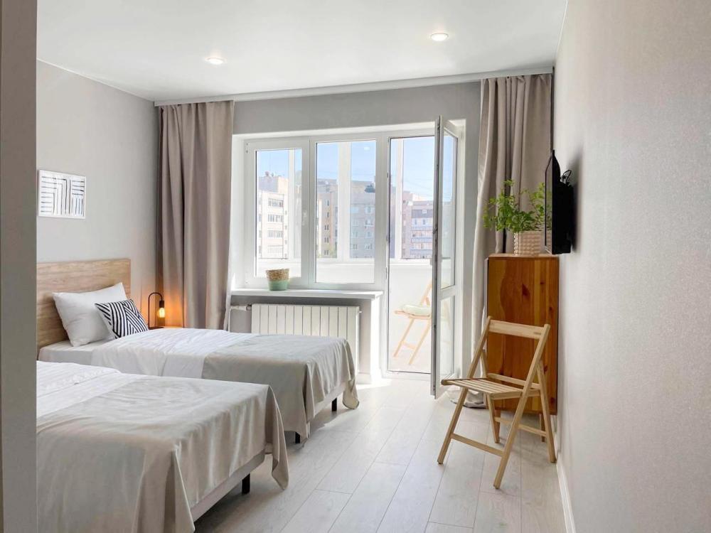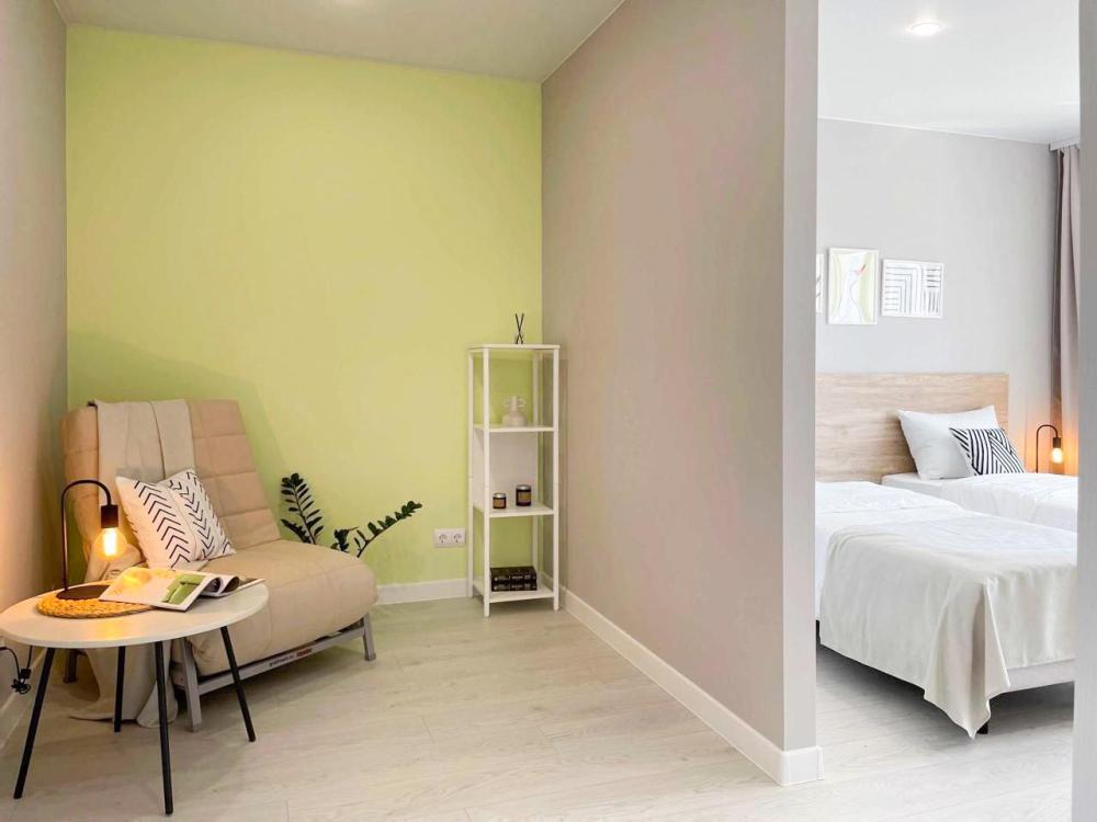 Однокомнатная апартаменты с размещением до 4 гостей. Кровати со сцепными механизмами, топпер позволяет абсолютно полностью нивелировать место сцепки, превращая кровати в единое комфортное спальное место размером 160х200 см. Возможно разъединить кровати и использовать как отдельные спальные места. Есть два комфортных мягких кресла-кровати с ортопедическим основанием. Белое постельное бельё (профессиональный гостиничный страйп-сатин в полоску), мягкие полотенца. Оснащение включает качественные средства гигиены (гель для душа, шампунь, мыло, зубные наборы, тапочки), высокоскоростной Wi-Fi, два телевизора с ТВ-каналами и онлайн-кинотеатром, кондиционер (сплит-система), москитные сетки, настольные игры и журналы, шторы «blackout» для комфортного сна, стиральная машина, вместительный холодильник, микроволновая печь, утюг с гладильной доской и сушилкой для одежды, фен для волос, хорошая система фильтрации питьевой воды, чайник, турка, разнообразный чай и качественный молотый кофе.