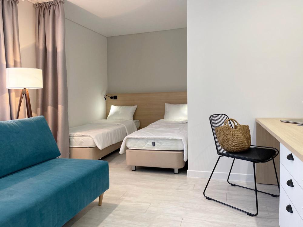 Однокомнатная квapтира с размещением до 4 гостей. Очень хорошие матрасы, качественный топпер. Кровати со сцепными механизмами, топпер позволяет абсолютно полностью нивелировать место сцепки, превращая кровати в единое комфортное спальное место размером 160х200 см. Возможно разъединить кровати и использовать как отдельные спальные места. Спальная зона отгорожена плотной шторой. Раскладывающийся диван в гостиной. Белое постельное бельё, мягкие полотенца. Оборудование квартиры включает качественные средства гигиены (гель для душа, шампунь, мыло), высокоскоростной Wi-Fi, телевизор с ТВ-каналами и онлайн-кинотеатром, полноценное рабочее место, мощный напольный вентилятор, москитные сетки на всех окнах, настольные игры и журналы, шторы «blackout» для комфортного сна, стиральную машину, вместительный холодильник, микроволновую печь, утюг с гладильной доской и сушилкой для одежды, фен для волос, систему фильтрации питьевой воды, чайник, турку, разнообразный чай и качественный молотый кофе.