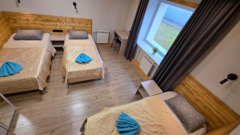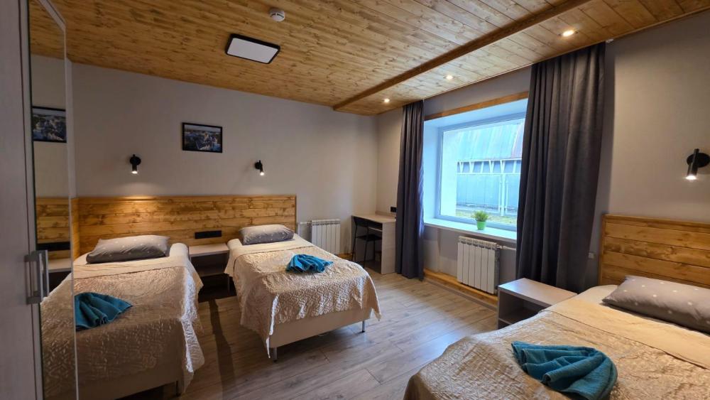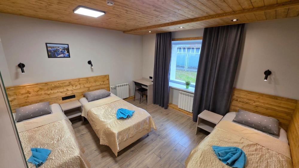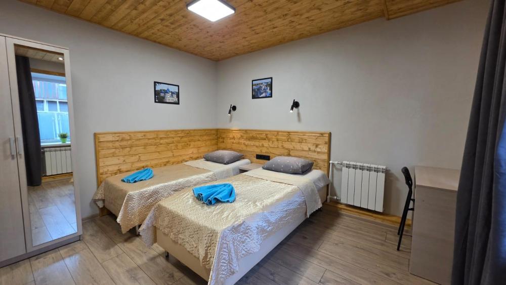 Улучшенный трехместный номер с ванной и туалетом на этаже. В номере имеется 2 раздельные кровати,шкаф,стол и телевизор