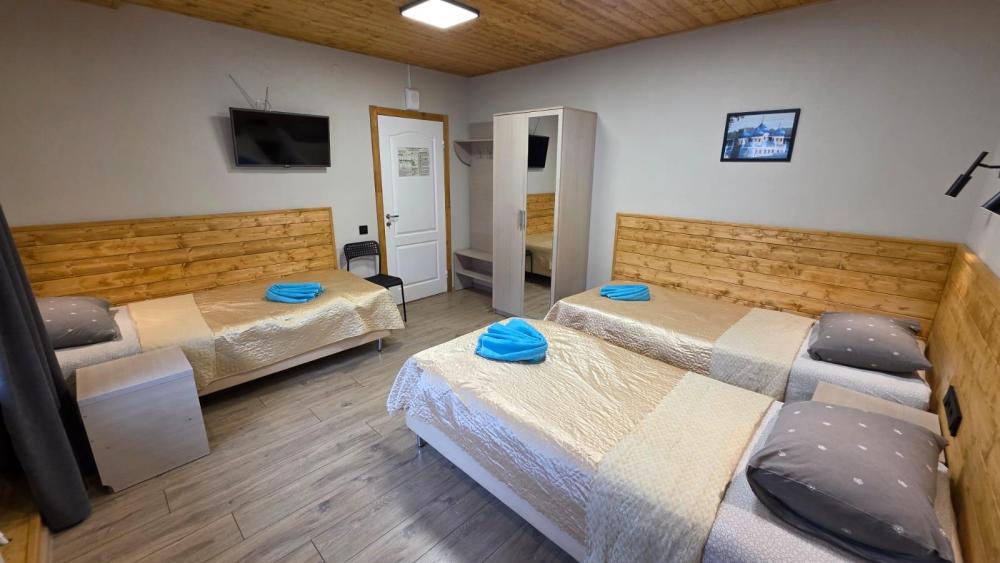 В номере 4 односпальные кровати и двуспальный диван, шкаф, прикроватные тумбочки, телевизор