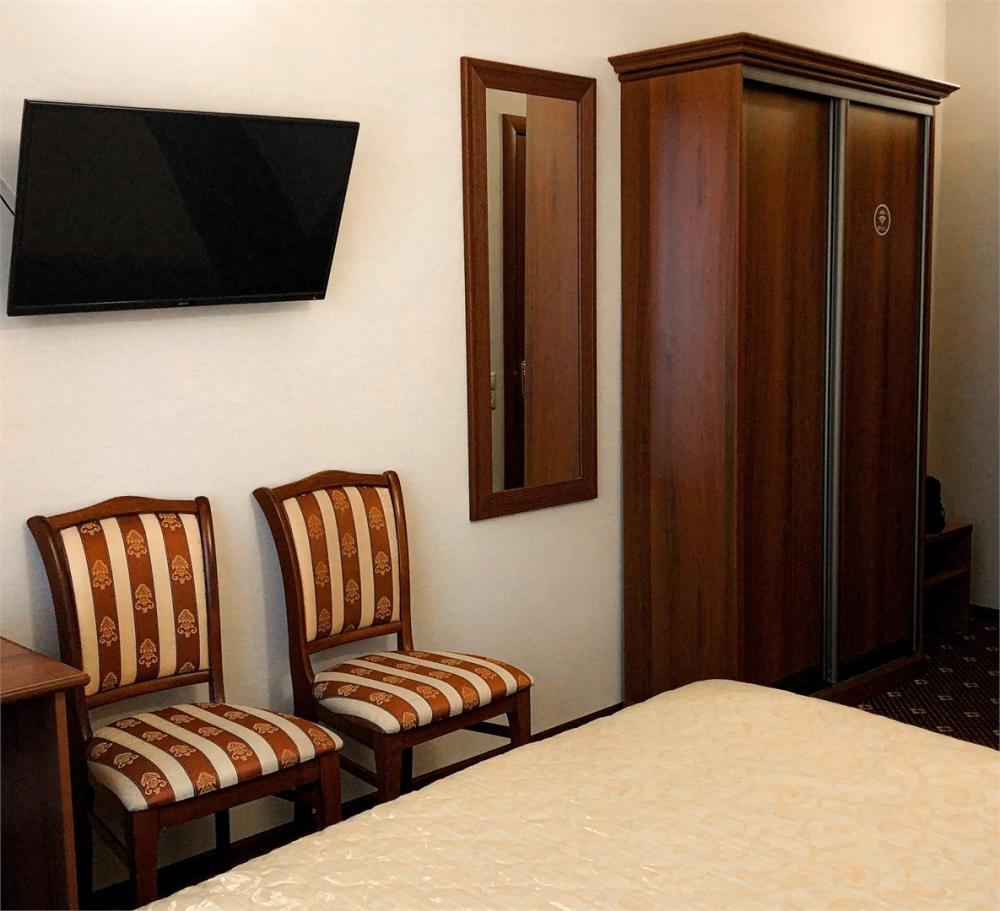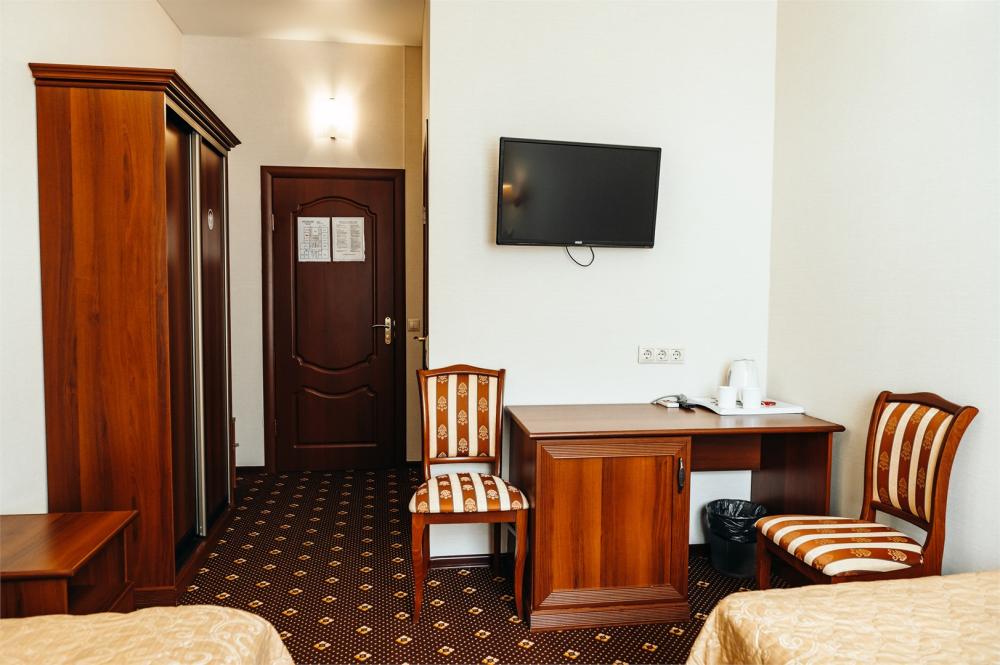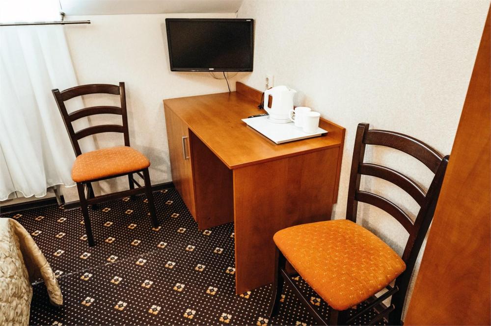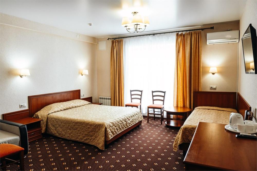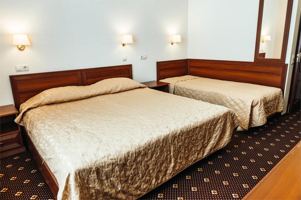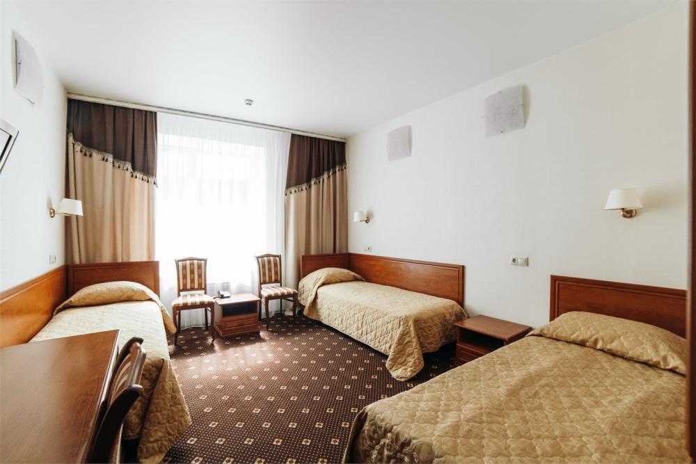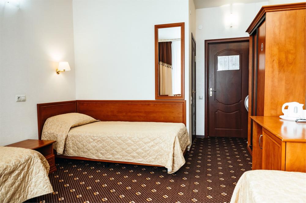 Комфортный однокомнатный номер с тремя односпальными кроватями, рассчитанный на проживание нескольких постояльцев. Номер пользуется большим спросом у командированных, а также групп школьников в дни школьных каникул.