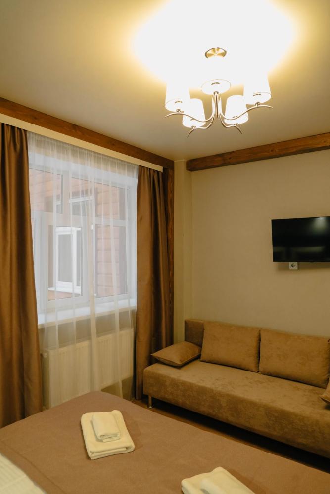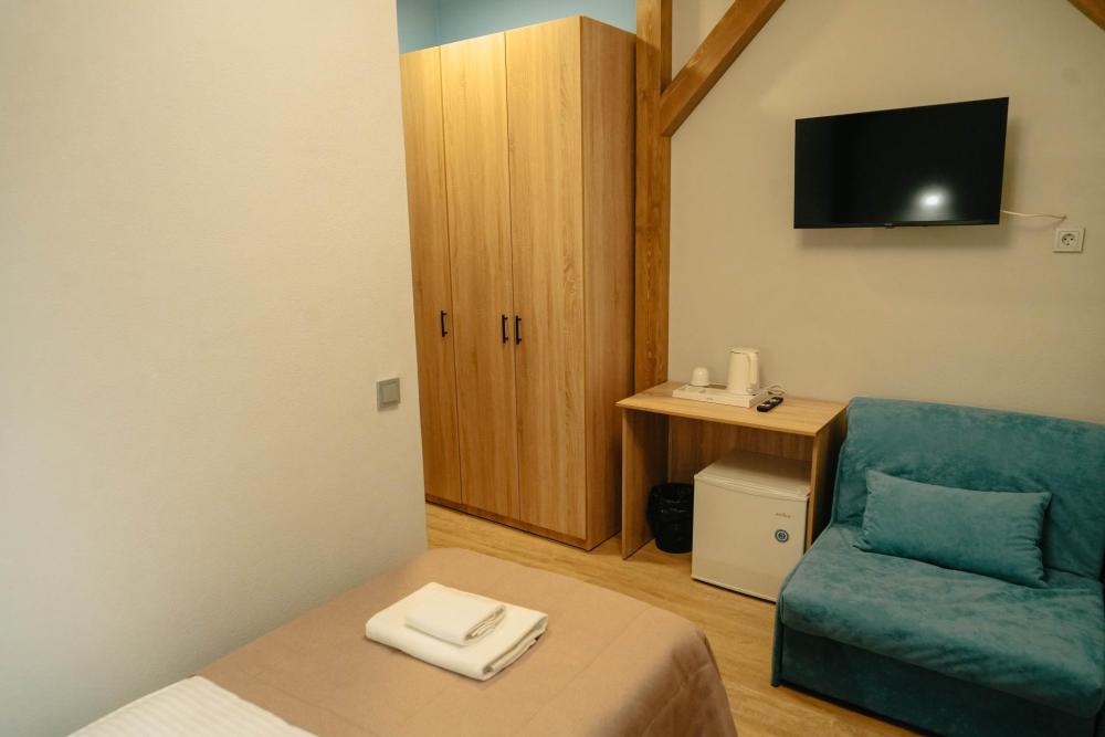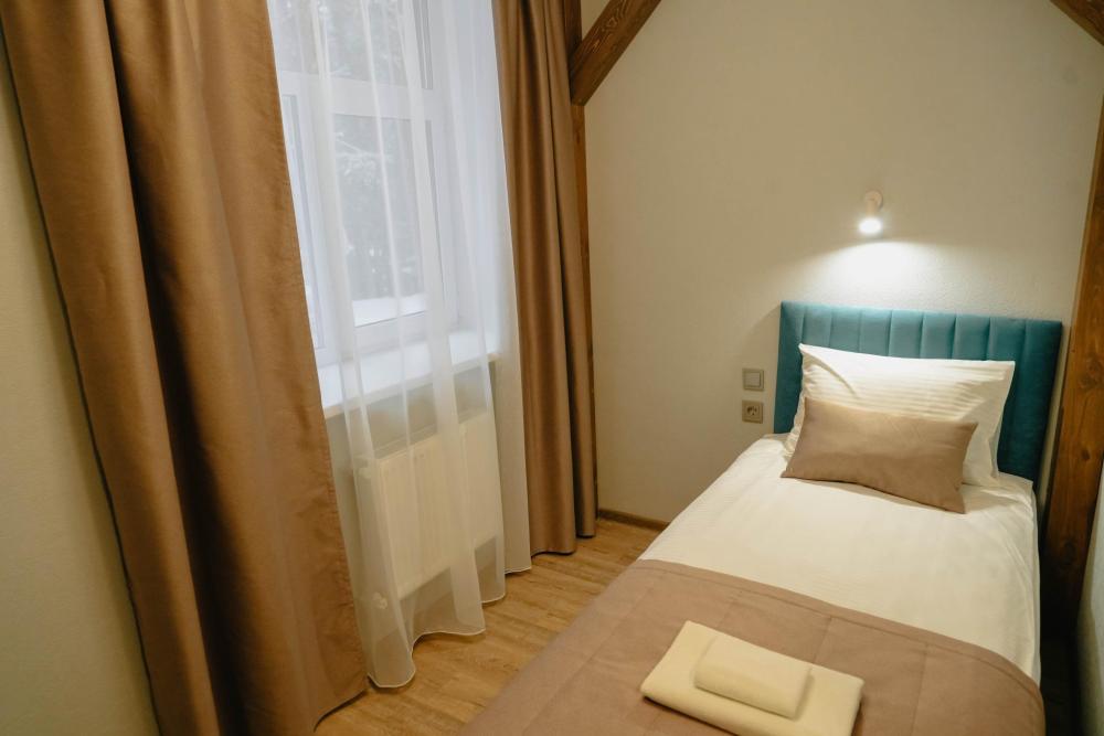 Нoмера расположены в отдельном корпусе. Здание имеет деревянную отделку и аккуратное крыльцо. Внутри корпуса расположена просторная гостиная зона, оборудованная мягкой мебелью и столовой. В номере есть 3 односпальные кровати с мягким постельным бельем, шкафы для хранения вещей и телевизор, отдельный санузел с душевой кабиной.