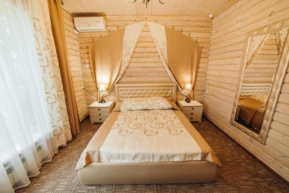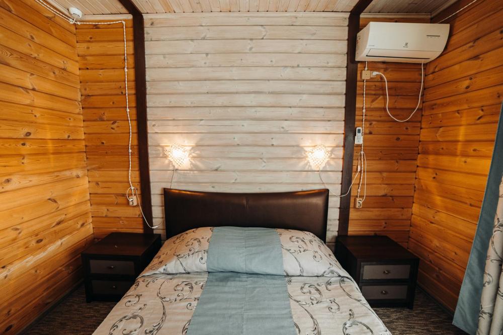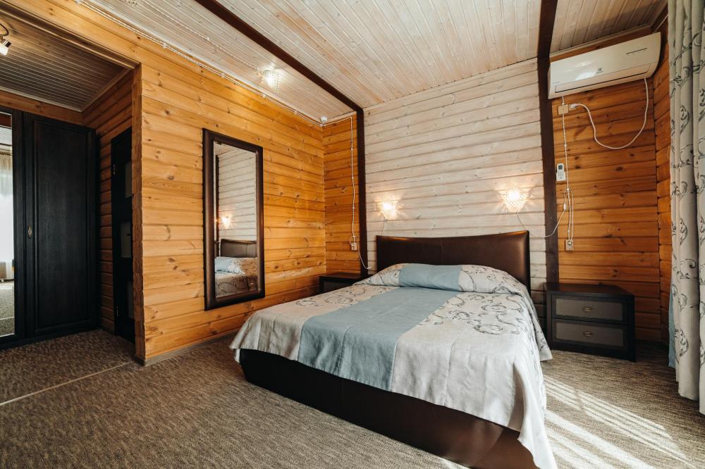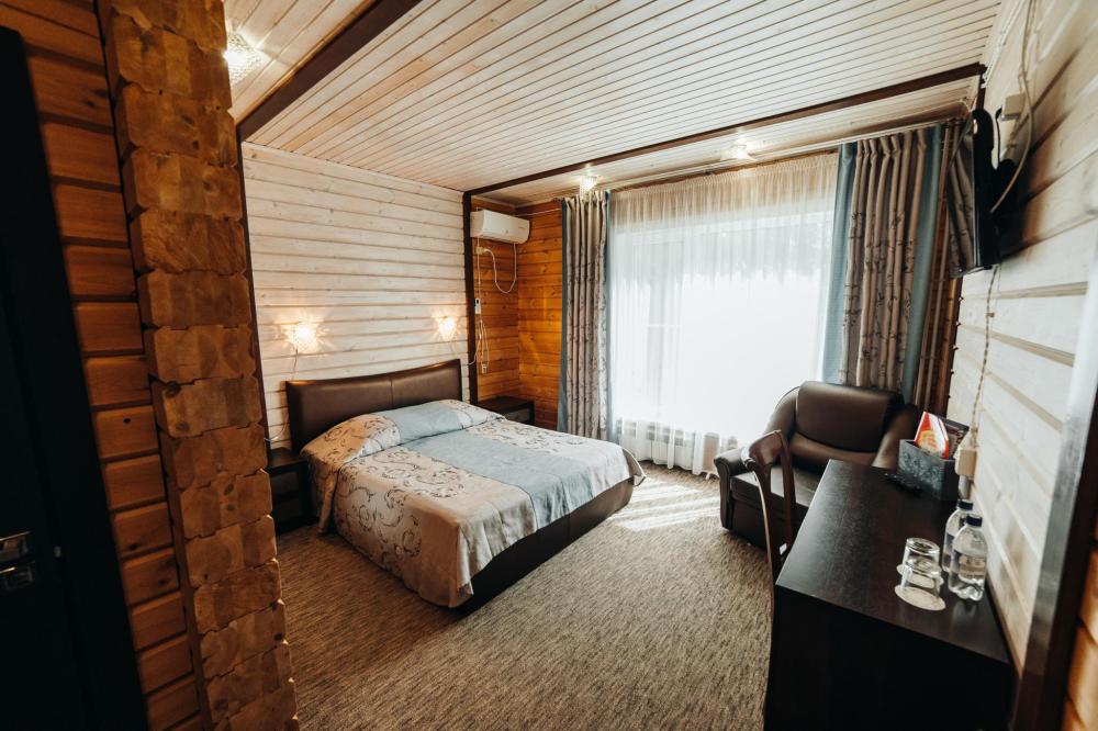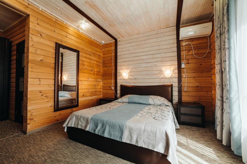 Уютный двухместный номер первой категории (стандарт) с двуспальной кроватью. Номер находится на 1 этаже двухэтажного коттеджа. Также в коттедже есть общая гостиная-кухня и бильярд.
