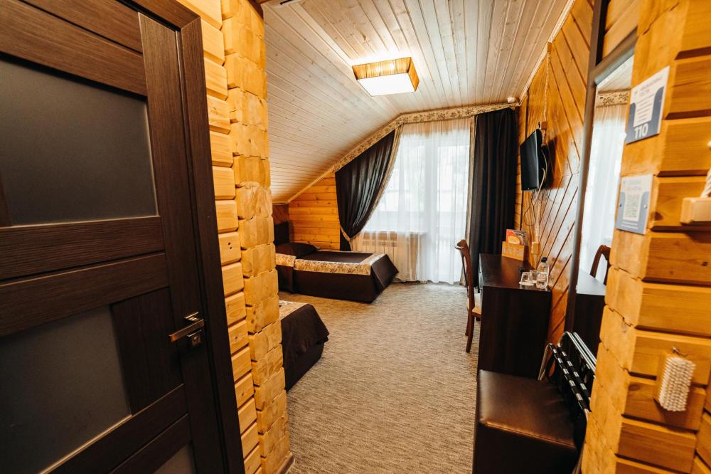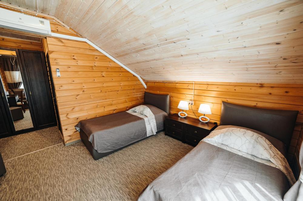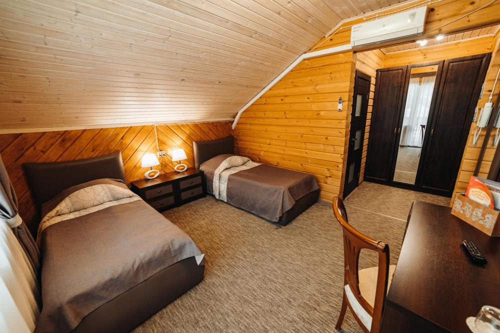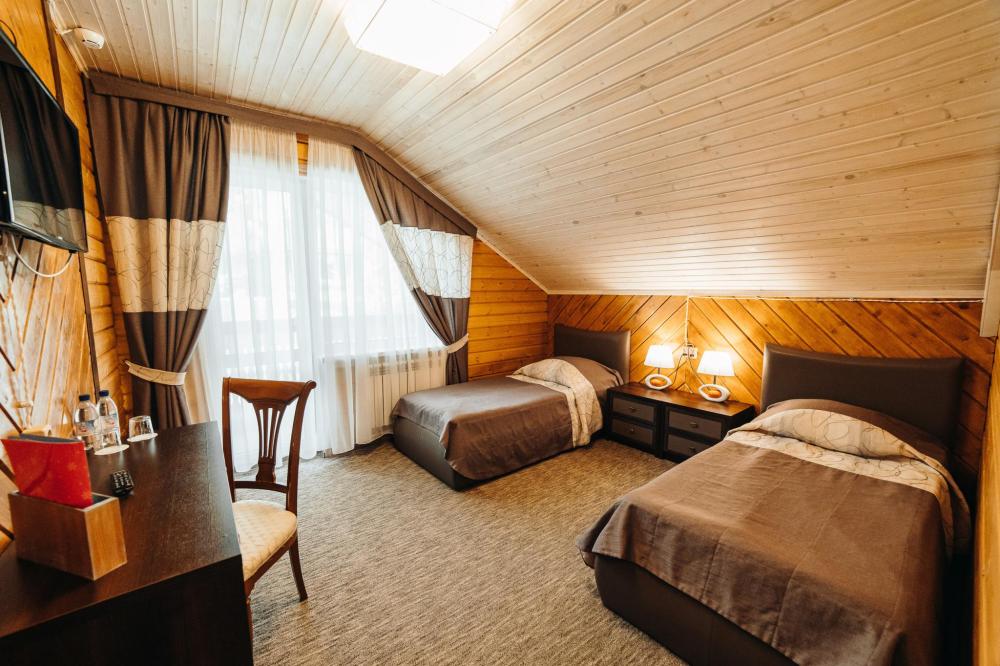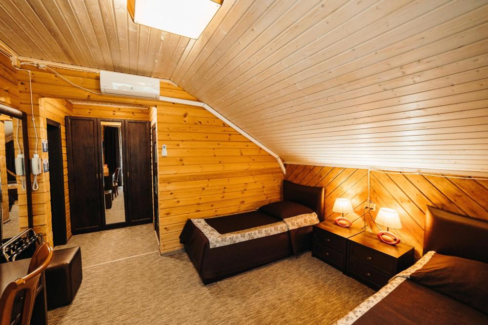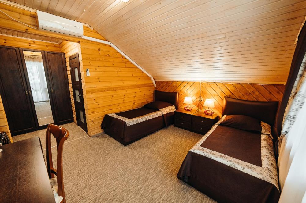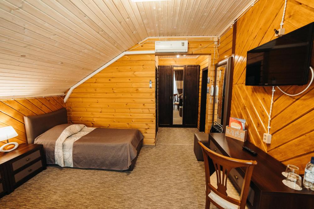 Уютный двухместный номер первой категории (стандарт). Номер находится на 2 этаже двухэтажного коттеджа. Также в коттедже есть общая гостиная-кухня и бильярд.