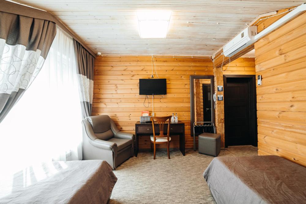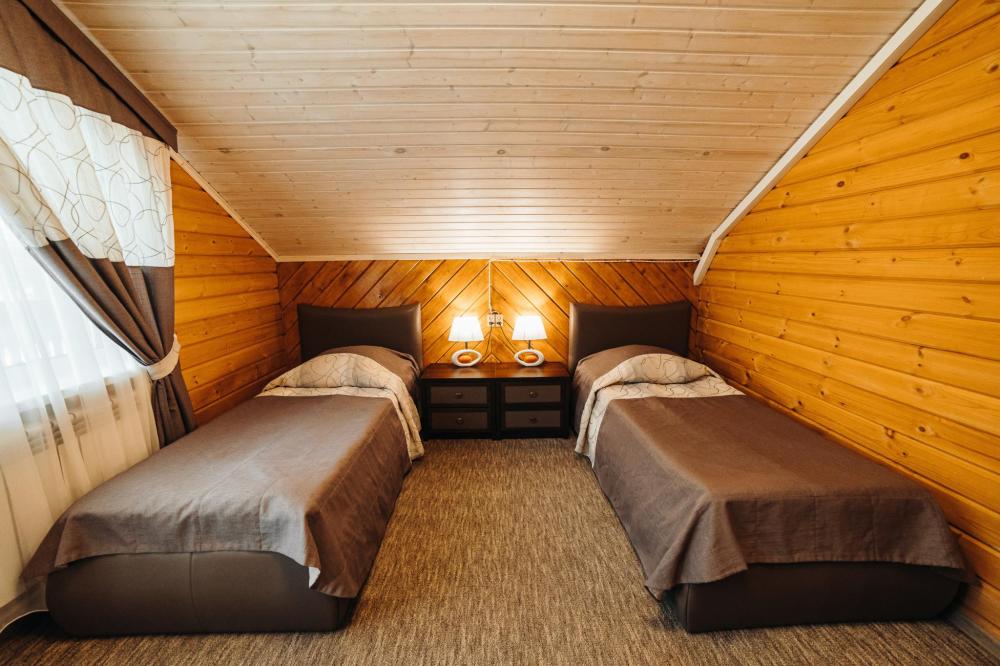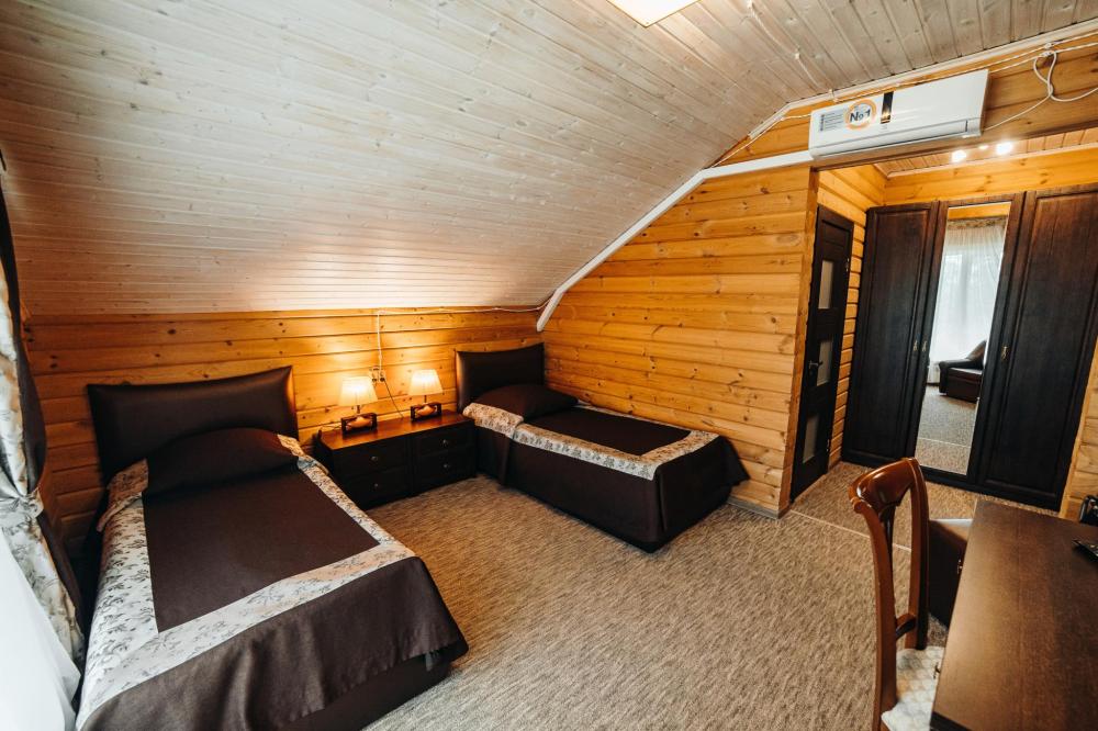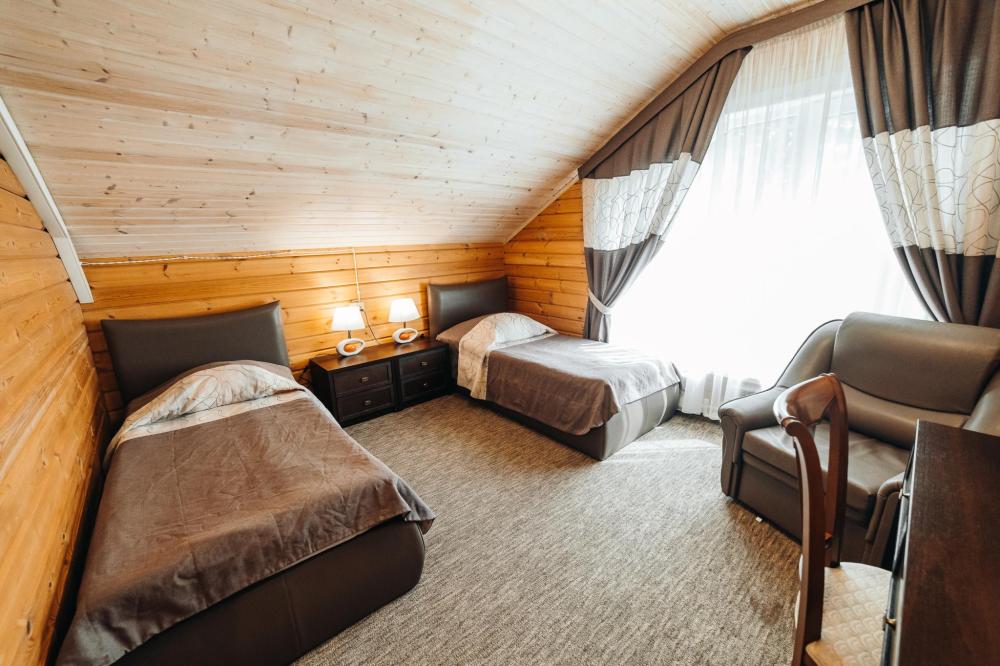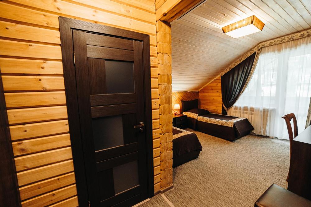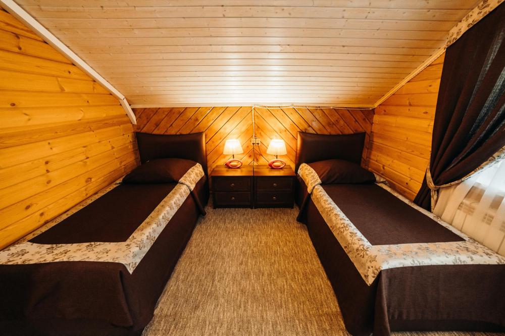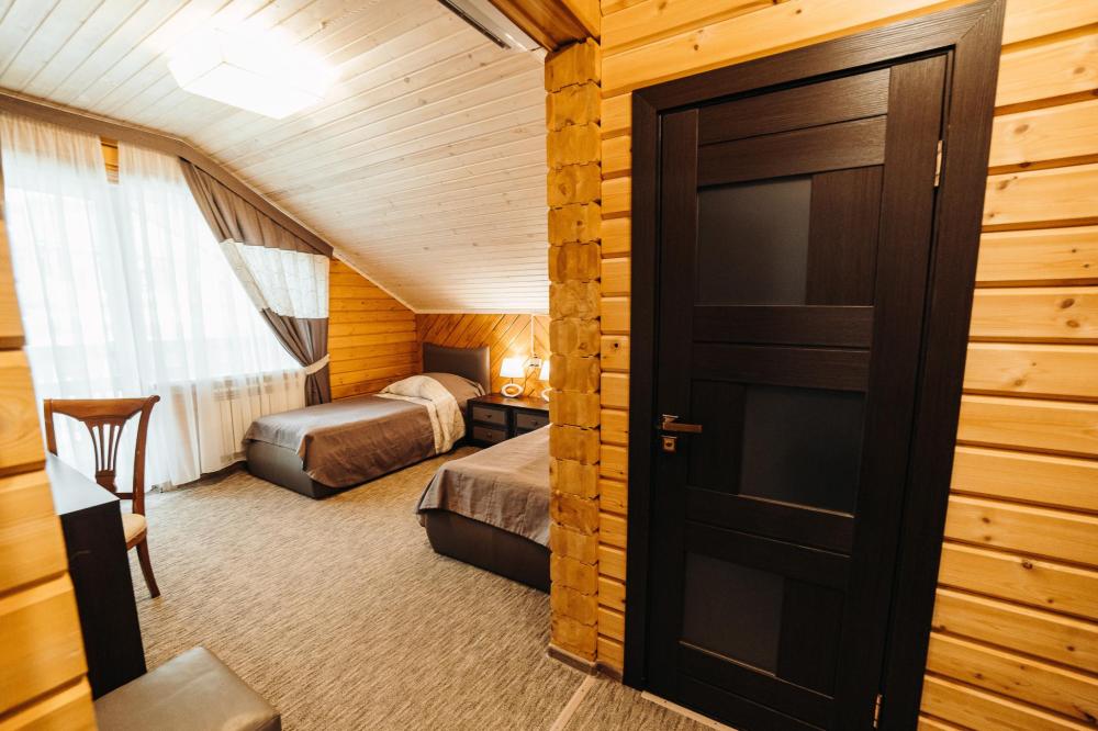 Уютный двухместный номер первой категории (стандарт). Номер находится на 2 этаже двухэтажного коттеджа. Также в коттедже есть общая гостиная-кухня и бильярд.