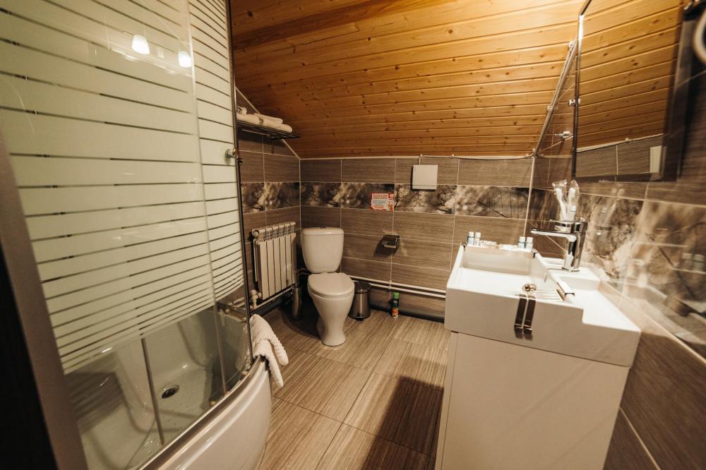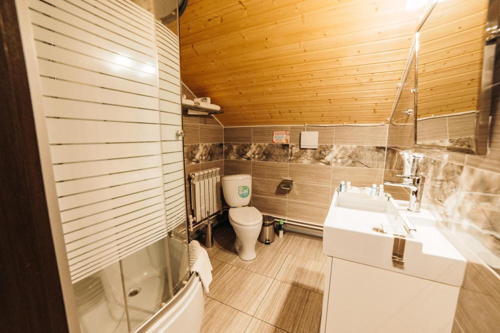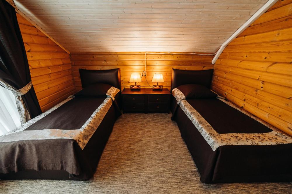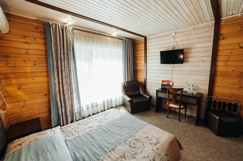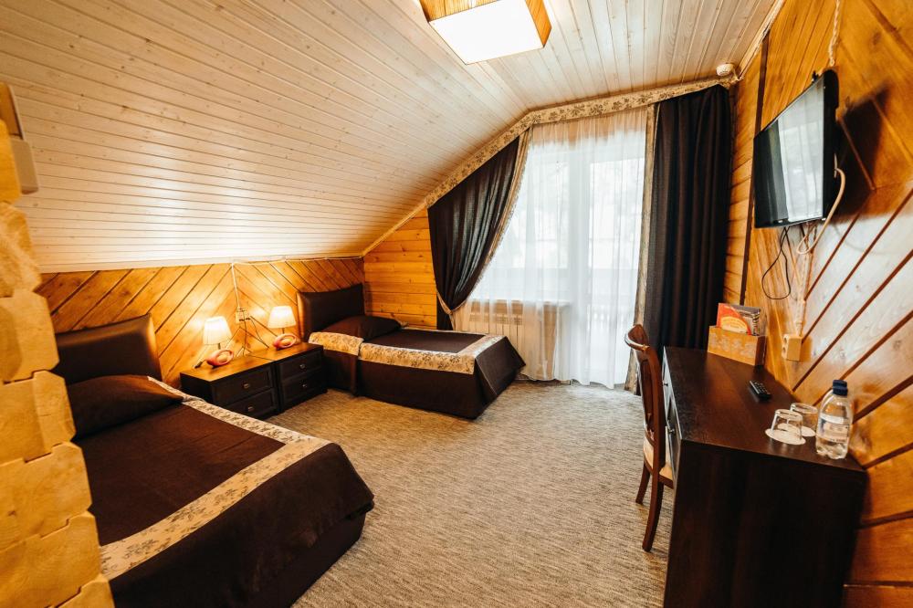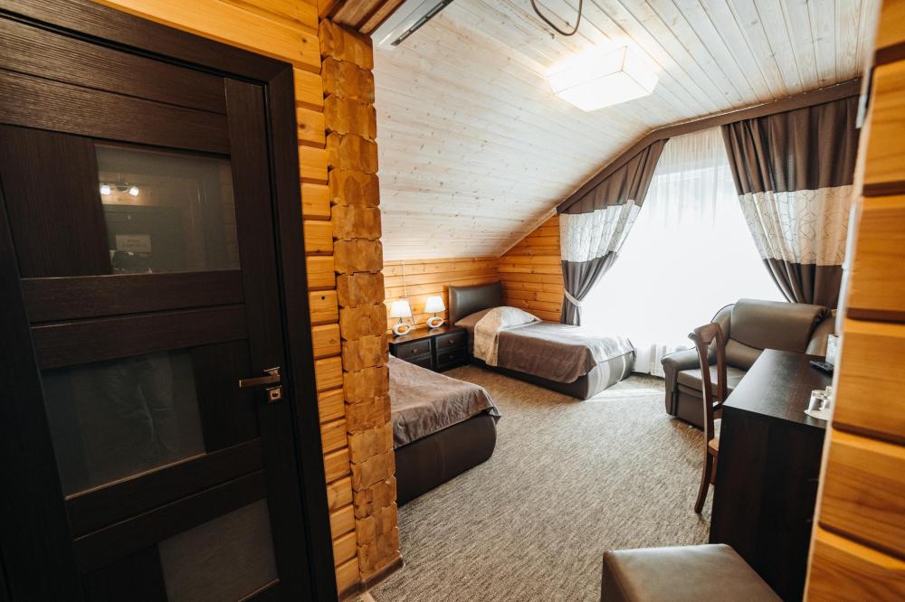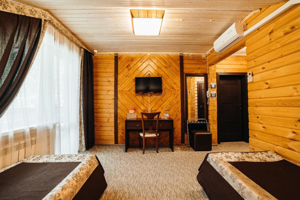 Уютный двухместный номер первой категории (стандарт). Номер находится на 2 этаже двухэтажного коттеджа. Также в коттедже есть общая гостиная-кухня и бильярд.