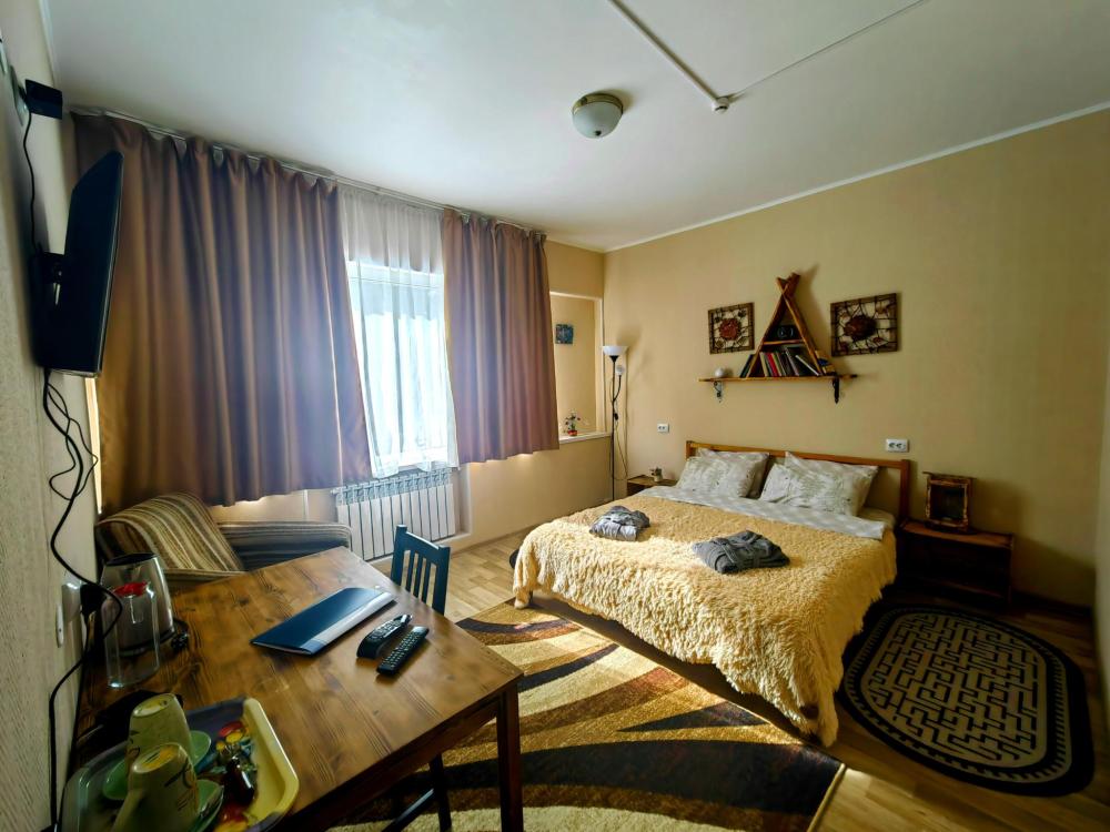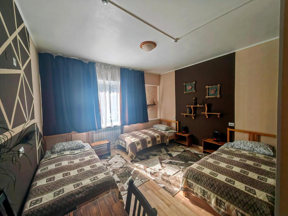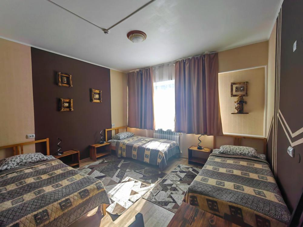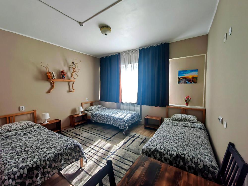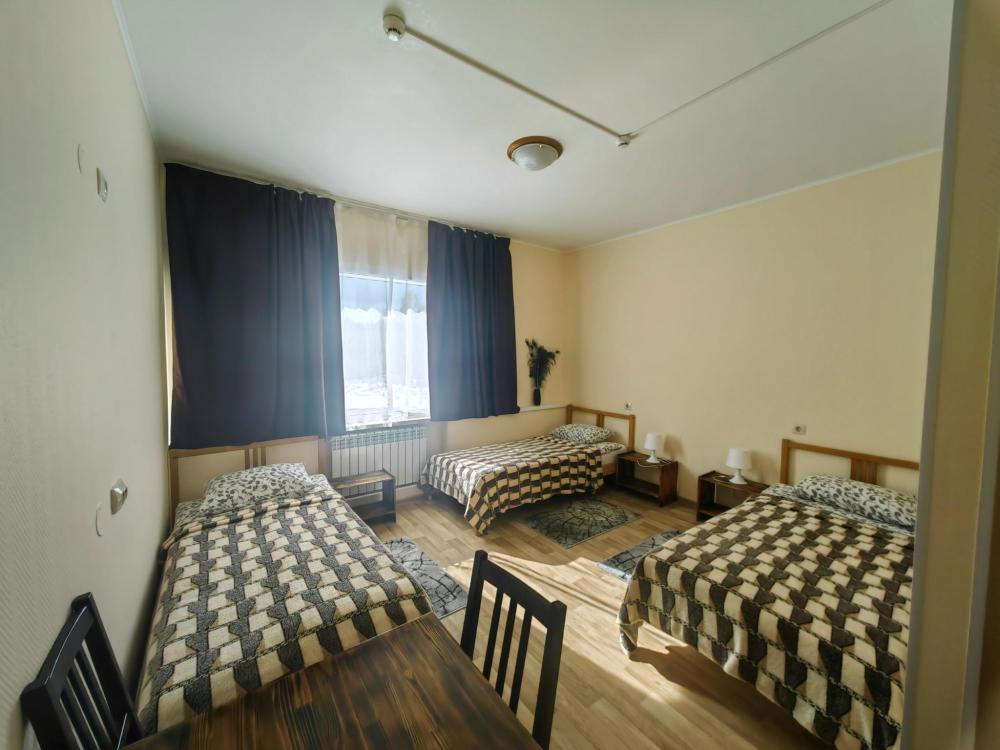 Номер комфорт семейный В номере есть все необходимое для комфортного проживания: двуспальная кровать 160х200, односпальная кровать 90х200, прикроватные тумбочки, телевизор, чайник, туалет, душ, теплый пол, фен, тапочки.