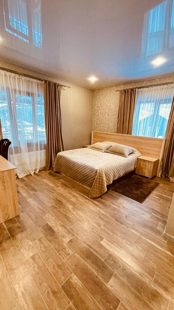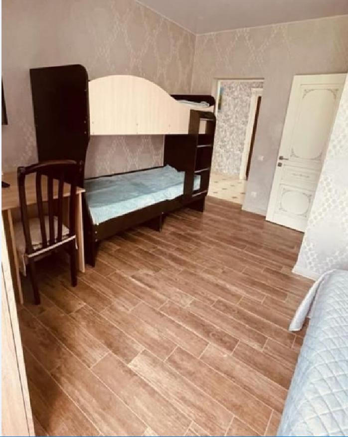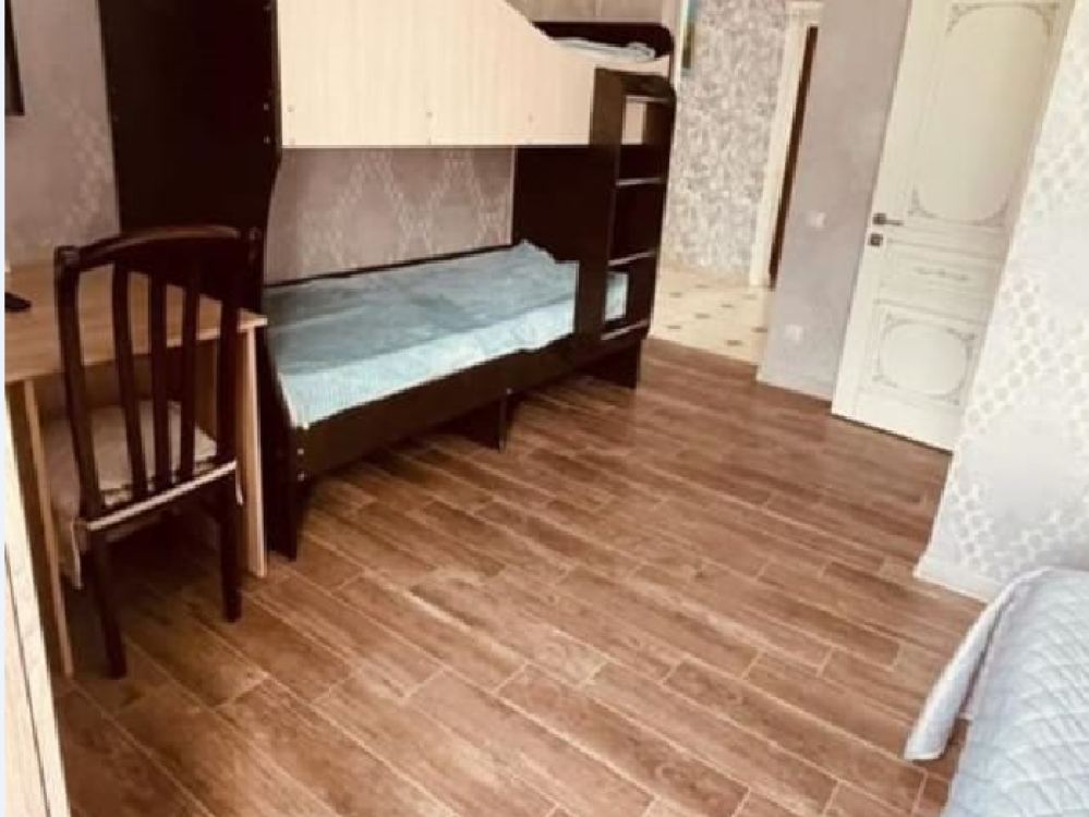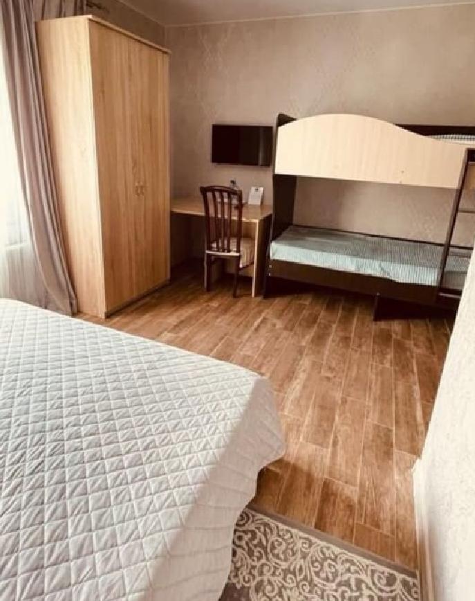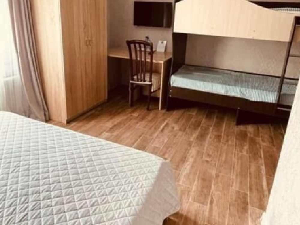 Уютная комната с 1 двуспальной и 1 двухъярусной кроватью. На первом ярусе может расположиться взрослый, на втором ярусе - ребенок до 14 лет. В комнате имеется все необходимое для комфортного проживания: рабочее место, шкаф, телевизор, санузел с душем.