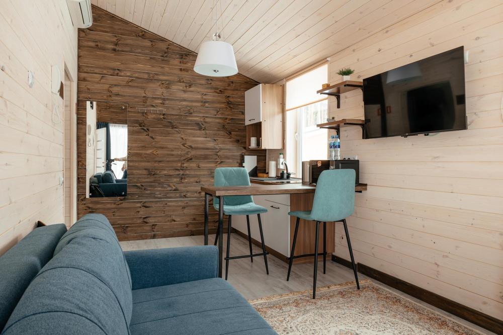 Деревянный коттедж с панорамным видом на живописную природу включает гостиную, совмещенную с кухней, спальню, санузел с душевой кабиной. У дома имеется открытая уличная веранда