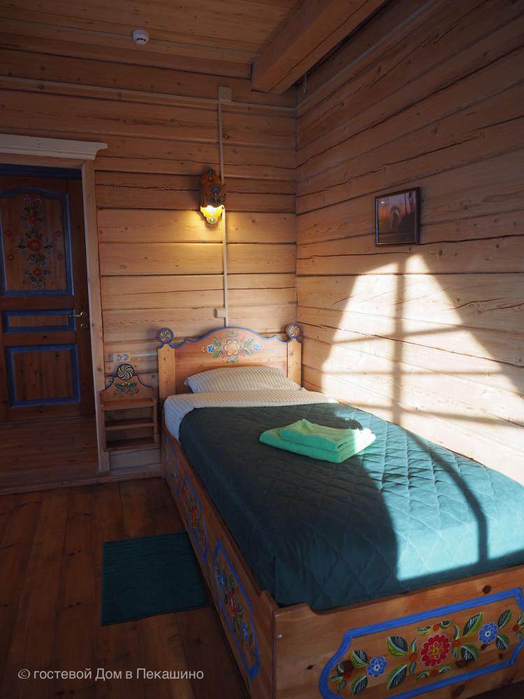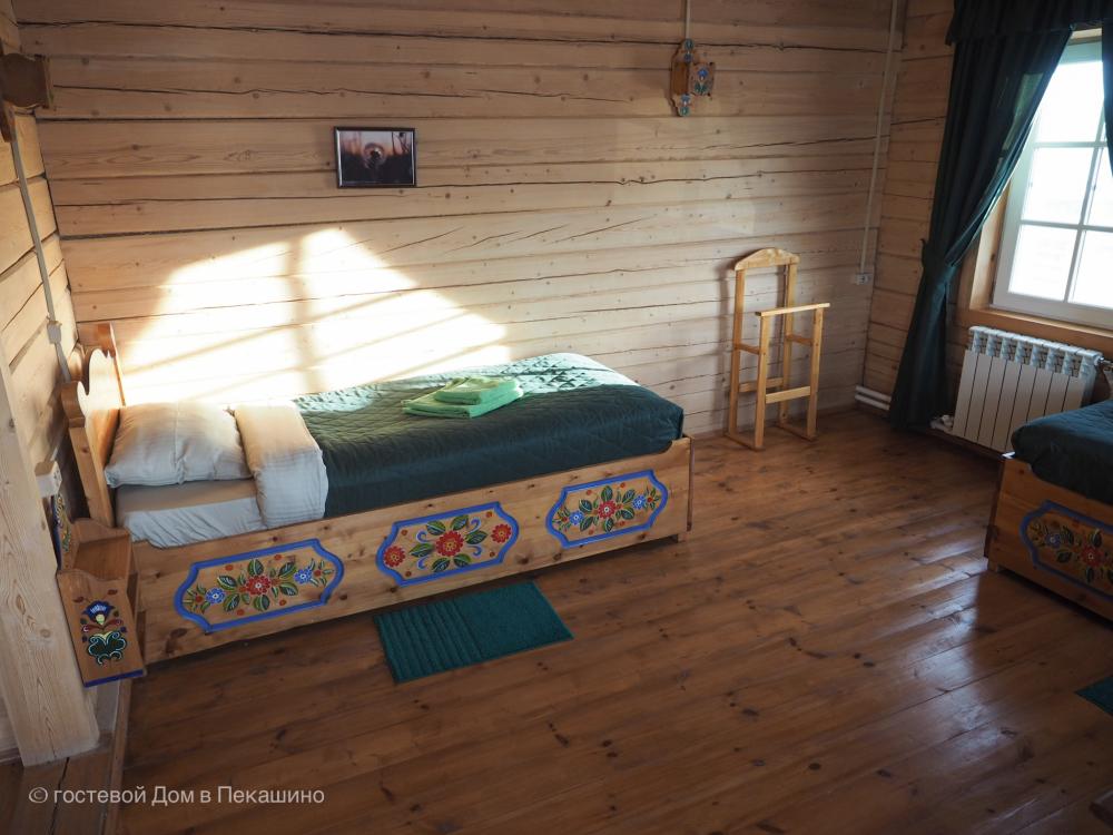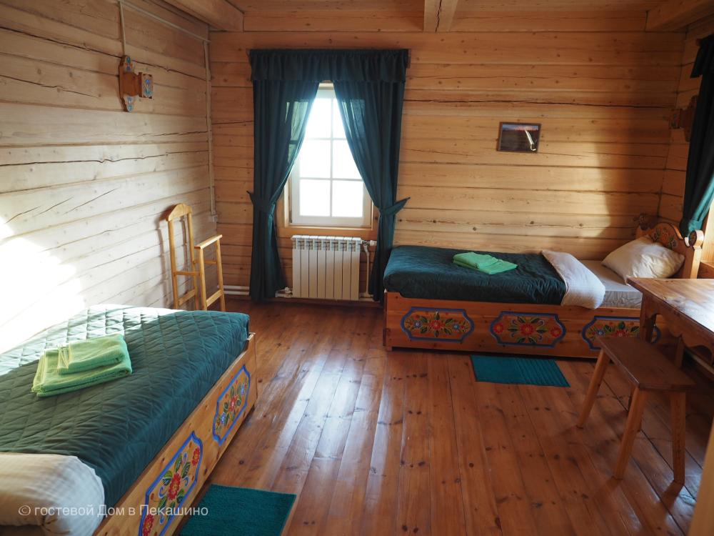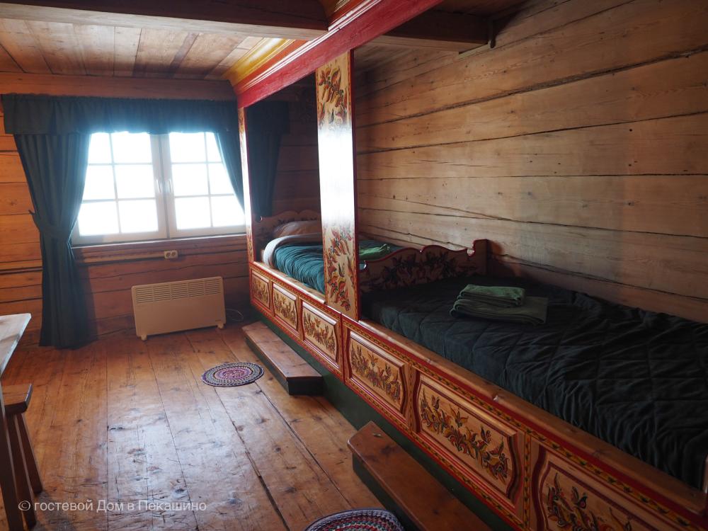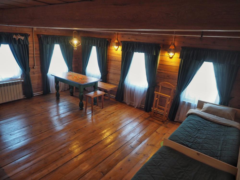 Комната в более молодой части здания. 1 комната; 2 одноместные расписные кровати; бесплатный WI-FI. Комплект постельного белья.Особенности: туалет и душ на этаже. Вид на улочки деревни Верколы, на старинные деревянные дома, вдалеке видна тайга.