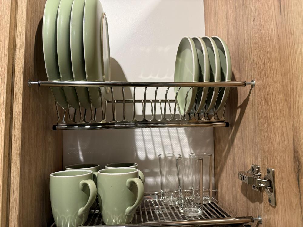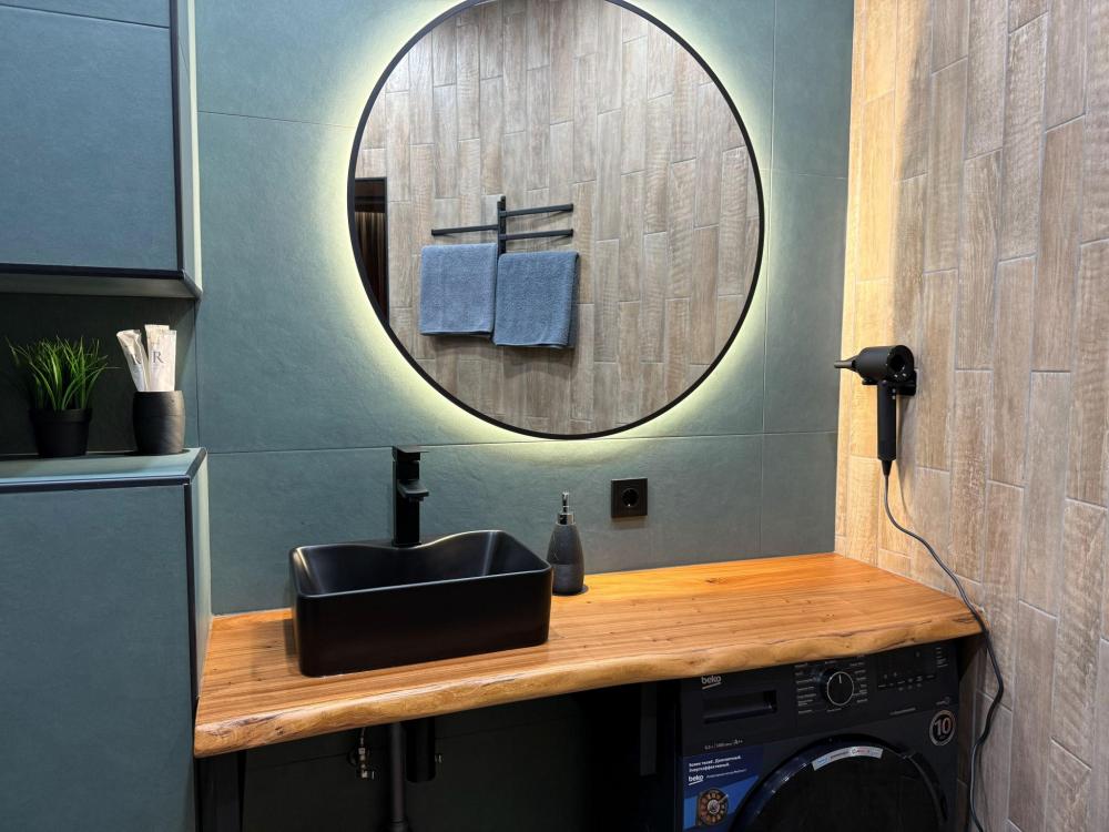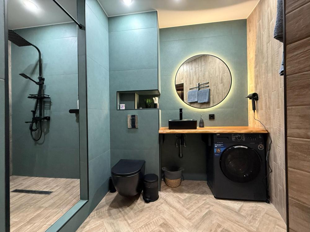 Спальные места: двуспальная кровать, раскладной диван. Кухня оборудована необходимой посудой и техникой: плита, чайник, холодильник. К услугам гостей также стиральная машина, смарт ТВ, подписка OKKO, Wi-Fi, кондиционер, кофемашина, гигиенические принадлежности, полотенца, постельное белье.
