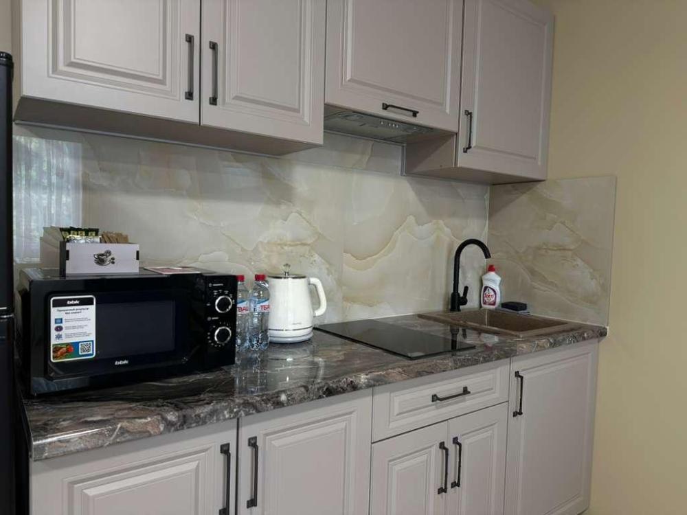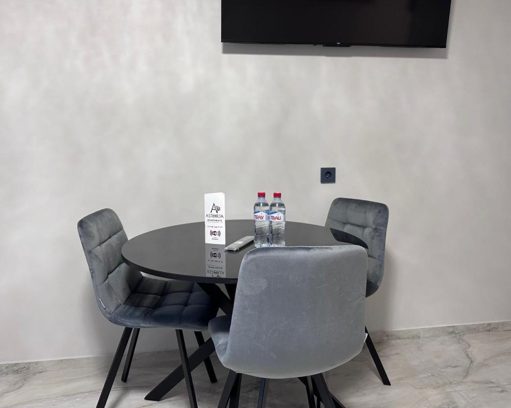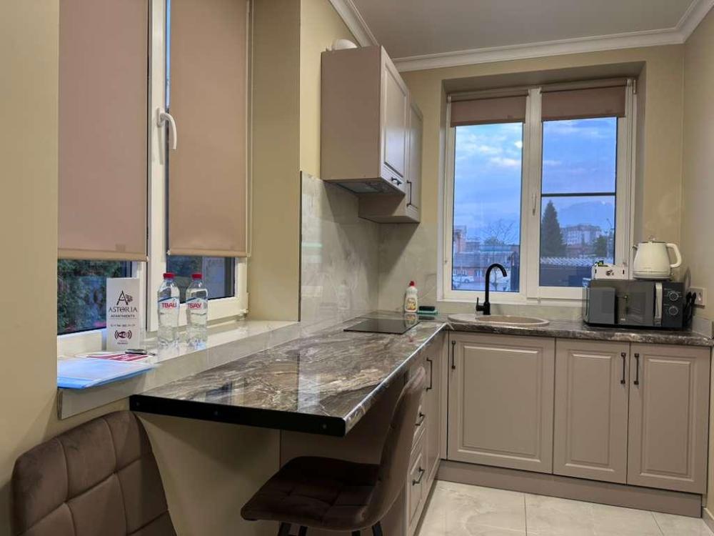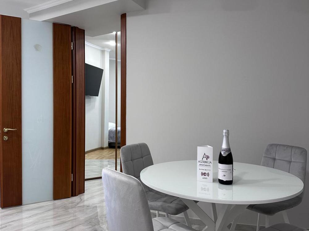 Апартаменты "Astoria" выполнены в пастельных бежевых и серых тонах с дизайнерским ремонтом. Светлые оттенки наполняют пространство особым уютом и шармом. Апартаменты укомплектованы всем необходимым для комфортного отдыха, так например в каждом апартаменте есть кухонная зона, укомплектованная всем необходимым для самоcтоятельного приготовления пищи, ванной комнатой со всей необходимой сантехникой, гигиеническими средствами, одноразовыми тапочками с халатом, феном и зеркалом. Cама студия оснащена двухместной кроватью с ортопедическим матрасом, а также раскладным двухместным диваном, шкафом для одежды и мебели, стиральной машиной, утюгом, сушилкой для белья, обеденным столиком и стульями, кондиционером, телевизором с выходом в интернет и кабельными каналами. Кроме того, апартаменты могут порадовать приятными мелочами, такими как чайные наборы для уютных вечеров.