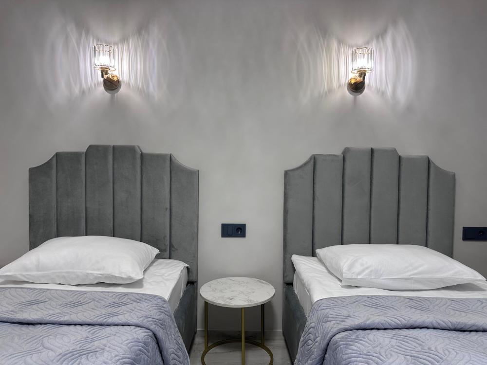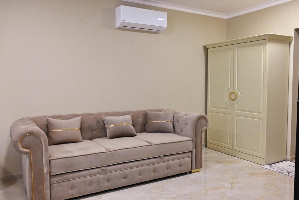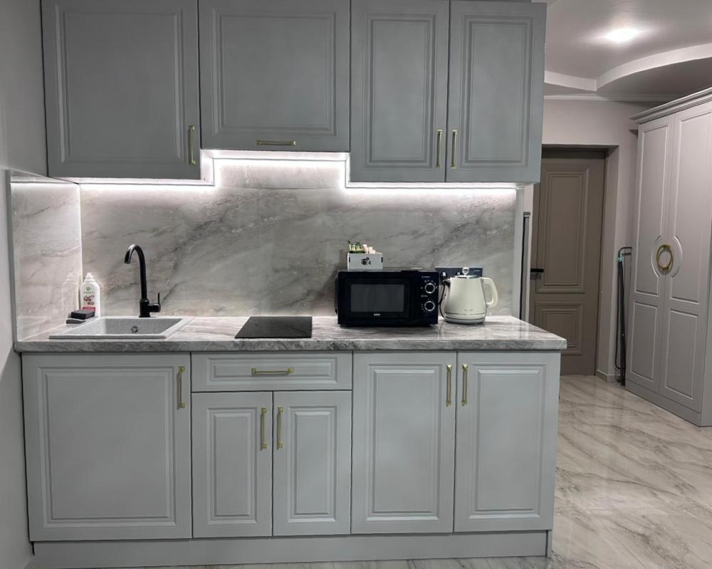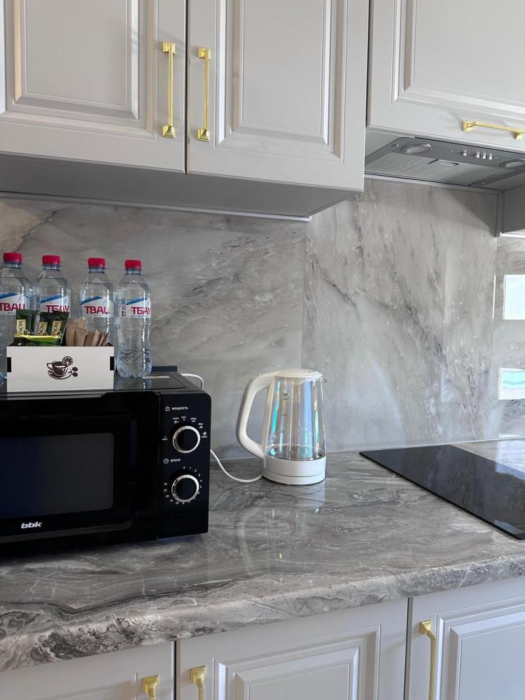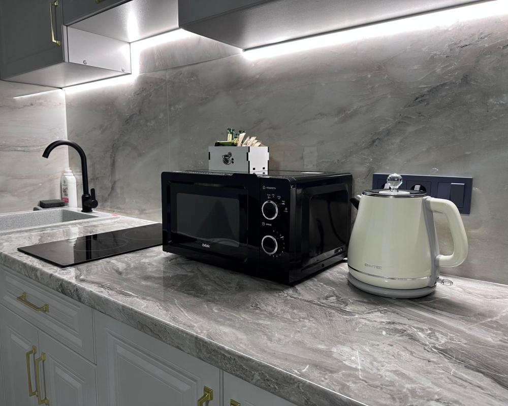 Апартаменты "Astoria" выполнены в пастельных бежевых и серых тонах с дизайнерским ремонтом. Светлые оттенки наполняют пространство особым уютом и шармом. Апартаменты укомплектованы всем необходимым для комфортного отдыха, так например в каждом апартаменте есть кухонная зона, укомплектованная всем необходимым для самоcтоятельного приготовления пищи, ванной комнатой со всей необходимой сантехникой, гигиеническими средствами, одноразовыми тапочками с халатом, феном и зеркалом. Cама студия оснащена двухместной кроватью с ортопедическим матрасом, а также раскладным двухместным диваном, шкафом для одежды и мебели, стиральной машиной, утюгом, сушилкой для белья, обеденным столиком и стульями, кондиционером, телевизором с выходом в интернет и кабельными каналами. Кроме того, апартаменты могут порадовать приятными мелочами, такими как чайные наборы для уютных вечеров.