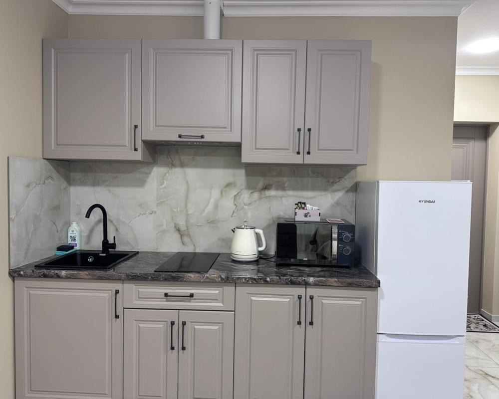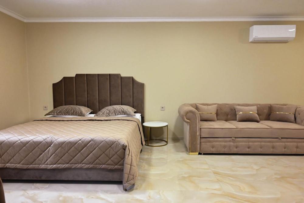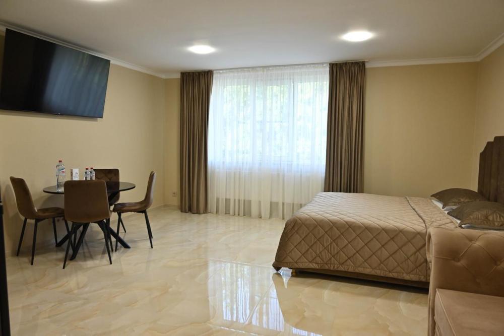 Современные апартаменты, находящиеся на втором этаже и позволяющие наслаждаться видом на горы. Светлые оттенки наполняют пространство особым уютом и шармом. Апартаменты укомплектованы всем необходимым для комфортного отдыха, так, например, в каждом номере есть кухонная зона, предназначенная для самоcтоятельного приготовления пищи, ванной комнатой со всей необходимой сантехникой, гигиеническими средствами, одноразовыми тапочками с халатом, феном и зеркалом. Cама студия оснащена двухместной кроватью с ортопедическим матрасом, а также раскладным двухместным диваном, шкафом для одежды, холодильником, стиральной машиной, утюгом, сушилкой для белья, обеденным столиком и стульями, кондиционером, телевизором с выходом в интернет и кабельными каналами. Кроме того, апартаменты могут порадовать приятными мелочами, такими как чайные наборы для уютных вечеров. Также на территории отеля расположена чудесная парковая зона с выходом к реке. К услугам гостей: теннисные корты, конные прогулки, баня, мангальная зона.