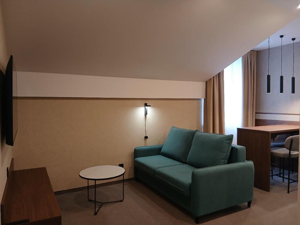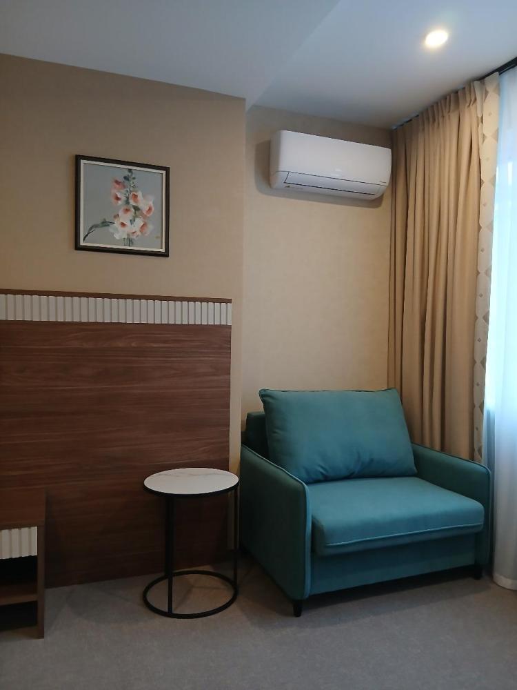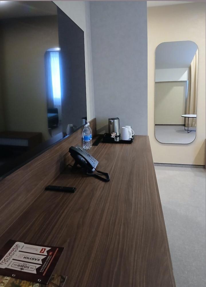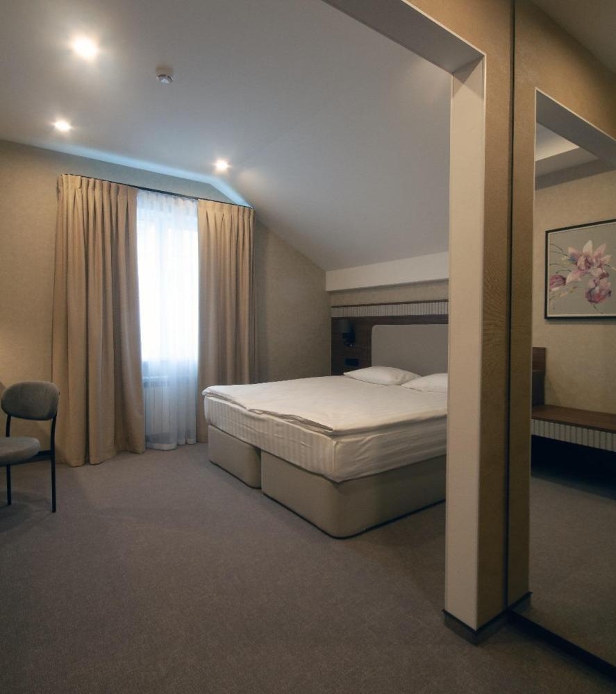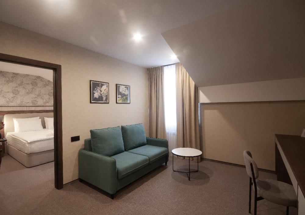 Уютный, двухкомнатный номер с двуспальной кроватью, гостиной и мягкой мебелью для комфортного размещения двух человек. В номере есть все, что может понадобиться для комфортного отдыха: Удобная двуспальная кровать. Прикроватные тумбочки. Туалетный столик с зеркалом. Стол-тумба с большим телевизором (более 70 каналов). Мягкая кожаная мебель Телефон, который можно использовать для внутренней связи. Бесплатный Wi-Fi. Холодильник. Кондиционер. Чайный набор (чайник, чашки, пакетированный чай) Шкаф для одежды с вешалками. Полка для багажа. Полка для обуви и обувной набор. Ковролиновое покрытие. USB-розетка. Прикроватное освещение для чтения. Гладильная доска и утюг (по запросу). Санузел: Ванна. Биде. Фен. Комплект туалетных принадлежностей: мыло, гель для душа, шампунь, шапочка для душа, зубной набор. Полотенца.