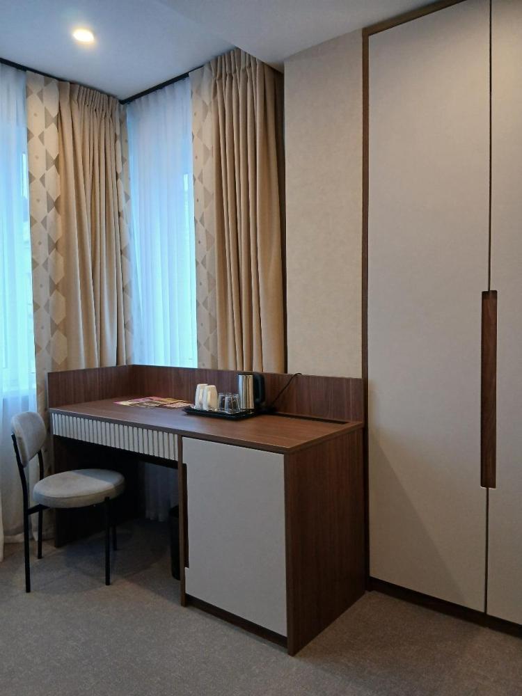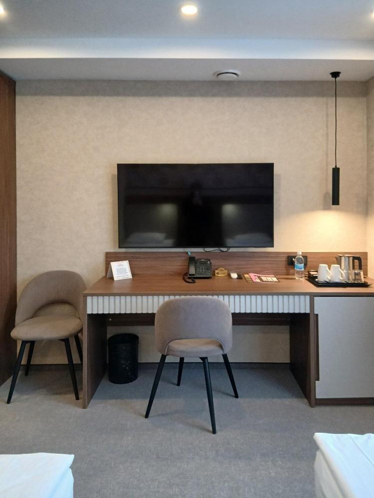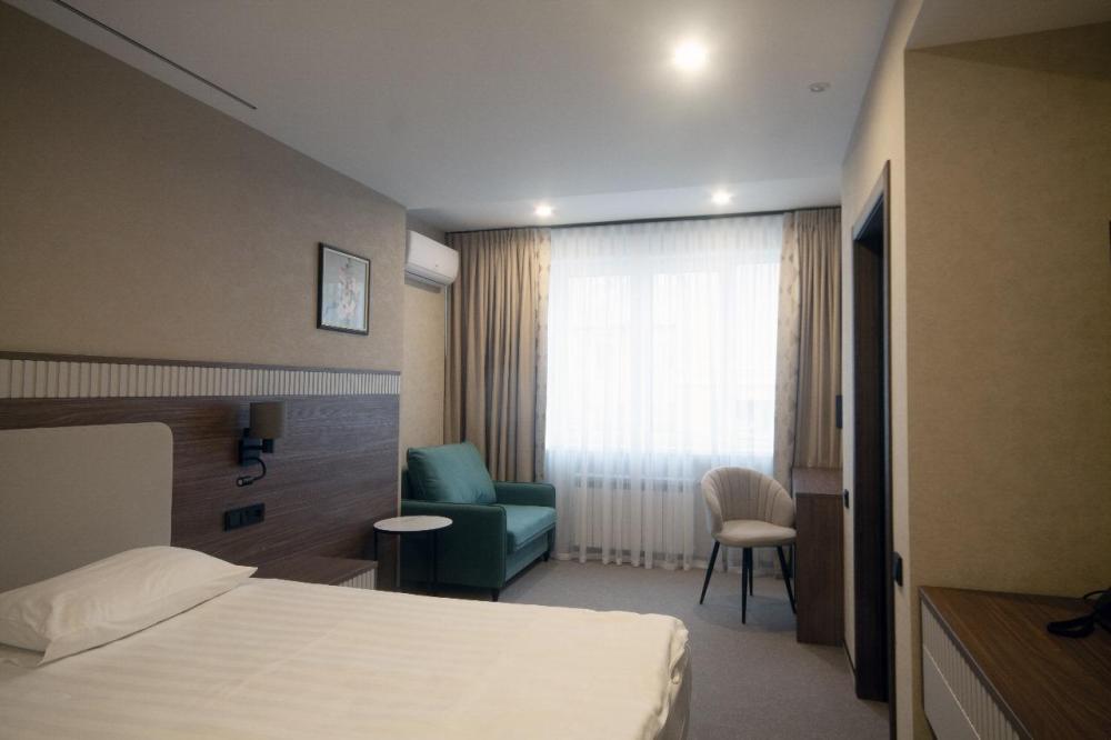 Уютный номер с двуспальной кроватью, прикроватными тумбочками и мягкой мебелью для размещения двух человек. В номере есть все, что может понадобиться для комфортного отдыха: Удобная двуспальная кровать. Прикроватные тумбочки. Туалетный столик с зеркалом. Стол-тумба с большим телевизором (более 70 каналов). Мягкая кожаная мебель Телефон, который можно использовать для внутренней связи. Бесплатный Wi-Fi. Холодильник. Кондиционер. Чайный набор (чайник, чашки, пакетированный чай) Шкаф для одежды с вешалками. Полка для багажа. Полка для обуви и обувной набор. Ковролиновое покрытие. USB-розетка. Прикроватное освещение для чтения. Гладильная доска и утюг (по запросу). Санузел: Ванна. Биде. Фен. Комплект туалетных принадлежностей: мыло, гель для душа, шампунь, шапочка для душа, зубной набор. Полотенца.