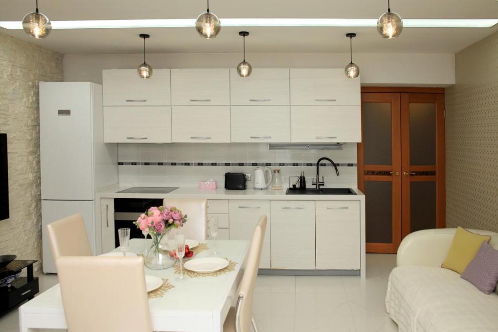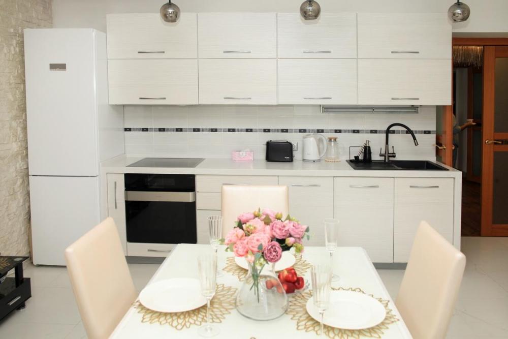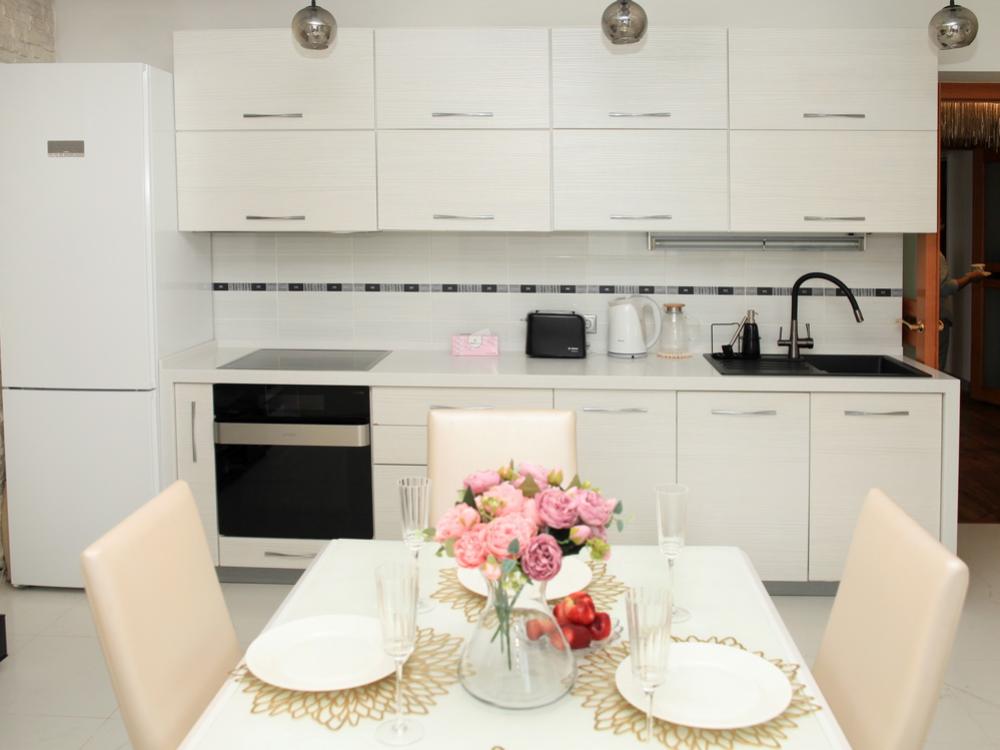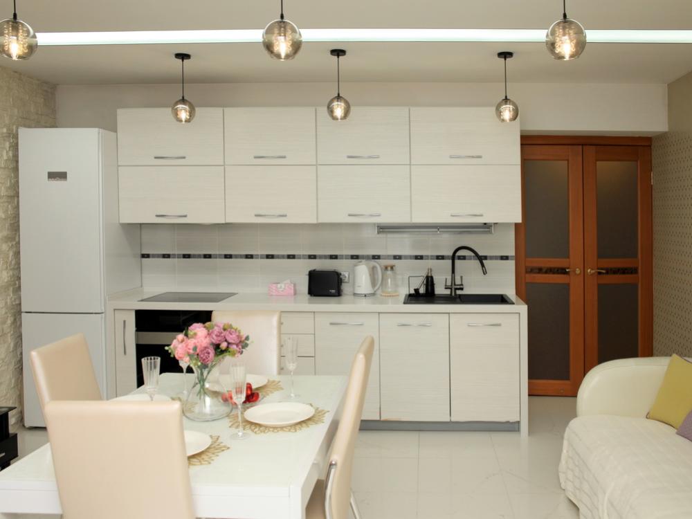 Полностью оборудованная кухня (холодильник, плита, микроволновка, посудомойка, чайник, посуда)