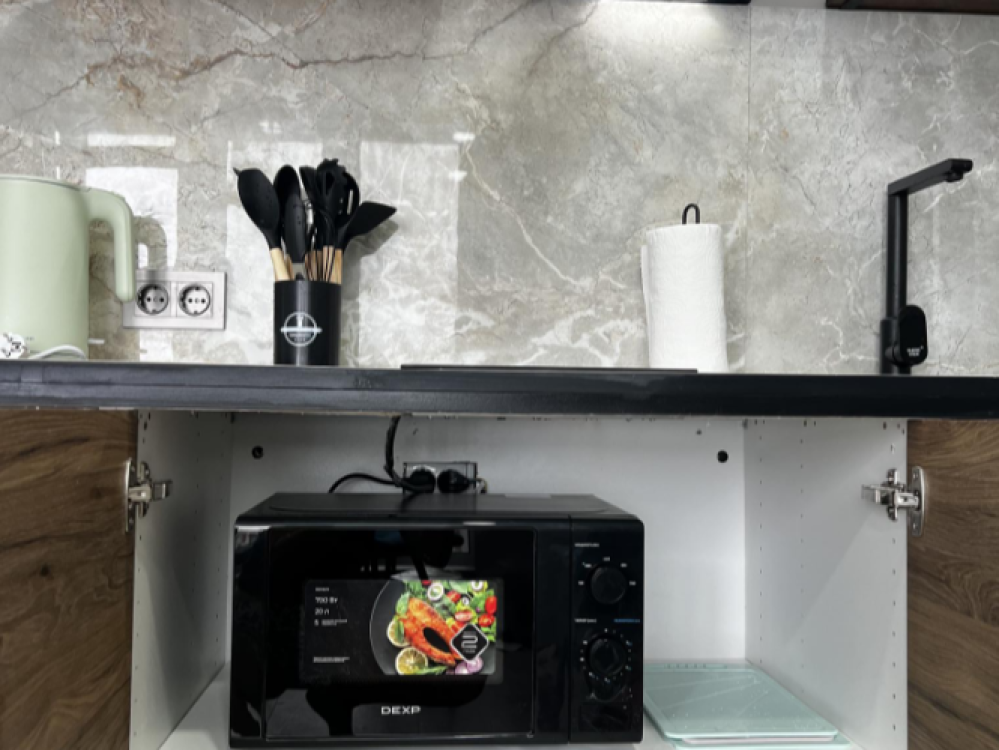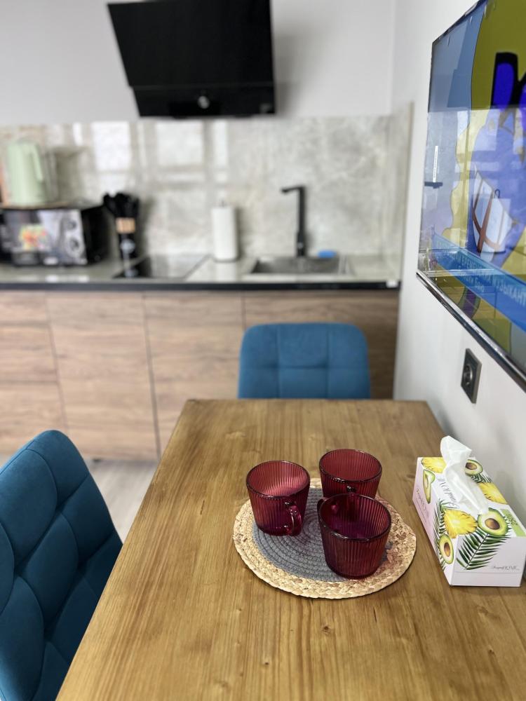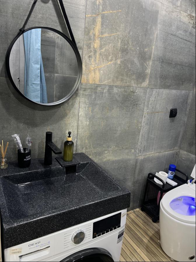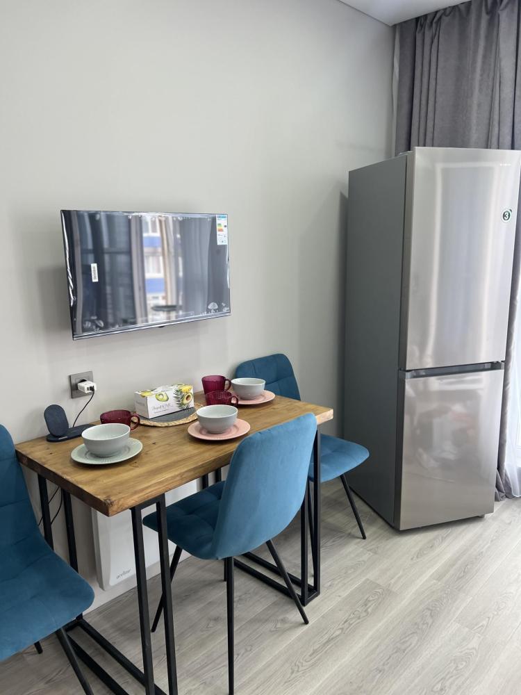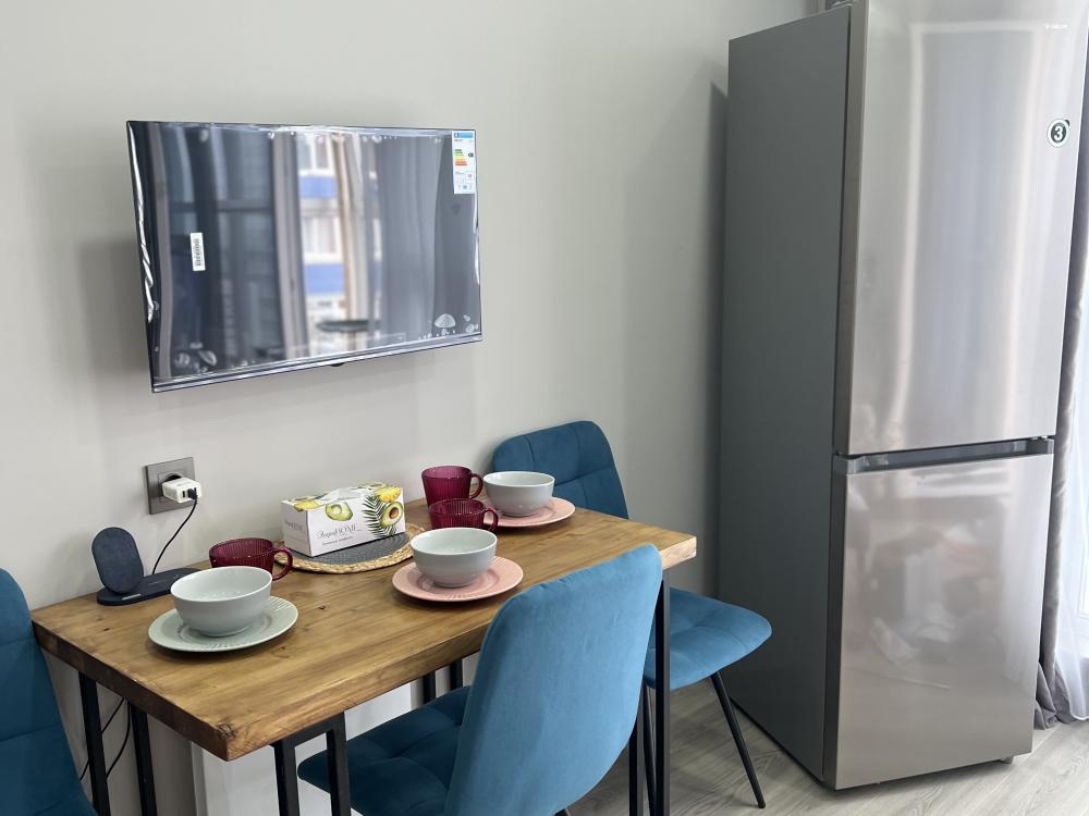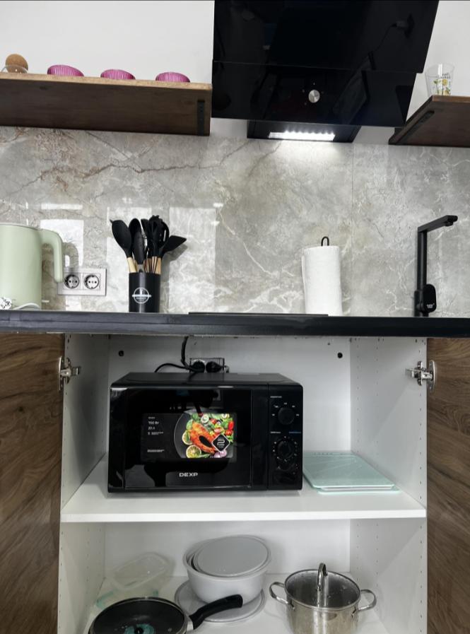 Квартира оснащена всем необходимым для комфортного проживания гостей. Имеется кухня с посудой и бытовой техникой, в ванной установлена стирально-сушильная машина, температурный режим в квартире поддерживают теплые полы и стены, кондиционер, конвекторы. Бытовая техника: SMART Телевизор, микроволновая печь, пылесос, утюг, фен, большой вместительный холодильник.