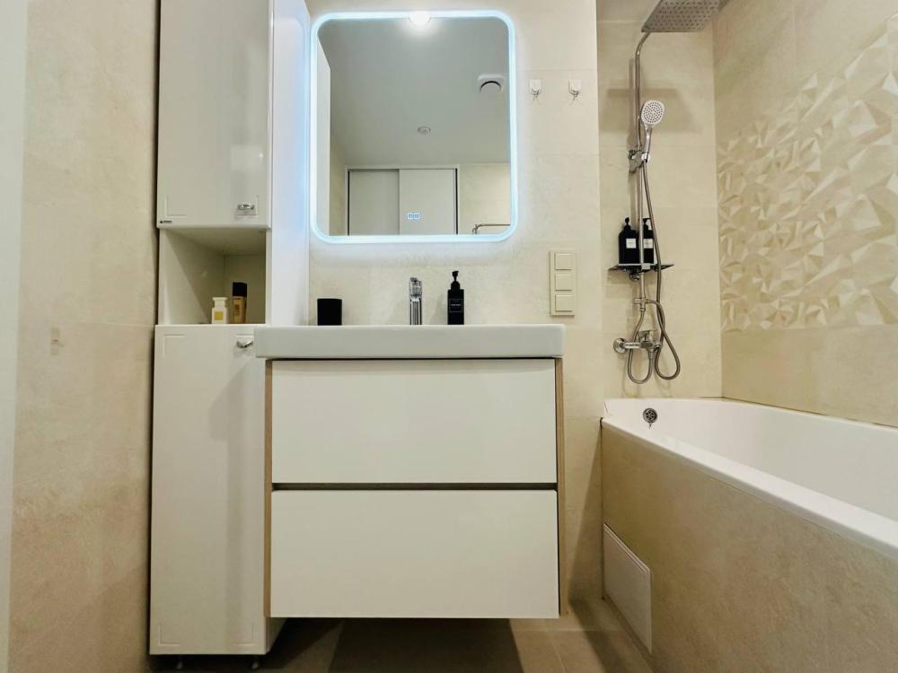 Двухкомнатные апартаменты с дизайнерским ремонтом и прекрасным видом на море для 4 гостей, с изолированной спальней с отдельной гардеробной и просторной кухней-гостиной. Спальные места: диван и двуспальная кровать. В квартире находится все для комфортного проживания 4х гостей: посуда, столовые приборы, чайник, варочная поверхность, духовой шкаф, стиральная машина, кондиционер, фен, утюг.