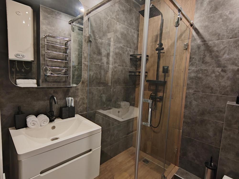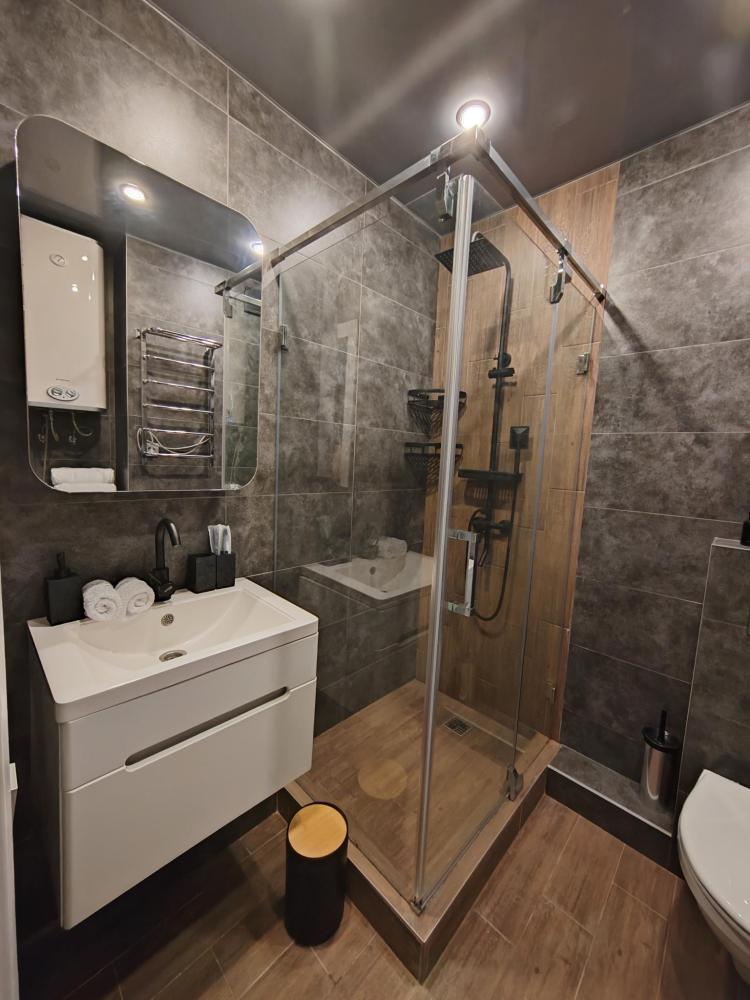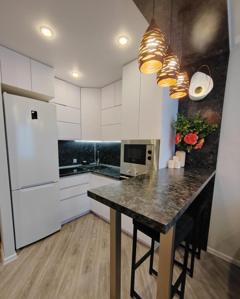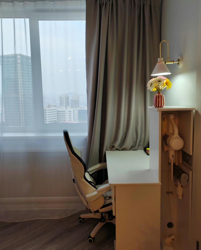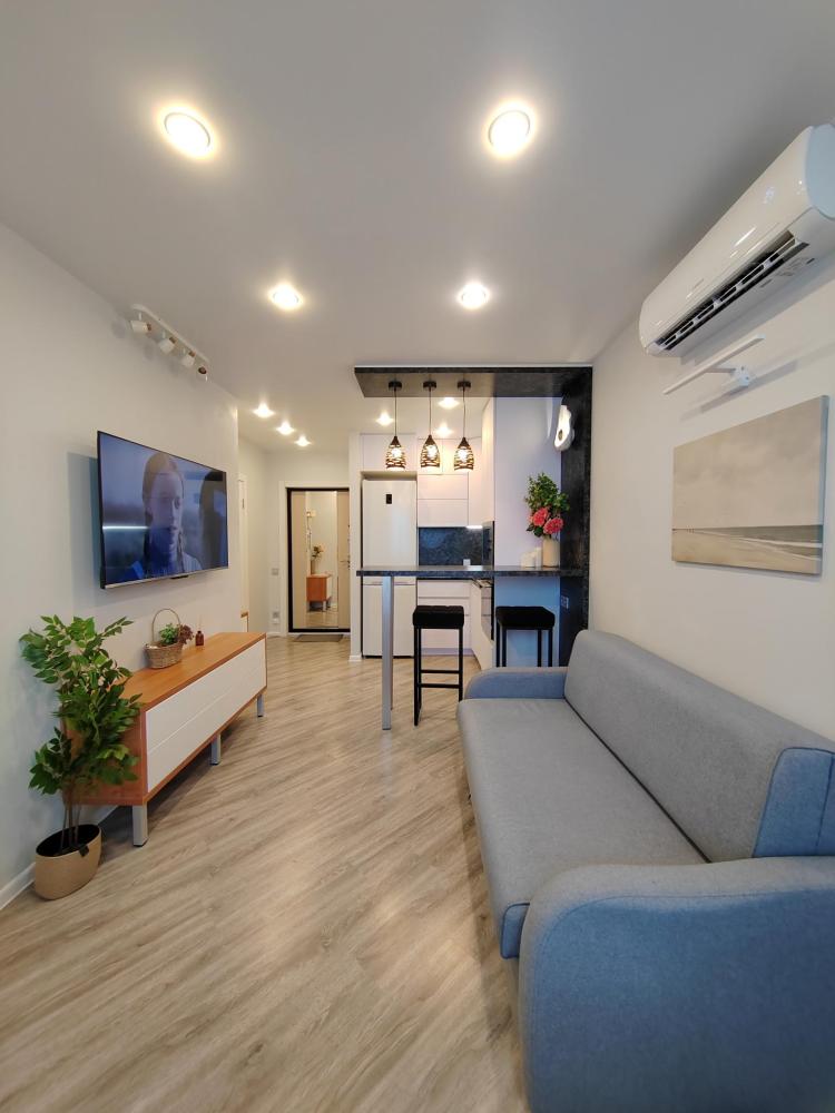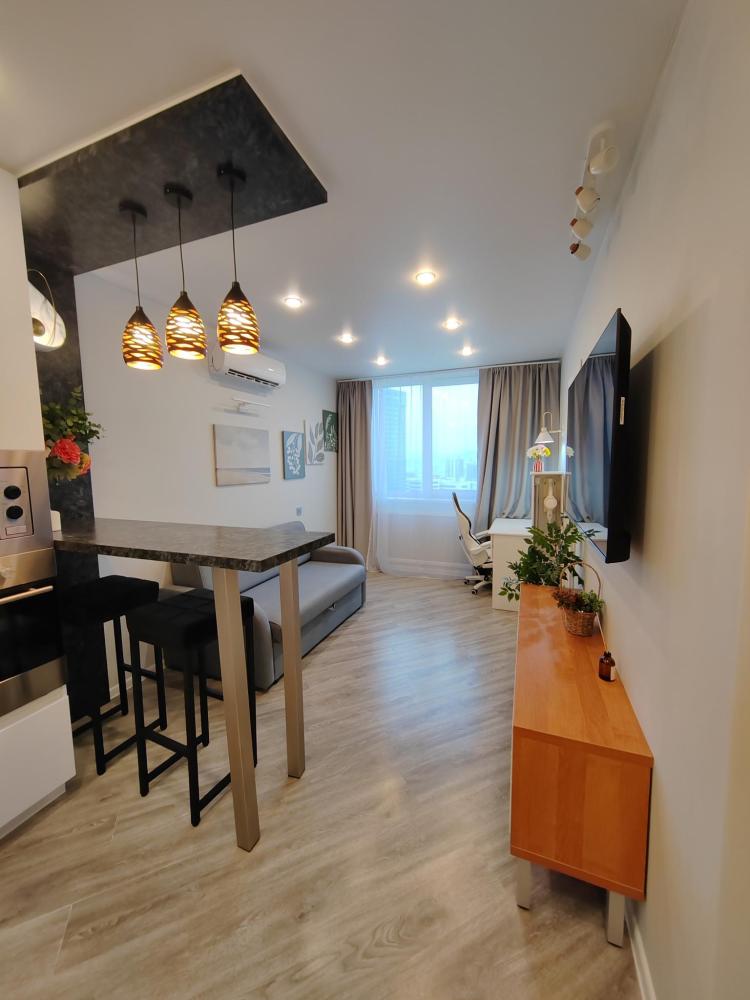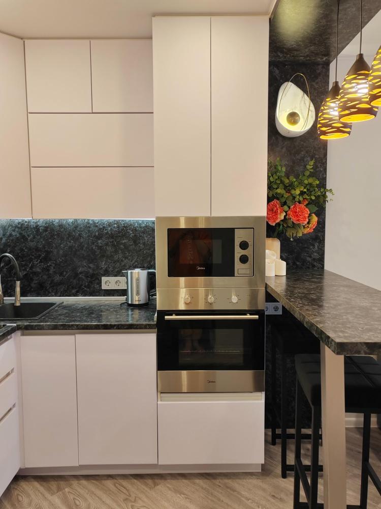 Уютные апартаменты, оборудованные всем необходимым для комфортного проживания. Удобная мебель и все необходимые бытовые приборы (фен, утюг, гладильная доска, стиральная машина, сушка для белья, тёплые полы в ванной и спальне). Двуспальная кровать 160х200, полутораспальный диван 140х200, рабочий стол с набором канцелярии, Wi-Fi, телевизор (онлайн-кинотеатры Кинопоиск, Flex), кондиционер. Кухня полностью оборудована для приготовления пищи (микроволновая печь, духовой шкаф, посудомойка, холодильник с морозильной камерой), также предоставляется чай, кофе, сахар, соль, специи, масло для жарки, лёд. Для гостей предусмотрены зонты на случай непогоды. Аптечка с лекарствами для оказания первой помощи. На лоджии есть электрокамин, а также полки с различными настольными играми, книгами и раскрасками для детей и взрослых.