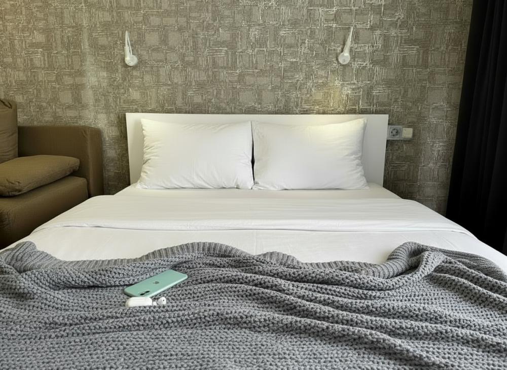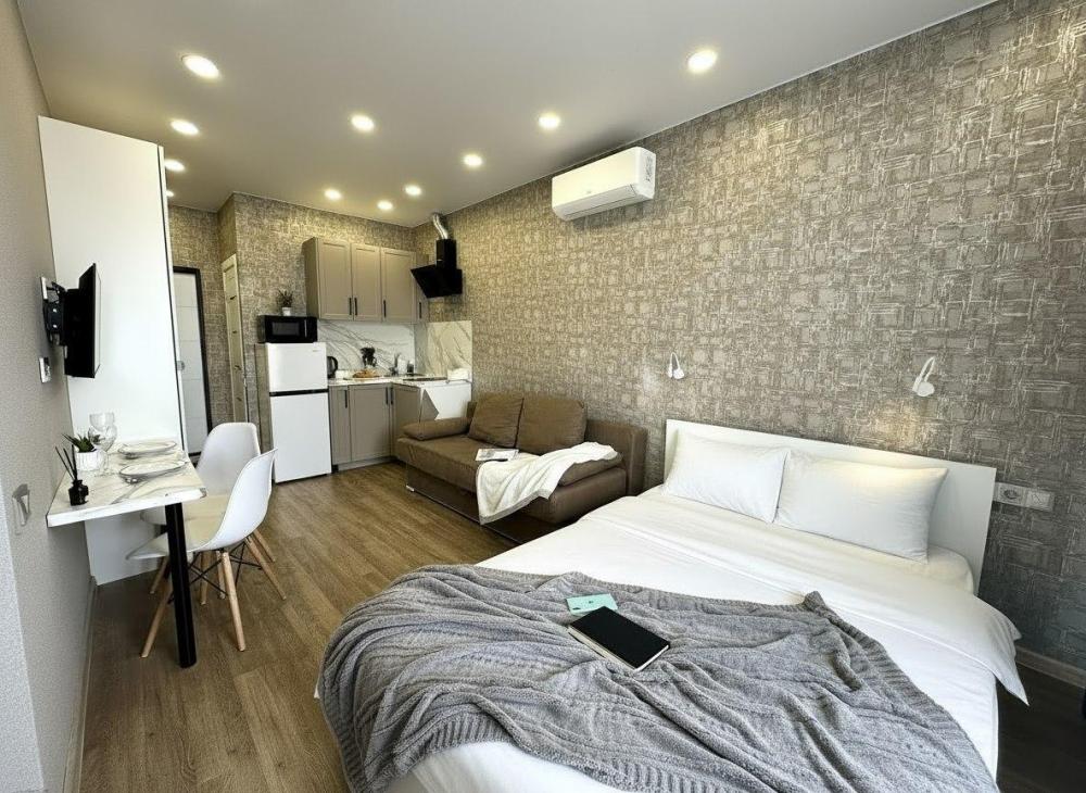 Апартаменты студия для 3 гостей. Спальные места: кресло-кровать и двуспальная кровать. В квартире находятся средства личной гигиены, фен, интернет (wi-fi), цифровое тв,постельные принадлежности, полотенца, стиральная машина, утюг, гладильная доска, мыло, шампунь, чай, сахар, сушка для белья. Бытовая техника: вытяжка, кондиционер, микроволновая печь, стеклокерамическая плита, стиральная машина, титан, телевизор,холодильник, чайник, фен, утюг, теплый пол.