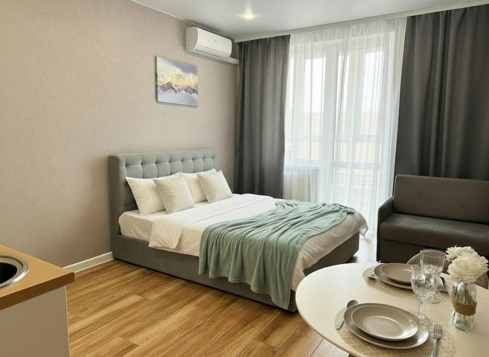 Аренда студии посуточно ?️ Удобства квартиры: ✔️ двуспальная кровать ✔️ обеденный стол/рабочее место; ✔️ шкаф; ✔️ постельное белье и полотенца; ✔️ кондиционер; ✔️ кухня со всем необходимым для приготовления пищи; ✔️ беспроводной интернет и телевизор с плоским экраном; ✔️ стиральная машина; ✔️ шампунь, т.бумага, жидкое мыло, ср.для мытья посуды; ✔️ фен; ✔️ утюг и гладильная доска; ✔️ бесплатная уборка и смена белья раз в 5-7 дней! ? Благоустройство придомовой территории: ✔️ новый ЖК с охраняемой территорией; ✔️ консьерж; ✔️ холл с современным ремонтом; ✔️ современная детская площадка вдали от проезжей части; ✔️ есть платная и бесплатная парковки; ✔️ на территории ЖК, в соседнем доме пиццерия и отличная кофейня. ? В пешей доступности: - в 150 метрах продуктовый супермаркет; - аптека в 5 минутах езды; - рядом авторынок “Зелёный угол” в 10-15 минутax ходьбы. ? Условия заселения: ✔️ заселение круглосуточно ✔️ заселение с 14-00 ✔️ выезд до 12, в некоторых случая готовы обсуждать индивидуальные условия выезда и въезда, эти пожелания нужно уточнять при подтверждения бронирования ✔️ бронирование доступно для лиц старше 21 лет, при заселении необходим паспорт для договора.