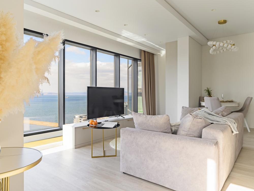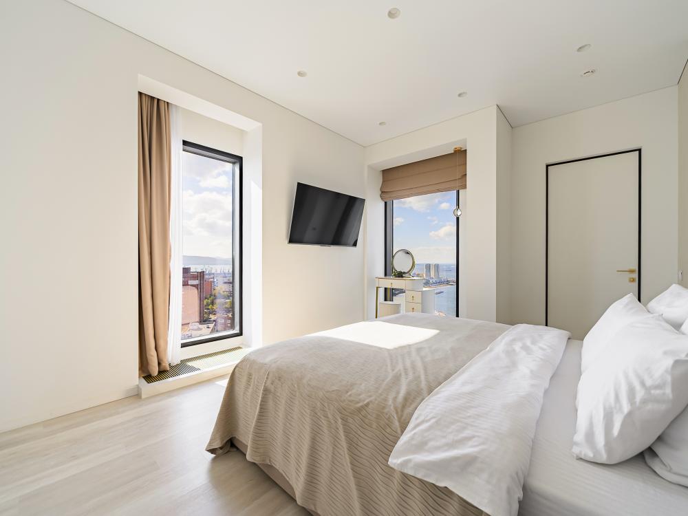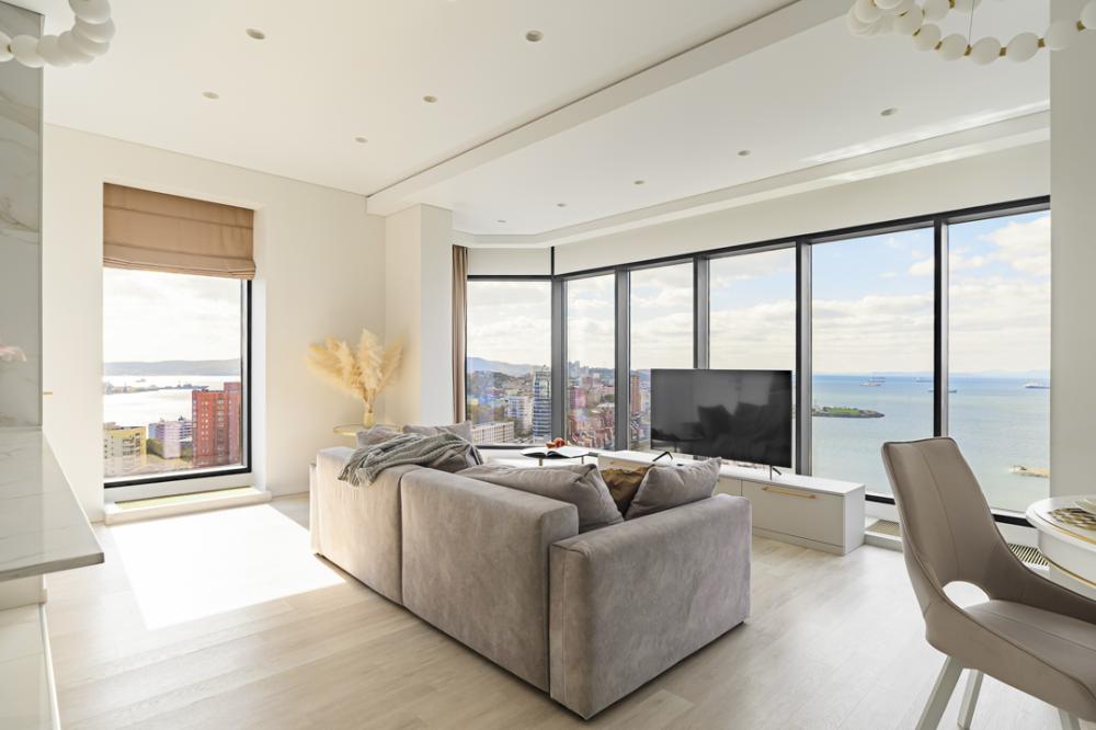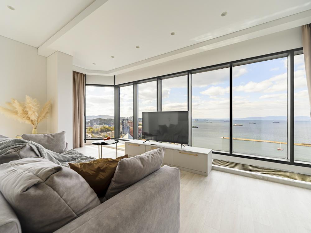 Апартаменты элит-класса с видом на море и Золотой мост в центре Владивостока! Просторная двухкомнатная квартира на 21 этаже в ЖК Аквамарин, 78 кв.м, терраса на крыше дома. 4 спальных мест: 2+2 (двуспальная кровать + двуспальный диван). В квартире современный лаконичный дизайн и огромные панорамные окна с завораживающим видом. Удобства в квартире: * Высокоскоростной Wi-Fi * Смарт ТВ на телевизорах * Система кондиционирования * Большое джакузи для 2-х человек * Мини-сауна с душевой кабиной