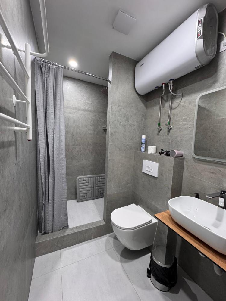 В номере: три односпальные кровати, прикроватные тумбы, стол, стулья, чайник. В ванной комнате: душевая кабина, туалет, раковина.