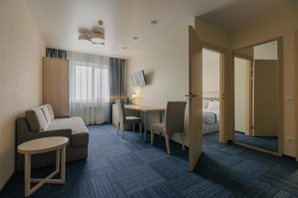 Превосходный двухкомнатный номер с гостиной и спальней. Предоставляется холодильник, 2 ЖК-телевизора, бесплатный Wi-Fi и кровать-transformer King-size, которую можно разделить на 2 полутороспальные кровати. Ценители здорового сна могут воспользоваться бесплатной услугой "Меню подушек", выбрав любую: "феличе", "гречишная", "хвойная", "антистресс", "латекс".