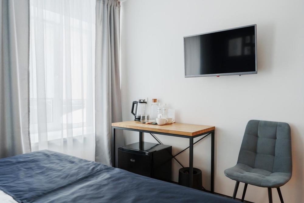 Уютный семейный номер, рассчитан на двух взрослых и одного ребенка. Номер оснащён всем необходимым. Так же номер удобен для командировочных гостей. Есть возможность сделать две раздельные кровати. В номере: Две односпальные кровати или 1 двуспальная и 1 дополнительное место для ребенка, телевизор с плоским экраном, гардероб, холодильник, электрический чайник, чай, сладости, вода, обеденный стол, кондиционер, гладильные принадлежности, рабочий стол, вешалка для одежды. Смена полотенец раз в день, смена белья раз в трое суток. В ванной комнате: туалетно-косметические принадлежности, туалет, душ, полотенца, тапочки, фен, халат, туалетная бумага.