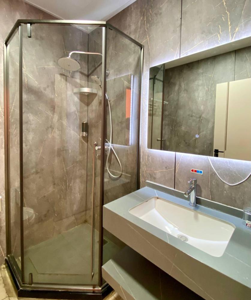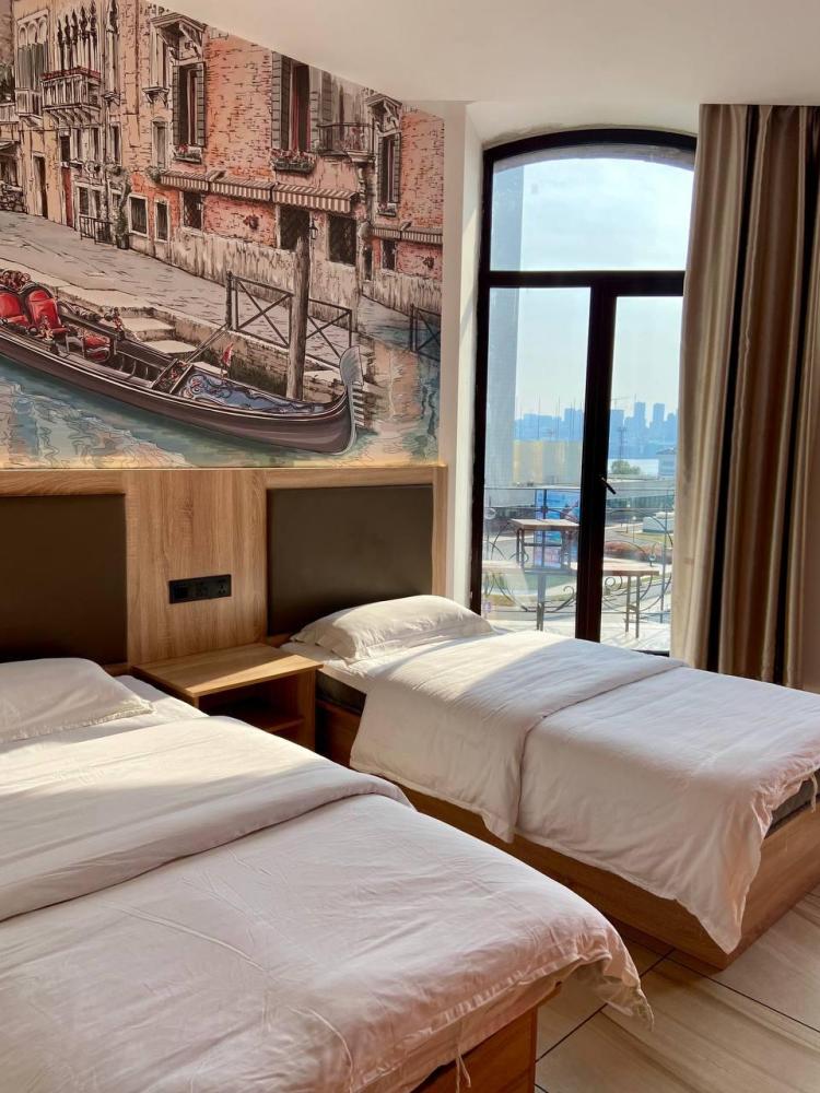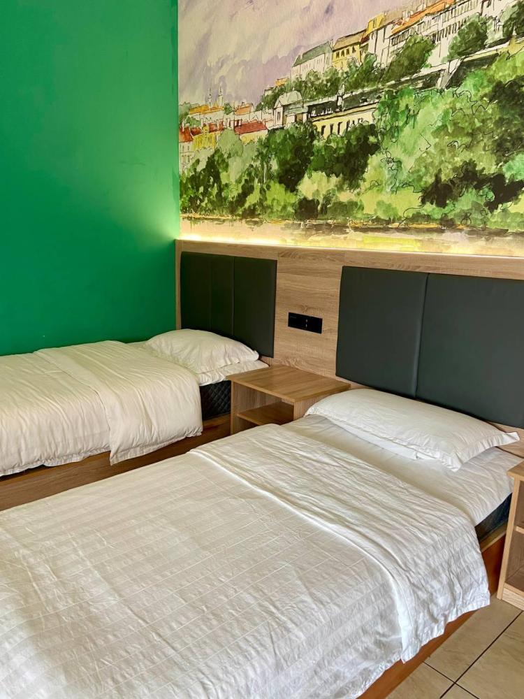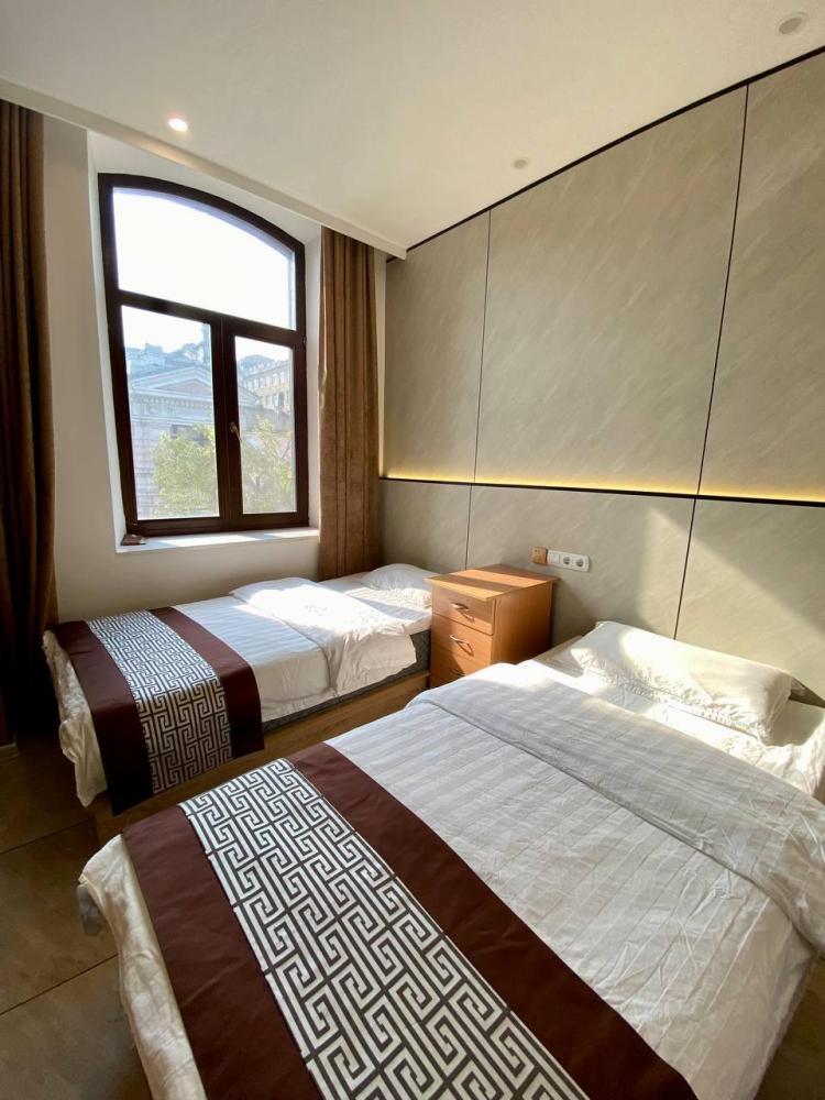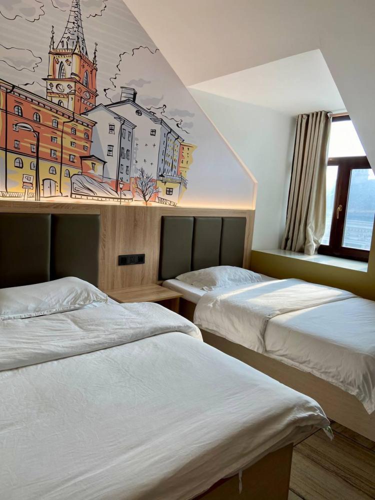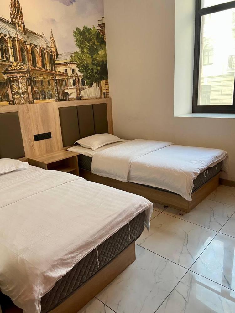 Уважаемые гости, В наличии есть несколько номеров с 1 двуспальной и 1 односпальной кроватями. Номера оборудованы спутниковым ТВ, холодильником, сейфом, рабочей зоной и собственным санузлом с душевыми принадлежностями. Вид из окна может быть на город, улицу или во двор, в зависимости от расположения номера. Дизайн каждого номера уникален. При необходимости мы готовы предоставить фото и видеообзоры забронированных вами номеров.