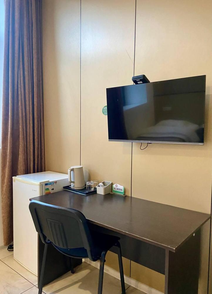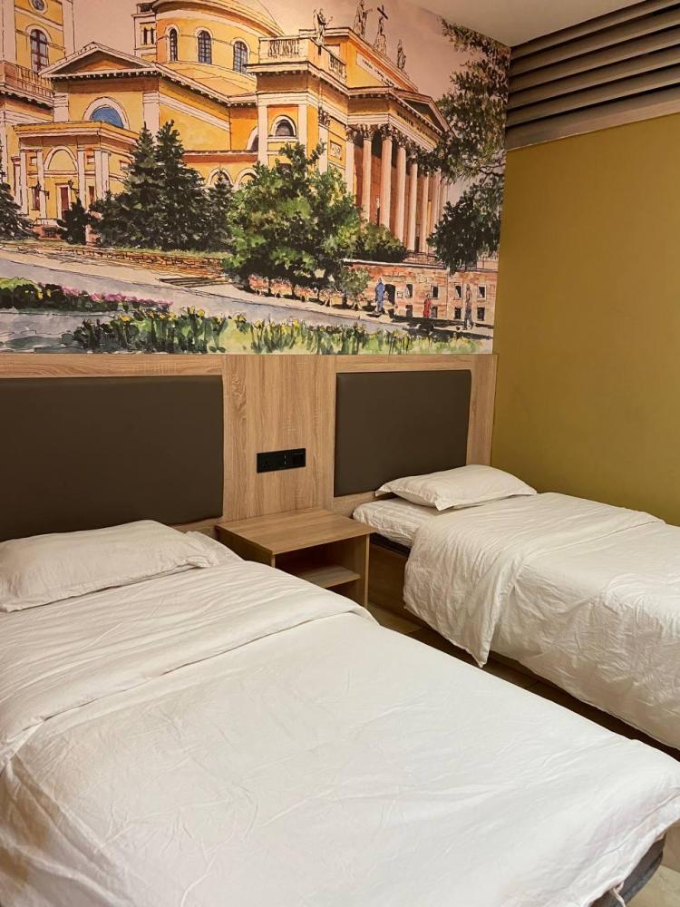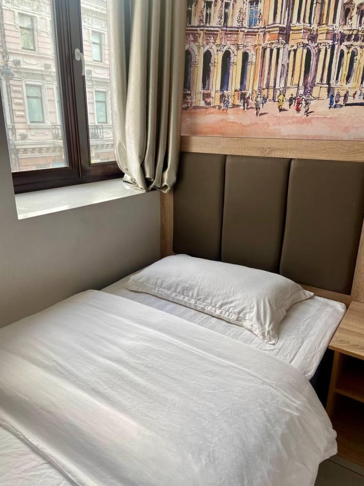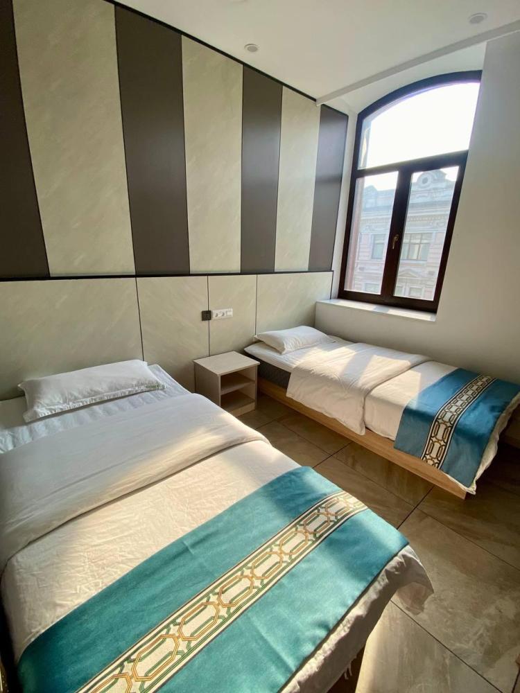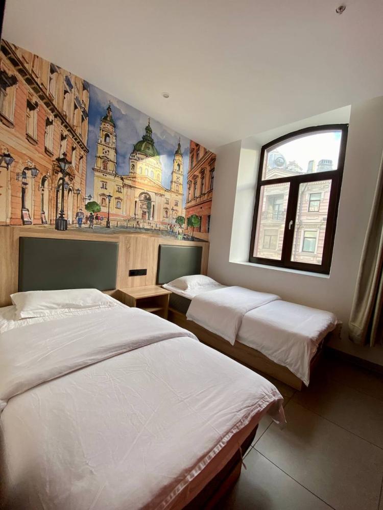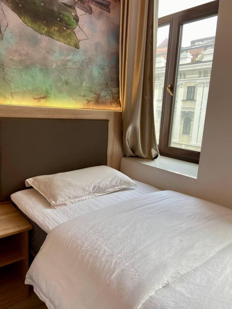 Уважаемые гости, В наличии есть несколько номеров с двумя односпальными кроватями без окна (в номере имеется форточка которая открывается в коридор или окно которое не открывается). Номера оборудованы спутниковым ТВ, холодильником, сейфом, рабочей зоной и собственным санузлом с душевыми принадлежностями. Вид из окна может быть на город, улицу или во двор, в зависимости от расположения номера. Дизайн каждого номера уникален. При необходимости мы готовы предоставить фото и видеообзоры забронированных вами номеров.
