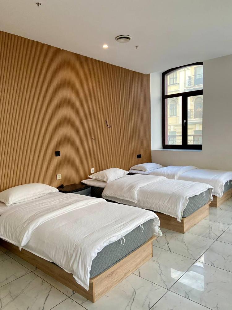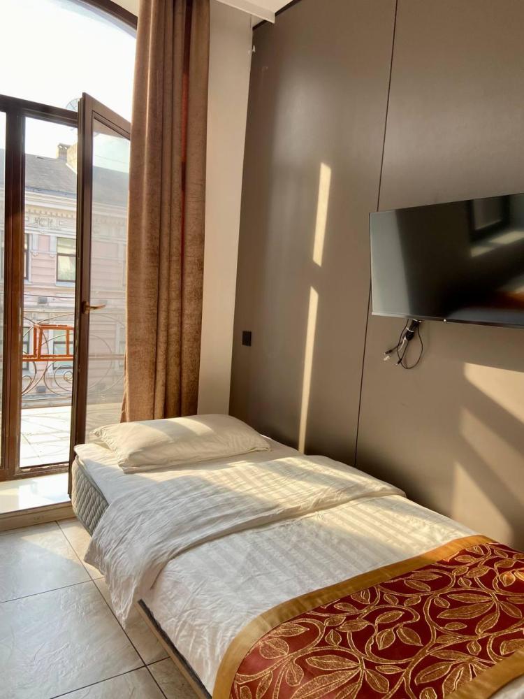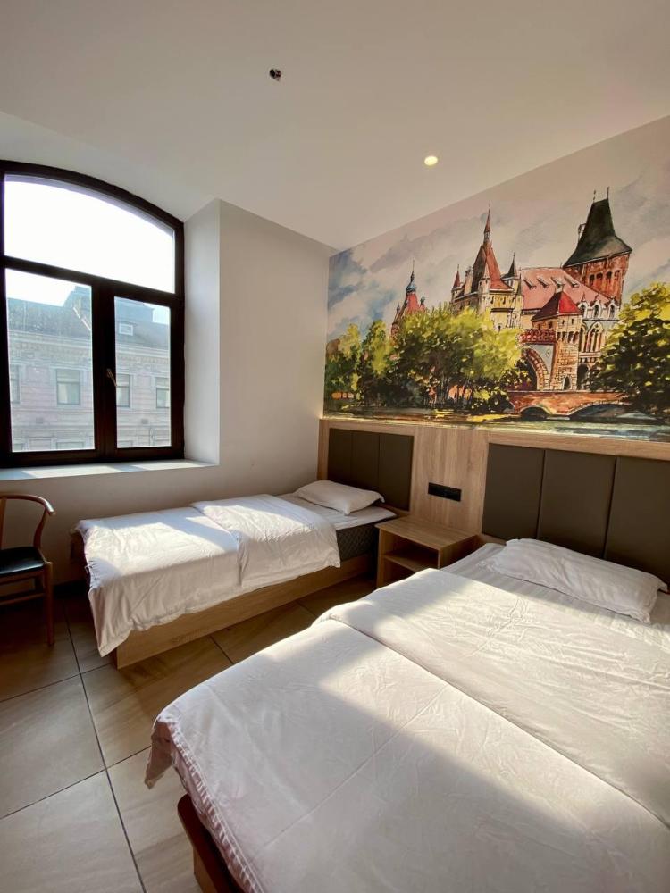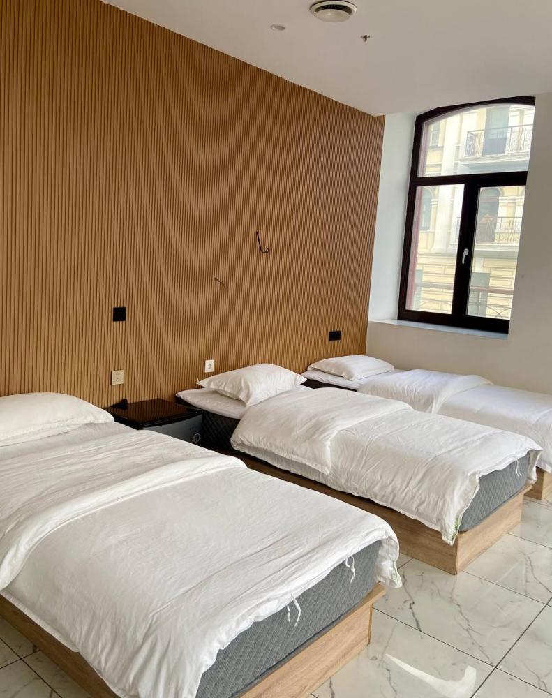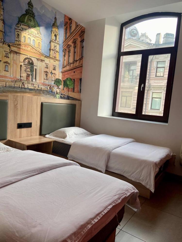 Уважаемые гости, В наличии есть несколько номеров с тремя односпальными кроватями и окном (1 двуспальная + 1 односпальная). Номера оборудованы спутниковым ТВ, холодильником, сейфом, рабочей зоной и собственным санузлом с душевыми принадлежностями. Вид из окна может быть на город, улицу или во двор, в зависимости от расположения номера. Дизайн каждого номера уникален. При необходимости мы готовы предоставить фото и видеообзоры забронированных вами номеров.